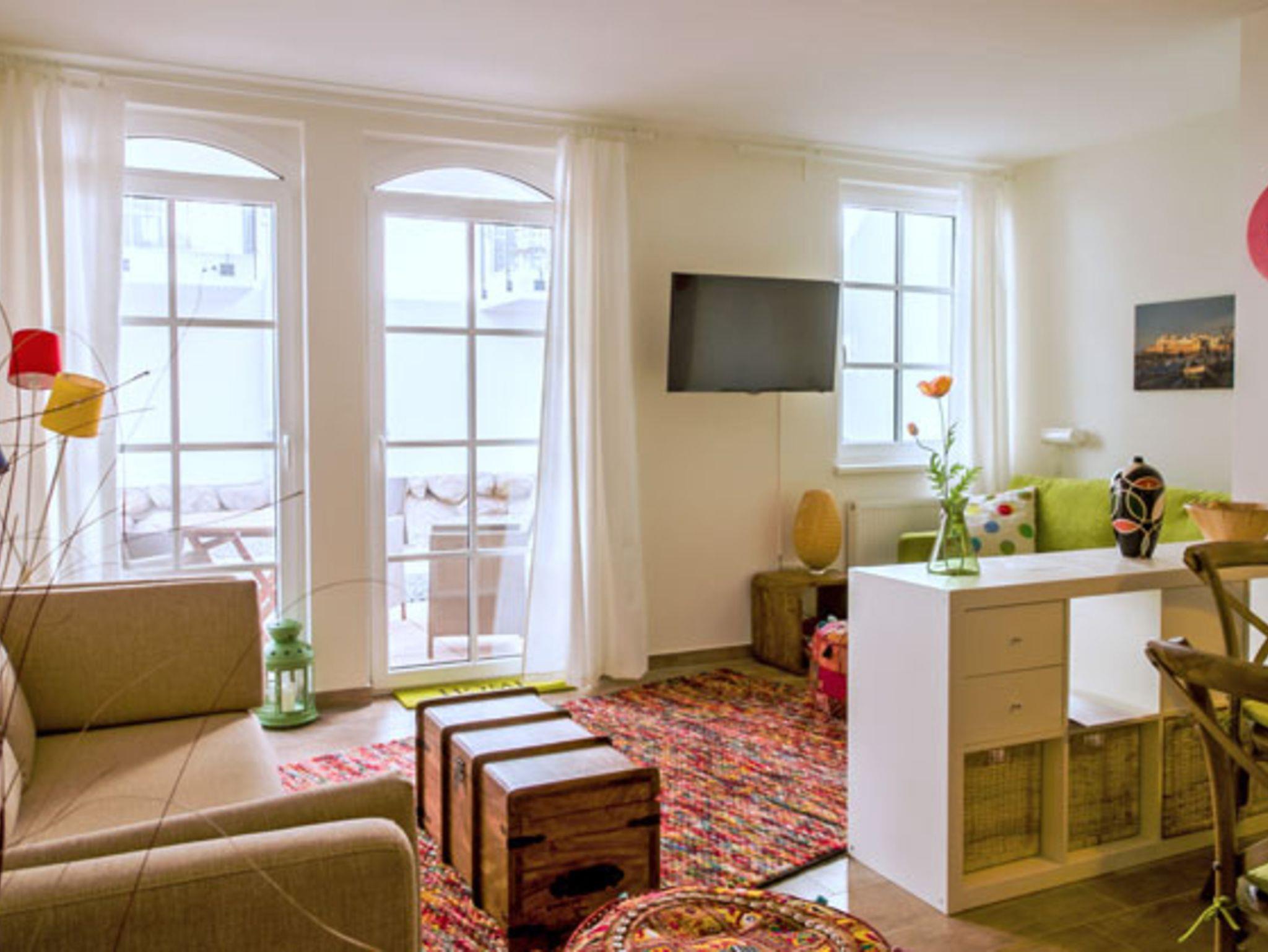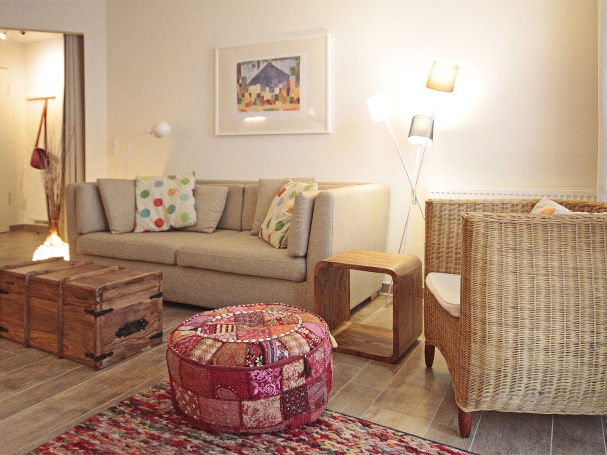 Mit ca. 50 Quadratmetern bietet die Nichtraucher-Ferienwohnung Störtebeker viel Platz für 2-4 Personen. Zwei Gäste können im Doppelbett (1,80 m x 2,00 m) des separaten Schlafzimmers übernachten, zwei weitere auf dem Schlafsofa (1,60 m x 2,20 m) in einer Nische im Wohnbereich. Da ein zweites Sofa im Haupt-Wohnbereich steht, muss das Schlafsofa nicht zwingend am Tage zurückgebaut werden. Der Bereich ist mit Radio, TV und WLAN eingerichtet.