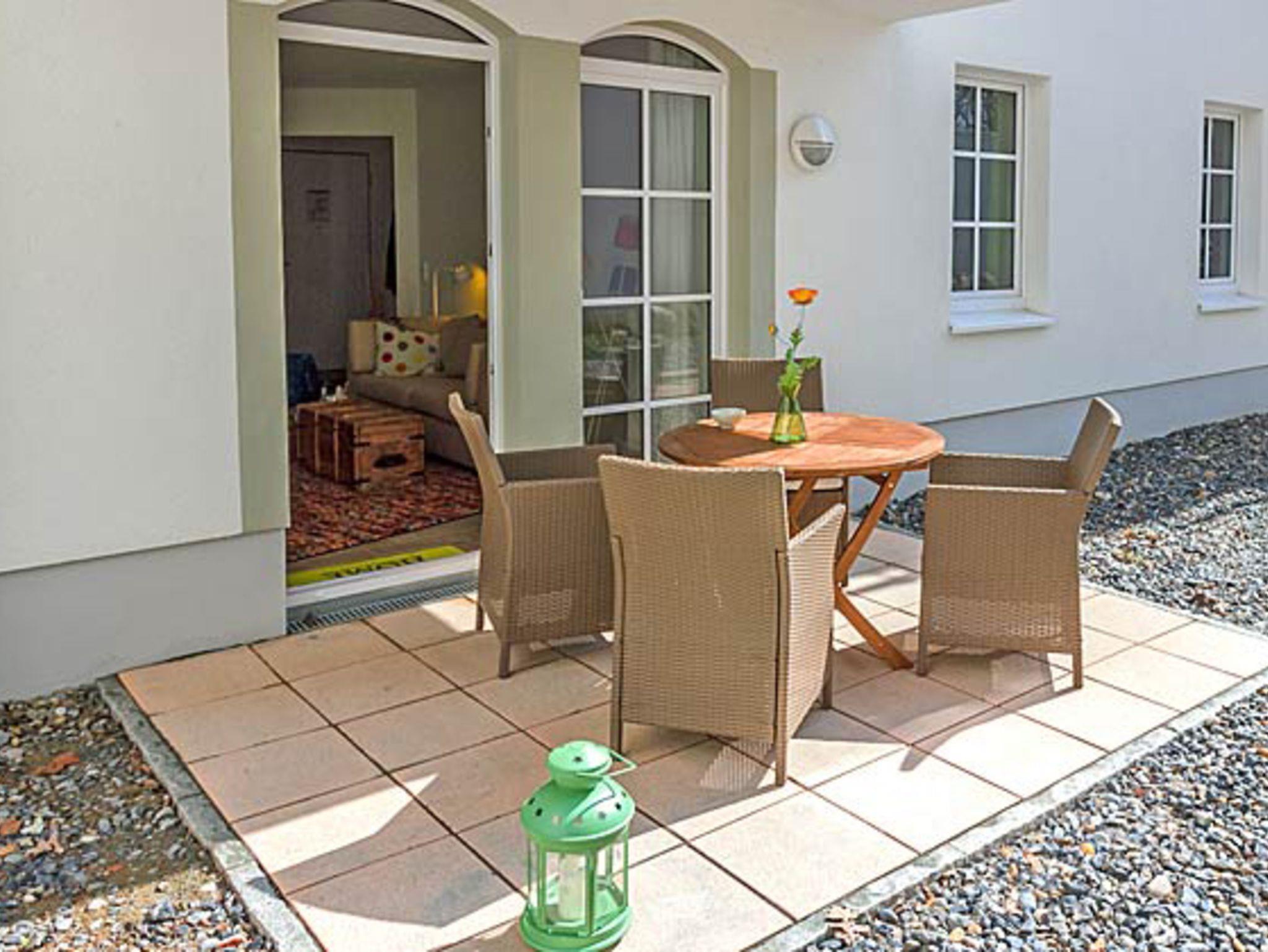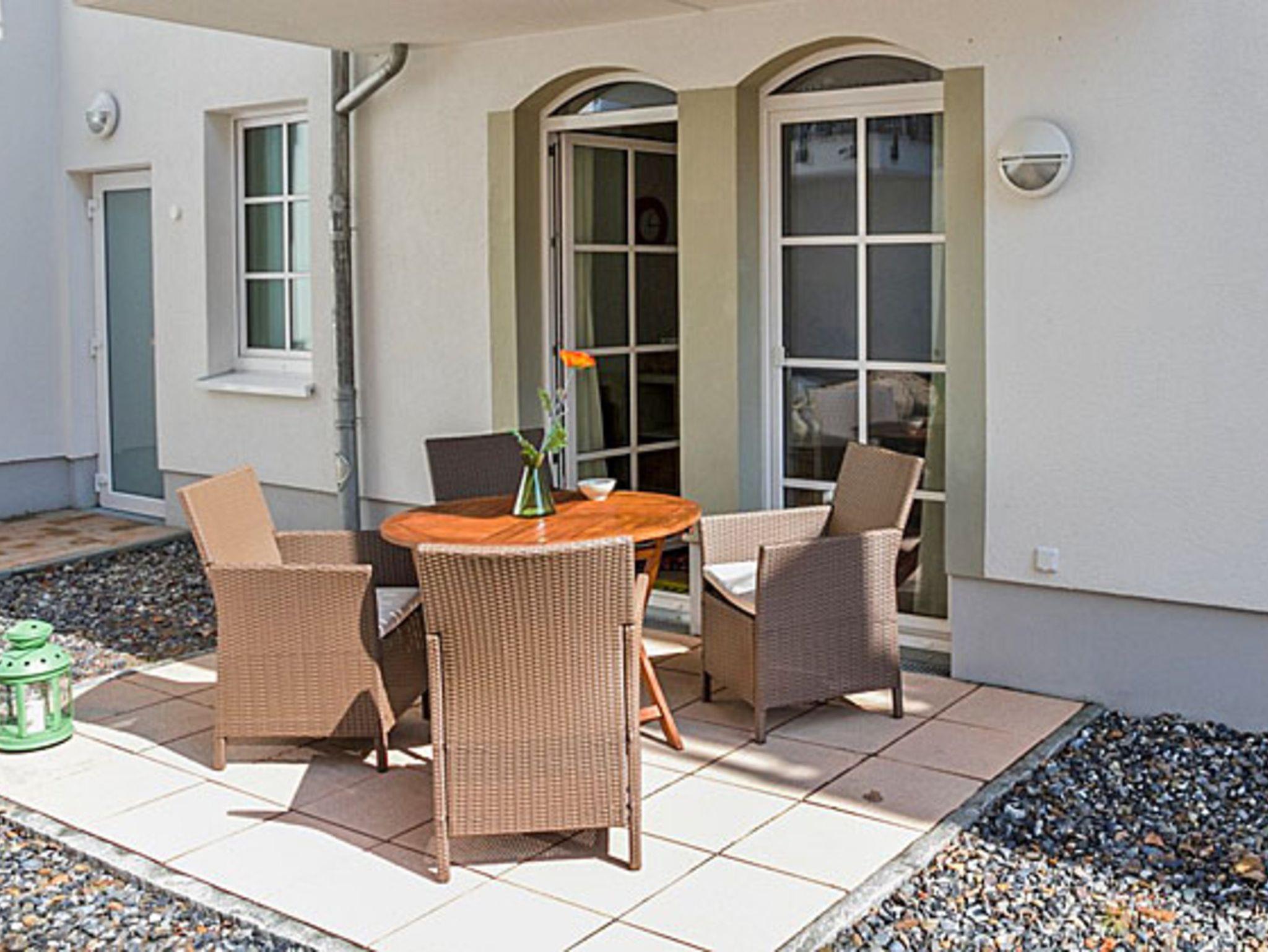 Die Terrasse, die zum Innenhof gelegen ist, ist mit vier Rattanstühlen und einem Tisch möbliert.