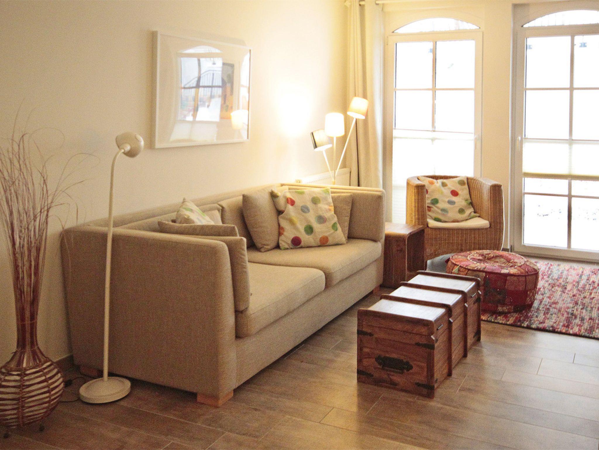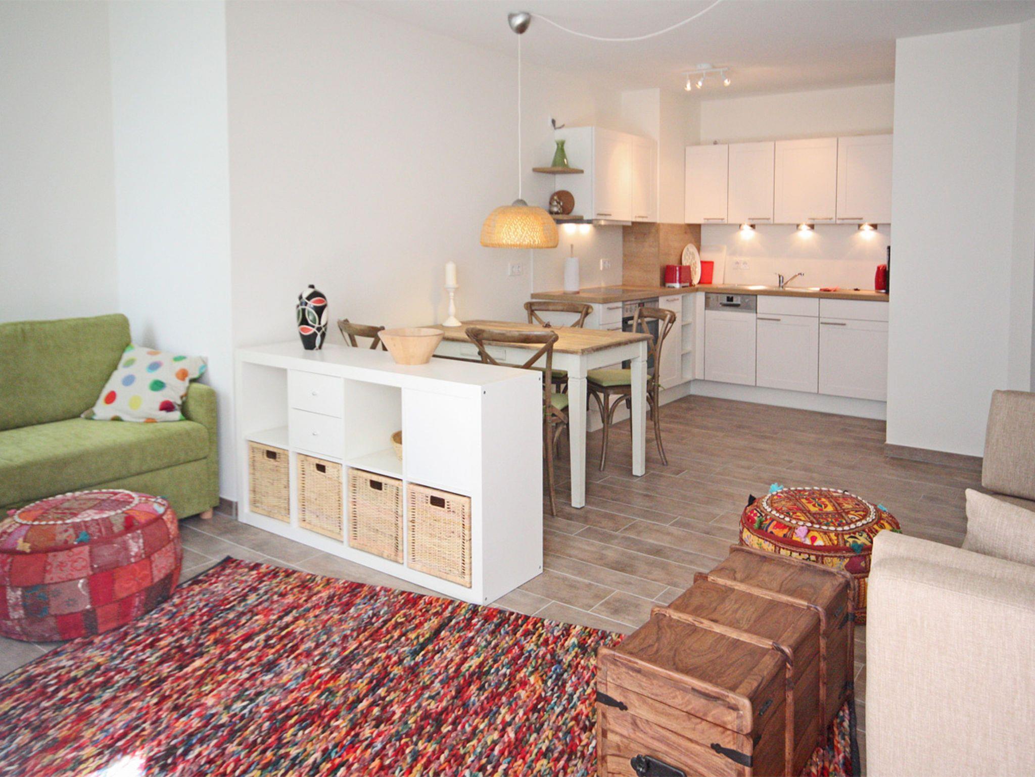 Mit ca. 50 Quadratmetern bietet die Nichtraucher-Ferienwohnung Störtebeker viel Platz für 2-4 Personen. Zwei Gäste können im Doppelbett (1,80 m x 2,00 m) des separaten Schlafzimmers übernachten, zwei weitere auf dem Schlafsofa (1,60 m x 2,20 m) in einer Nische im Wohnbereich. Weil dort ein zweites, großes Sofa extra im Wohnbereich steht, muss das Schlafsofa nicht zwingend am Tage zurückgebaut werden. Der Bereich ist mit Radio, TV und WLAN eingerichtet.