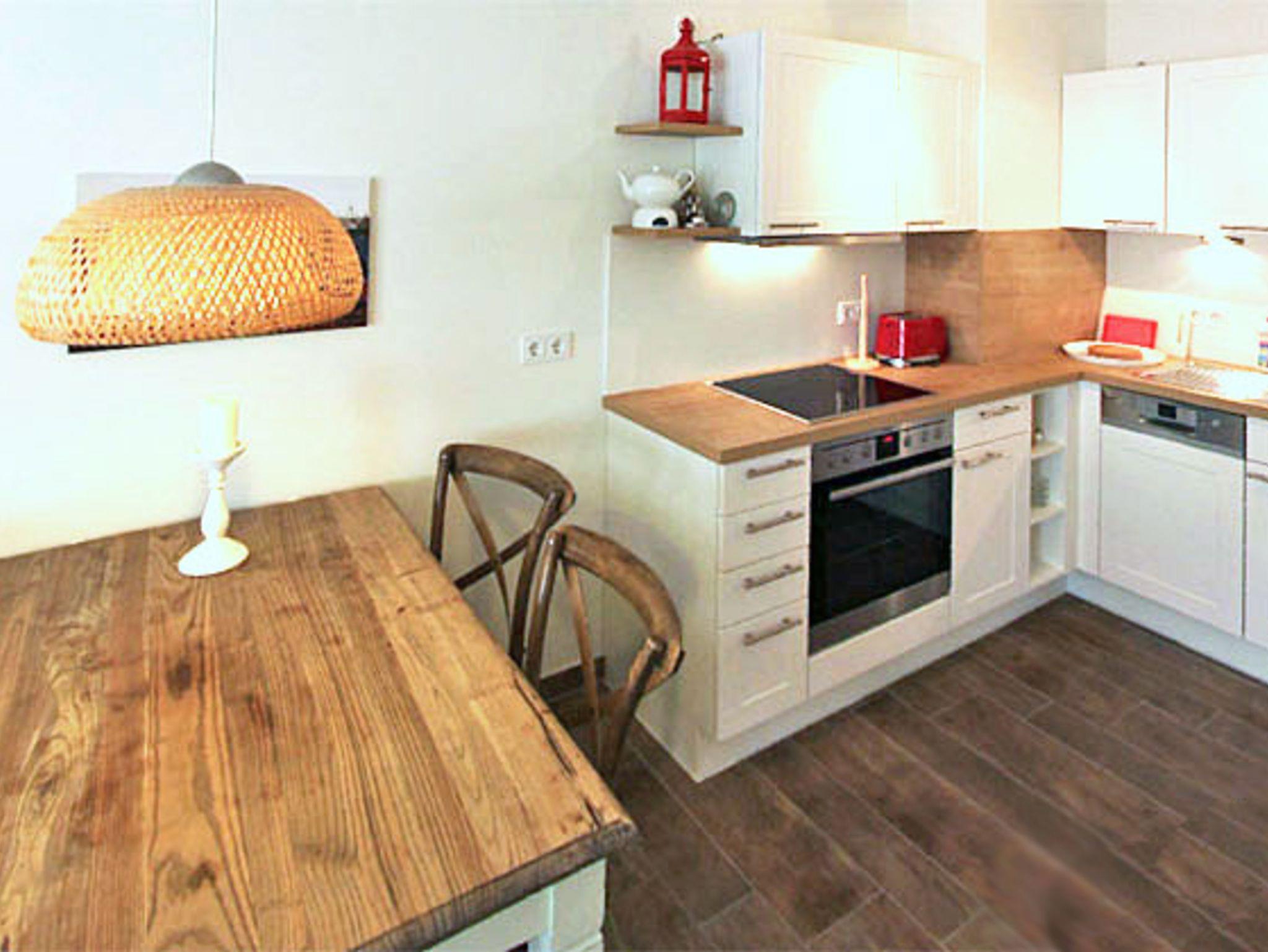 Die im Wohnraum integrierte Küchenzeile hat mit einem 4-Plattenherd (Ceranfeld) und Backofen, Toaster, Kaffeemaschine und Spülmaschine eine gute Ausstattung.