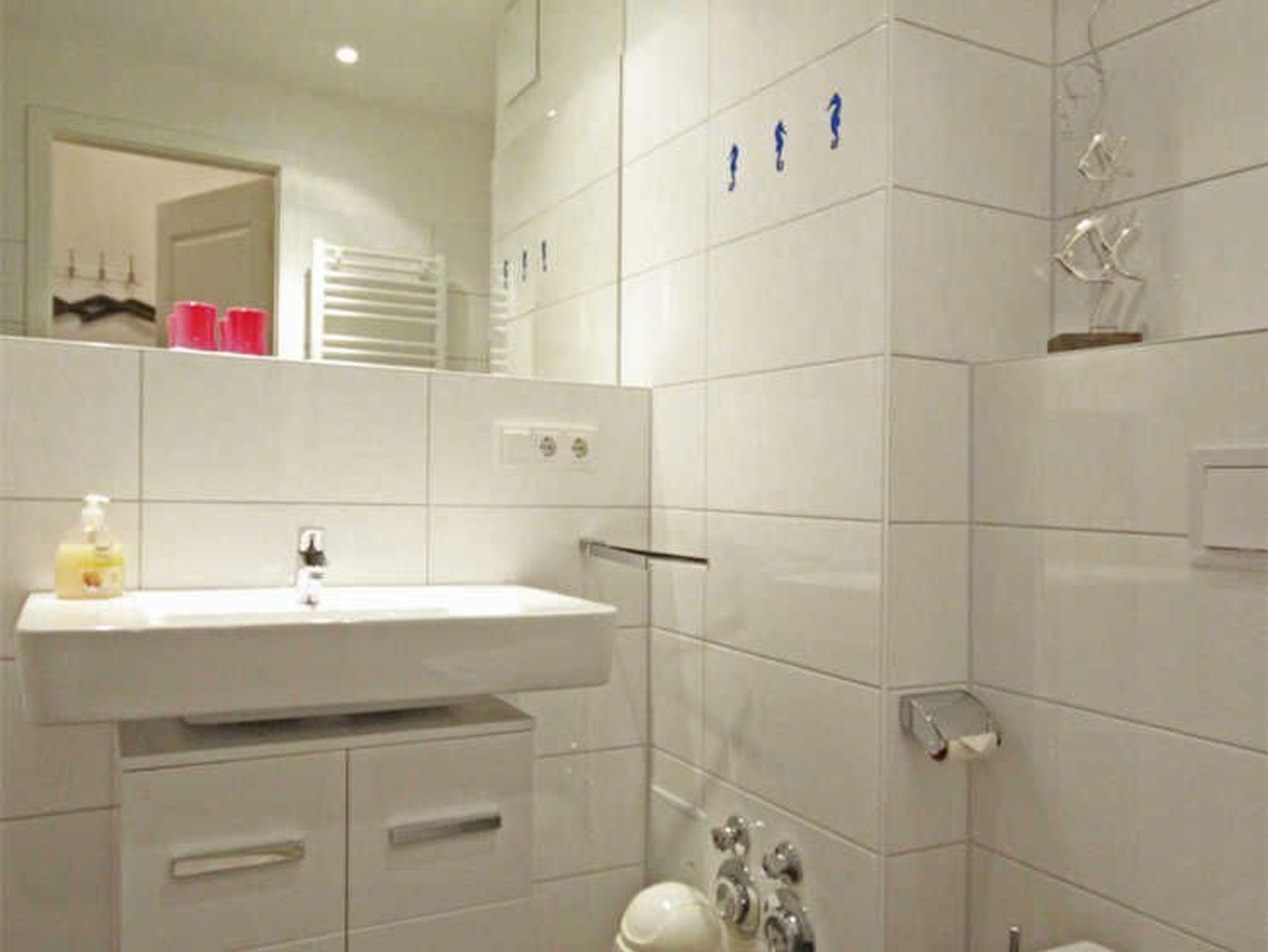 Das Bad verfügt über eine ebenerdige Dusche, Waschbecken und WC.