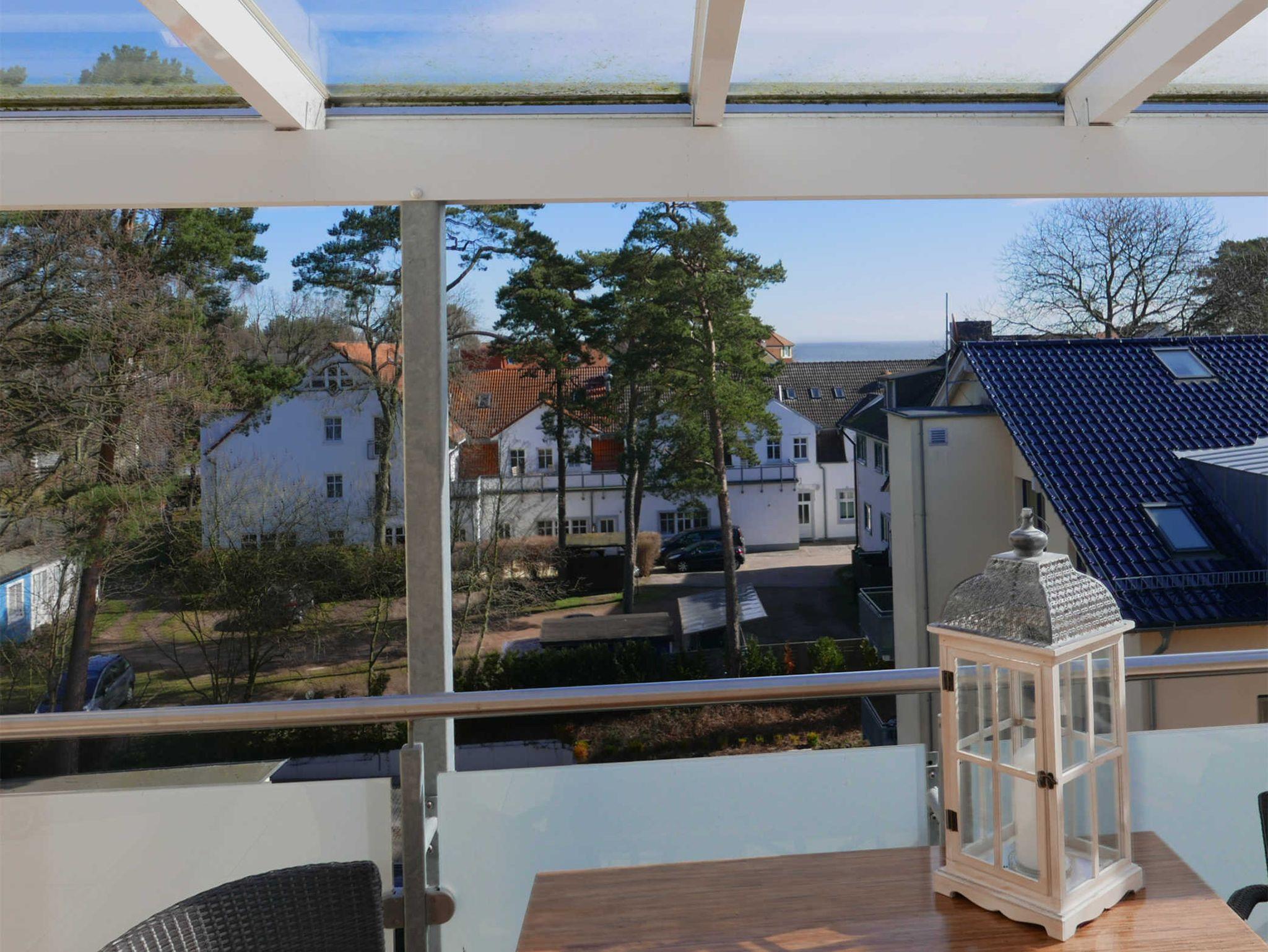 Große moderne 100 qm Ferienwohnung für bis zu 6 Personen, hell und lichtdurchflutet mit tollen Blicken bis zum Meer, barrierefreundlich eingerichtet mit 2 barrierefreien Duschen/WC, Terrasse mit Glasdach und Meerblick, Ein Fitnessraum und eine Saunalandschaft ist im Haus, Aufzug bis zur Wohnung, Parkplatz, WLAN. Gelegen in der Strandstr. 31, direkt an der schönsten Straße von Baabe mit Blick bis zum Meer