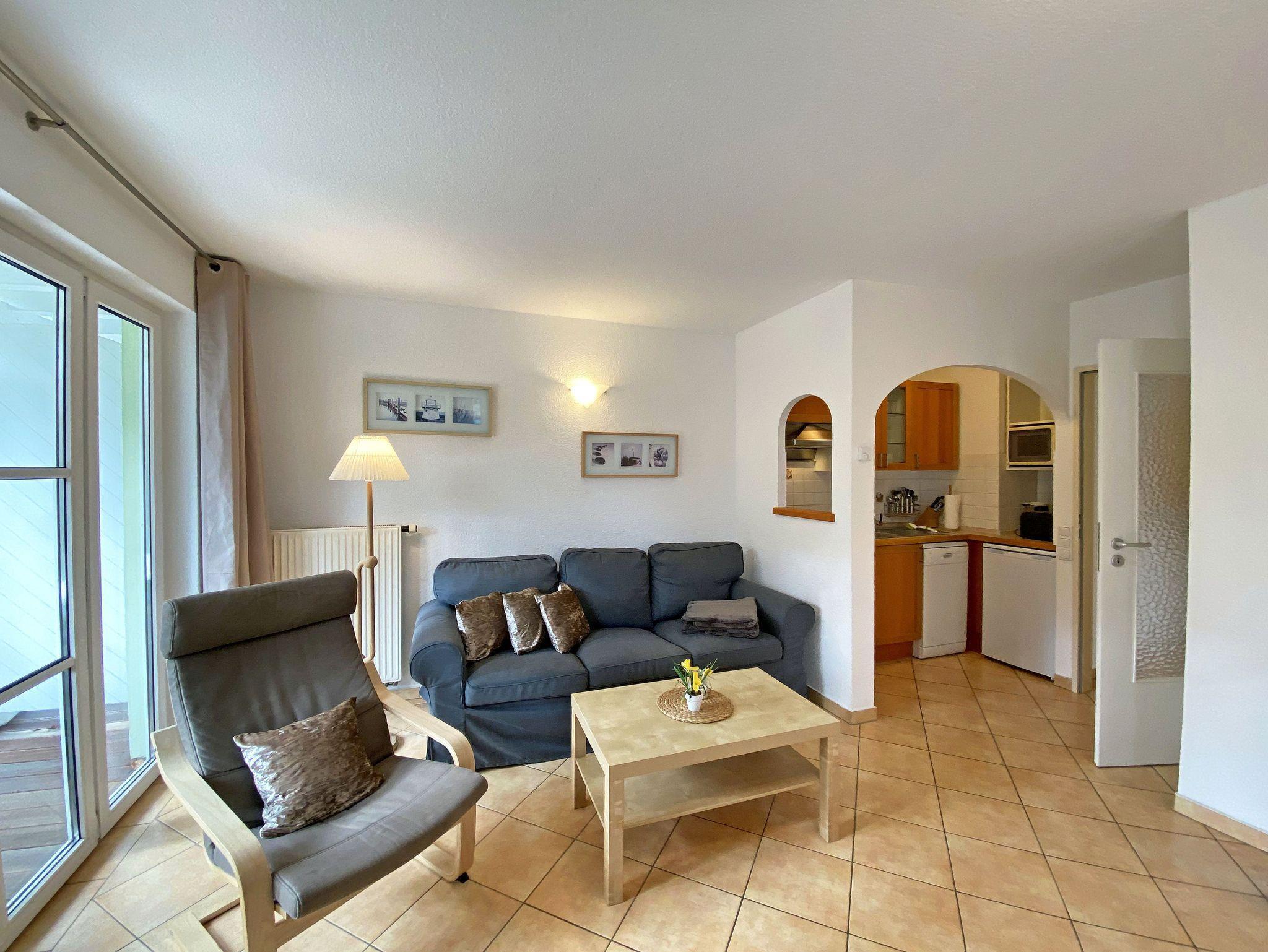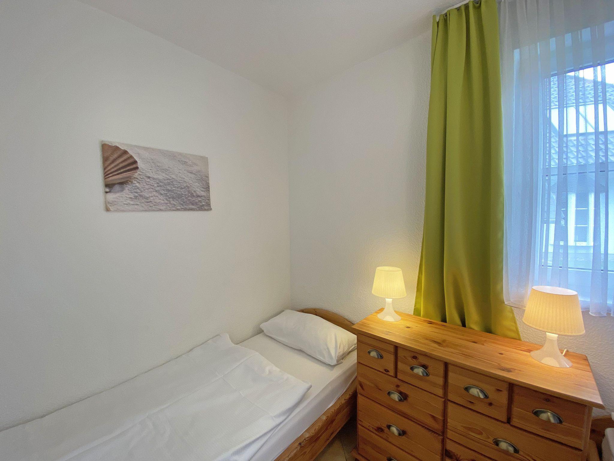 Die gemütliche und komfortable 3-Raum-Nichtraucherwohnung mit ca. 55qm Wohnfläche befindet sich im Erdgeschoss und bietet ausreichend Platz für 2 Erw. + 2 Kinder bis 17 Jahre. Die im Rügener Stil behaglich eingerichtete Ferienwohnung bietet einen großzügigen Wohn- Essbereich mit Zugang auf die teilweise überdachte Terrasse. Die kleine aber komplett eingerichtete Küchenzeile mit Geschirrspüler, Backofen, 4 Herdplatten, Kaffeemaschine, Toaster, Wasserkocher sowie diverse Küchenutensilien lassen keine Wünsche offen und grenzen an den Wohnbereich. Im Wohn- Essbereich erwartet Sie ein Esstisch mit 4 Stühlen, eine gemütliche Couch mit einem Sideboard sowie einen LCD Sat-TV in HD-Qualität für eine hohe Programmvielfalt, CD und DVD-Player sowie ein Radio mit USB-Anschluss und SD-Kartenleser. Vom Wohnbereich aus gelangen Sie auf die teilweise überdachte, im Bäderstil gehaltene und bestuhlte Terrasse (Richtung Süden) mit 2 zusätzlichen Sonnenliegen. Das 1. Schlafzimmer verfügt über 1 Doppelbett (2x90x200 cm) mit Nachtischkonsolen und einen viertürigen Kleiderschrank. Das Aufstellen eines Kinderreisebettes wäre hier möglich. Das 2. und damit kleinere Schlafzimmer ist mit 2 Einzelbetten (je 80x200cm), und Nachttischablagen ausgestattet. Beide Schlafzimmer sind abdunkelbar. Das geflieste Tageslicht-Bad bietet Ihnen eine Dusche, WC, Fön und einen Waschtisch. Auch im Urlaub brauchen Sie in der Wohnung nicht auf einen Internetanschluss (WLAN) verzichten. Dieser ist für Sie inklusive!!! In einem Gemeinschaftsraum können Sie eine Waschmaschine gegen eine Extragebühr nutzen (in den Monaten: November bis Ende März nicht im Betrieb). Ein Parkplatz Nr. 02 befindet sich vor dem Haus Rügenwelle und ist für Sie inklusive. Ihre mitgebrachten oder geliehenen Fahrräder können Sie auf dem Grundstück anschließen. Auf Wunsch kann auch 1x Kinderreisebett (mit Matratze, ohne Bett Inlett) / 1x Hochstuhl gestellt werden. 2 kleine Haustiere können gegen eine Gebühr dazu gebucht werden. Die Erstausstattung eines Wäschepaketes (komplette Bettwäsche, 1 Duschhandtuch, 2 kleine Handtücher) können Sie bis 14 Tage vor Anreise gegen einen Aufpreis dazu buchen oder durch eigene ergänzen. Ab 2 gebuchten Paketen erhalten Sie einmalig 1 Geschirrhandtuch und 1 Duschvorleger hinzu.