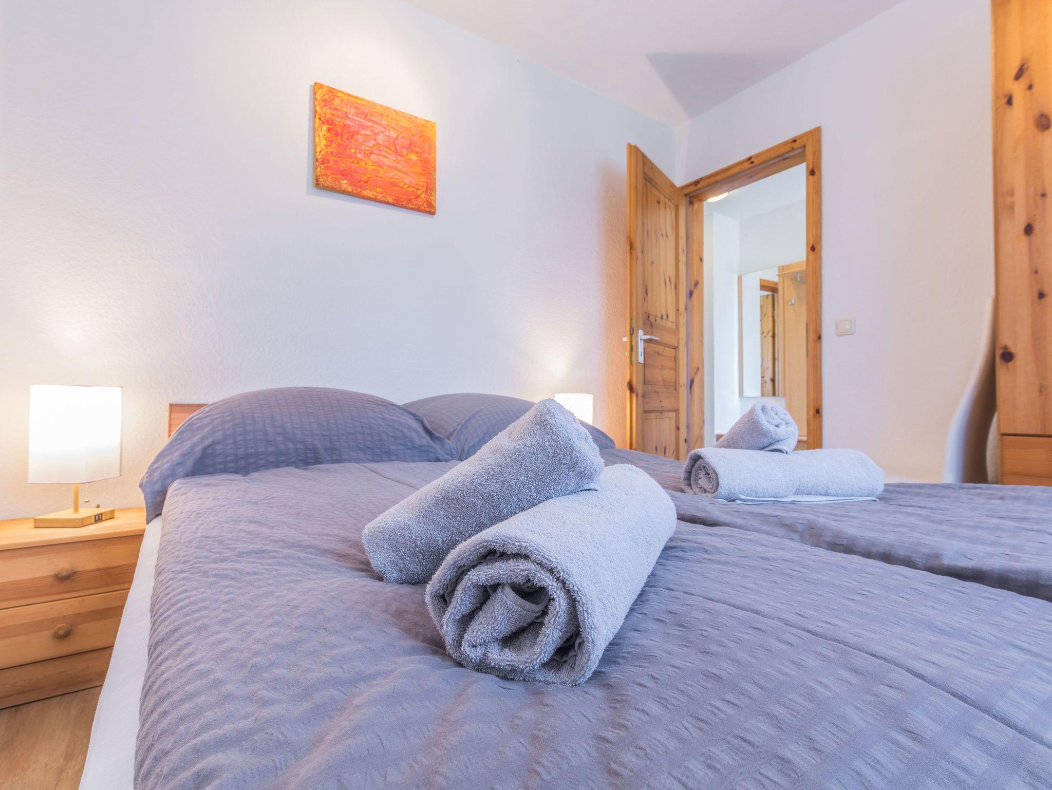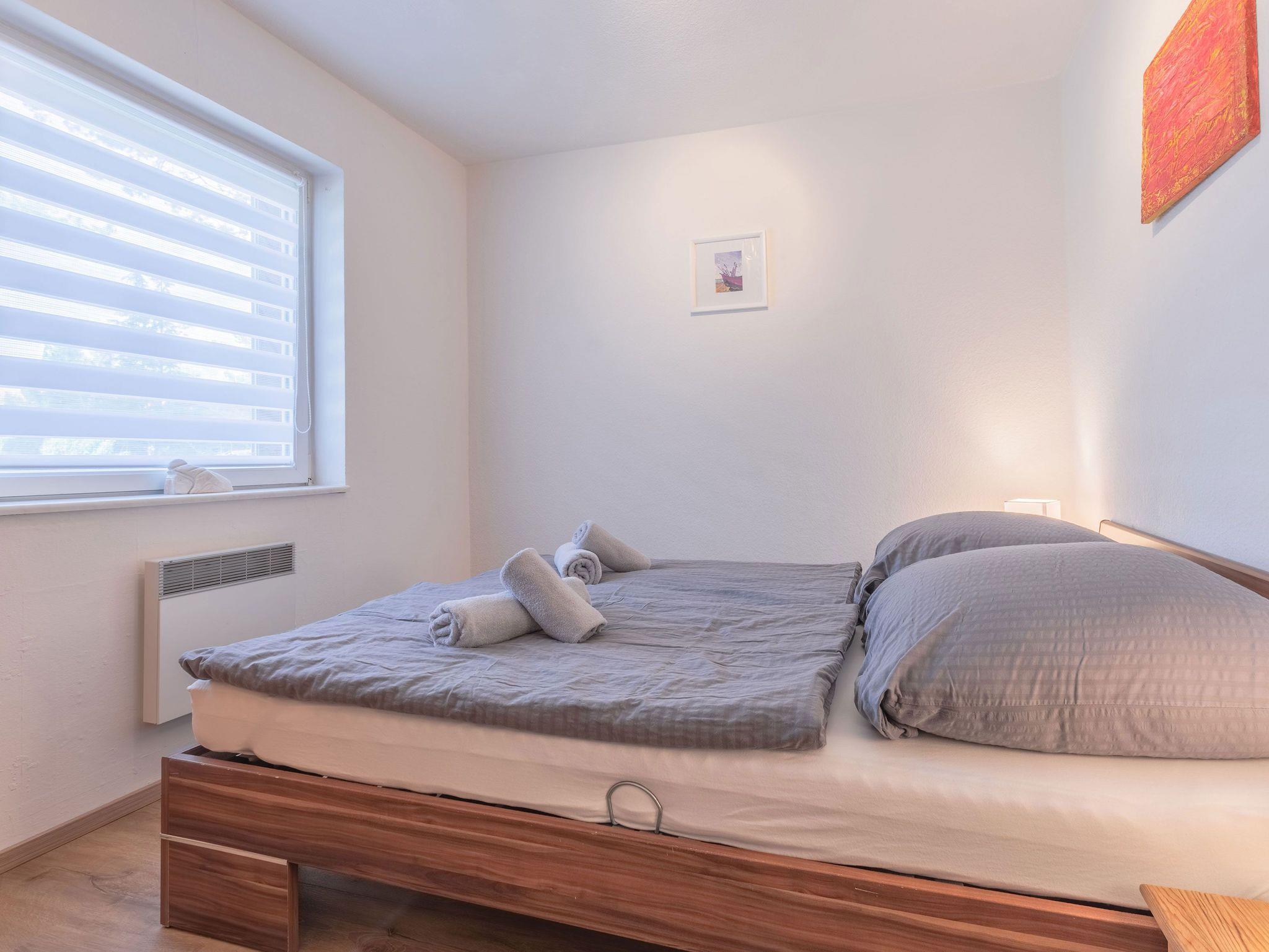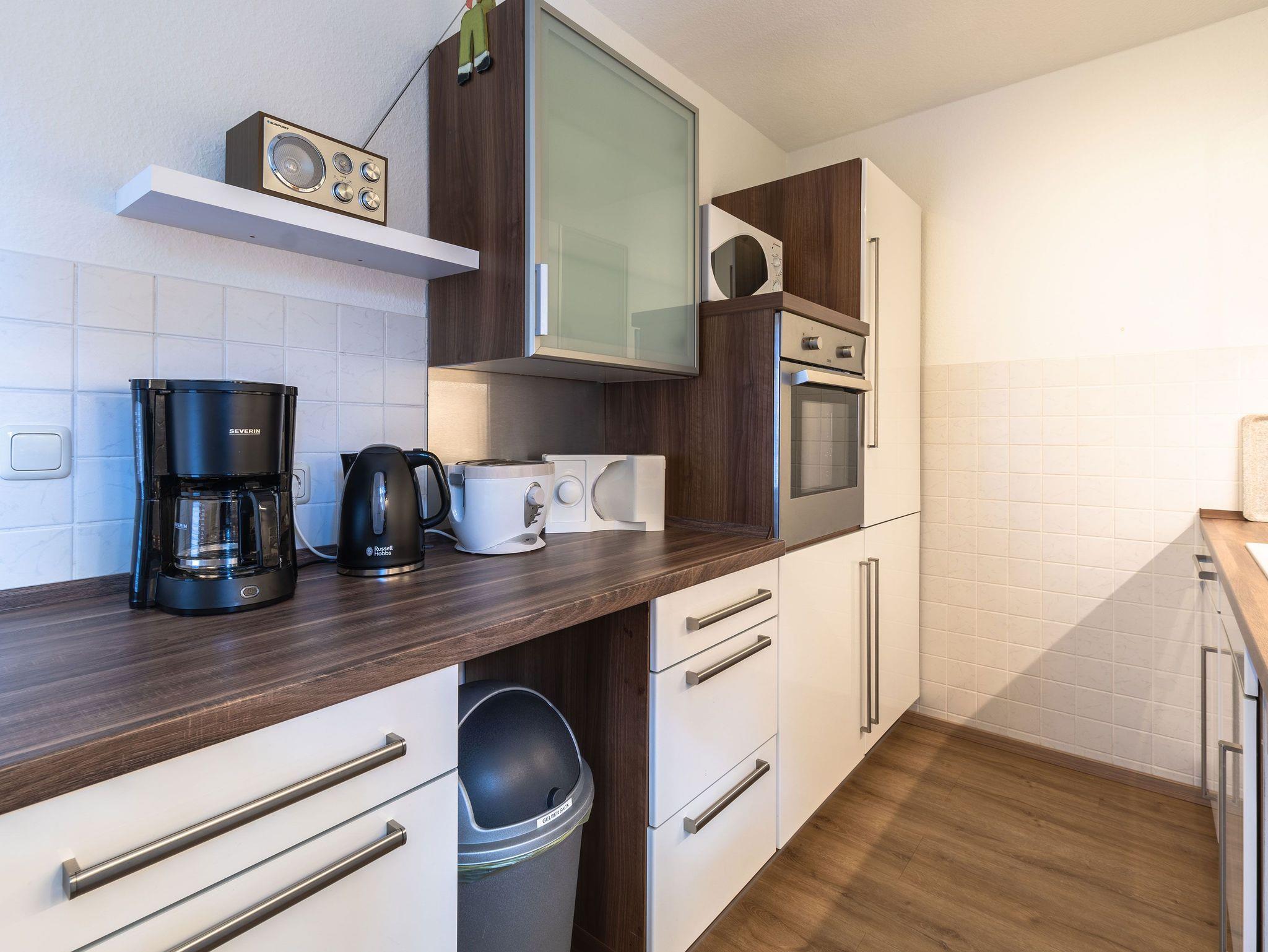 Die offene Küche ist mit einem 4 Platten Kochfeld, einem Backofen, Kühlschrank, Kaffeefiltermaschine, Wasserkocher, Toaster sowie einer Mikrowelle ausgestattet. Ein kleiner Essbereich rundet das Gesamtangebot ab. In den beiden Schlafbereichen befinden sich jeweils ein Doppelbett (140 x 200) und ein Kleiderschrank.