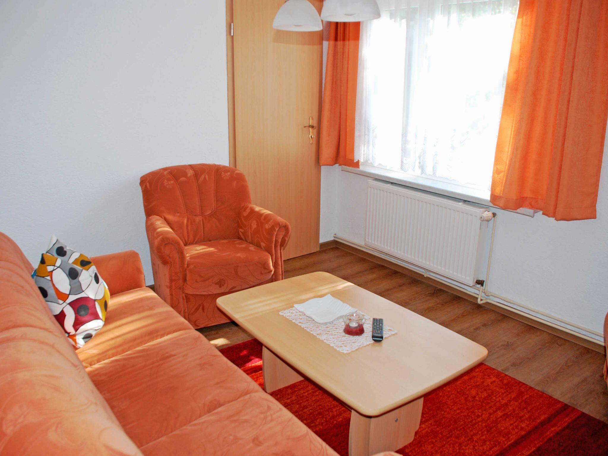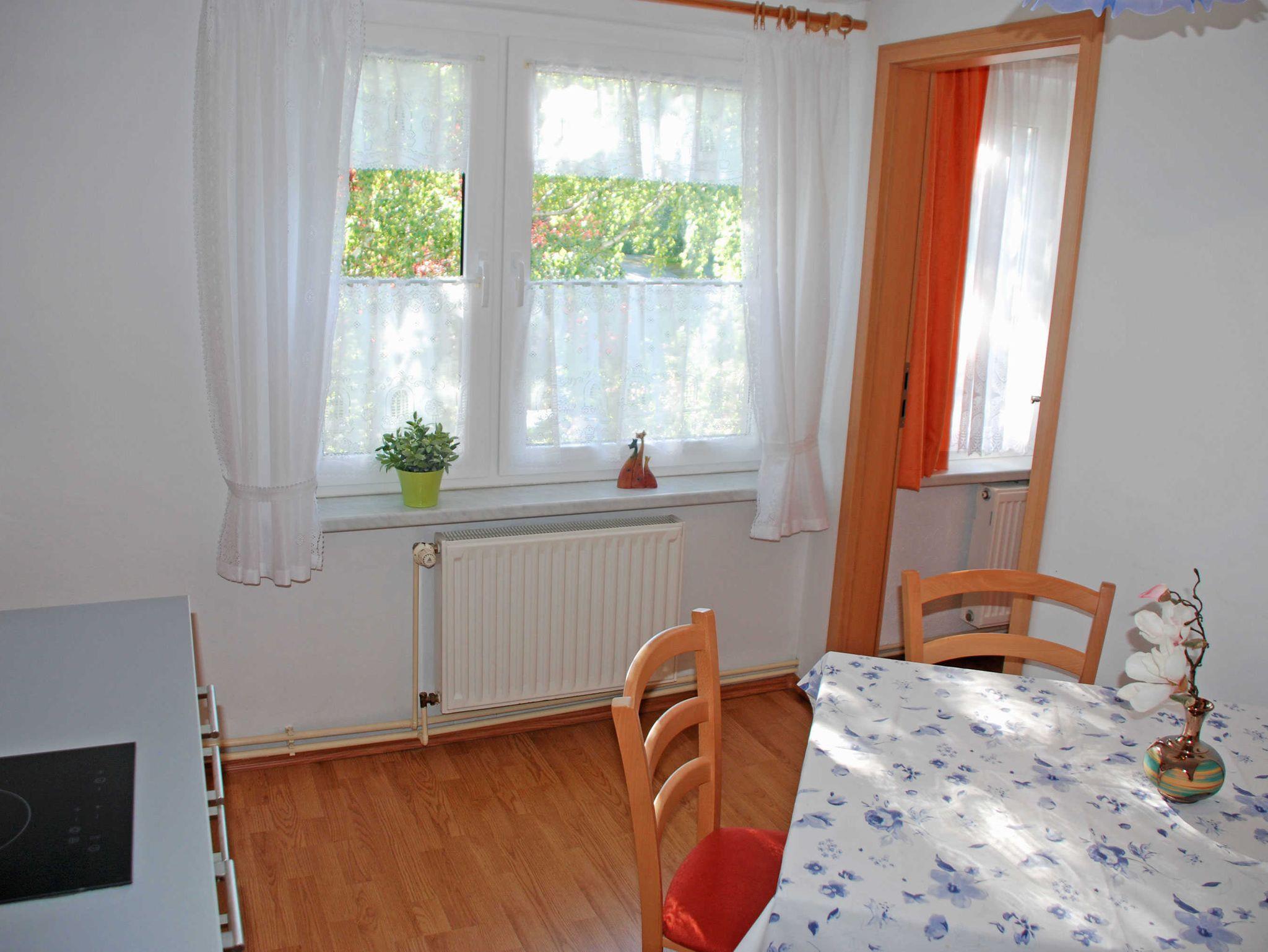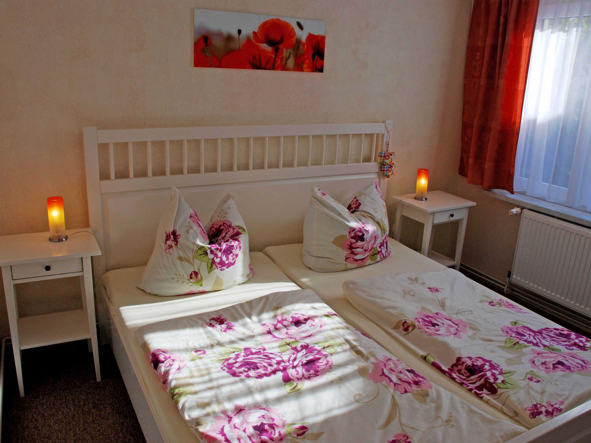 Die Ferienwohnung OG liegt im Obergeschoss des Wohnhauses und verfügt über einen separaten Eingang sowie WLAN. Sie ist ca. 40 qm groß, hat Platz für maximal 4 Gäste und wurde modern und liebevoll eingerichtet. Im Wohnraum befinden sich eine bequeme Sitzcouch mit Tisch und ein modernes Flachbild-TV-Gerät.Die separate Küche verfügt über einen Patryküche mit Herd, Wasserkocher, Kaffeemaschine, Toaster und Kühlschrank. Hier steht auch ein Esstisch mit Stühlen. Das erste Schlafzimmer ist mit einem bequemen Doppelbett mit Nachttischen und Leselampen sowie einem Kleiderschrank ausgestattet. Im zweiten Schlafzimmer stehen zwei Einzelbetten mit Nachttischen und Leselampen. Ein kleines Kinderreisebett und ein Hochstuhl können auf Wunsch kostenlos zur Verfügung gestellt werden.