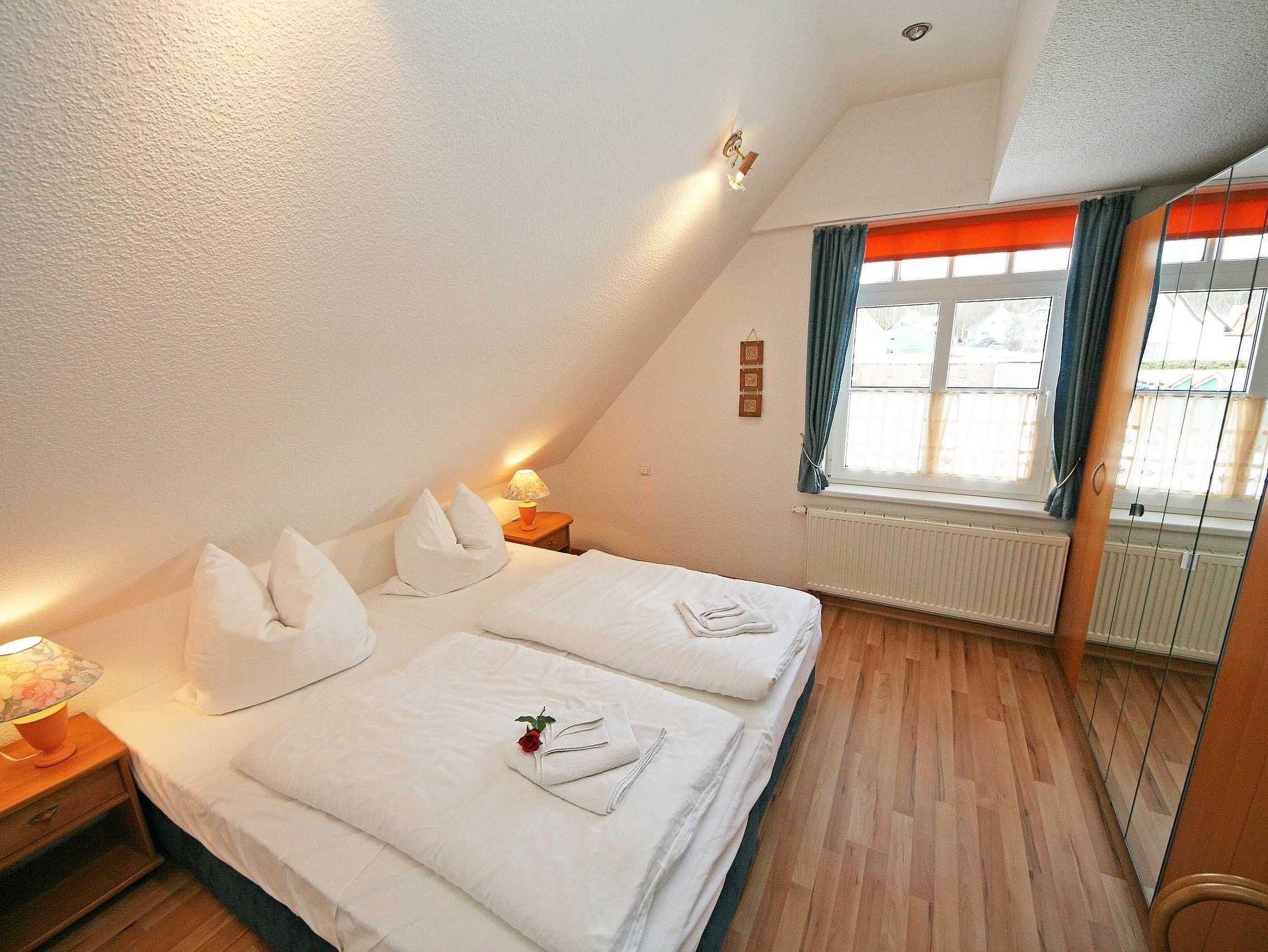 Herzlich Willkommen in Haus Rügenwind! Die 55qm große komfortable und voll ausgestattete 3-Zimmer Ferienwohnung in ruhiger Lage (Nichtraucher, 3 Erwachsene, 1 Kind bis 17 J.) befindet sich im 1. Stock und verfügt zusätzlich über einen im Bäderstil gestalteten überdachten Balkon (Südseite). Ein Gartentisch mit 4 Gartenstühlen vervollständigt Ihren Außenbereich. Ein Sichtschutz zur Nachbarwohnung wahrt Ihre Privatsphäre. Grillmöglichkeit im Garten. Der Wohnbereich verfügt über eine Doppel-Glastür mit Zugang zum Balkon. Der charmante Wohnbereich ist im Rügener Stil mit einer gemütlichen Couch, Korbsessel, Wohnzimmertisch, Sideboard sowie LCD-SatTV in HD-Qualität und CD-Player mit Radio ausgestattet. Ihr Essbereich mit ausreichend großem Tisch und vier Stühlen befindet sich direkt zwischen Balkon und dem offenen, aber separaten Kochbereich, der mit 4 Kochplatten, Kühlschrank mit ***Gefrierteil, Geschirrspüler, Backofen, Mikrowelle, Kaffeemaschine, Toaster, Wasserkocher, usw. voll ausgestattet ist. Das große Schlafzimmer verfügt über ein Doppelbett (2x90x200cm) in angenehmer Liegehöhe mit hochwertigen Matratzen in Hotel-Qualität und je einem eigenen Nachttisch mit Lampe. Der 2m breite Kleiderschrank (mit großen Spiegeltüren) bietet ausreichend Platz für Ihre gesamte Kleidung. Das Fenster kann abgedunkelt werden. Ein gepolsterter Korbstuhl gehört zur Ausstattung dazu. Das zweite Schlafzimmer ohne Kleiderschrank ist mit zwei Einzelbetten über Eck ausgestattet (je 80x200 cm), wovon eins erhöht eingebaut ist (98 cm hoch). Leselampen, 2 Hocker und ein Schubladenelement und ebenfalls ein zuverlässig verdunkelndes Rollo runden die Einrichtung ab. Das geschmackvoll gestaltete Tageslicht-Badezimmer mit Fußbodenheizung ist sowohl mit Eckbadewanne als auch mit Glas-Dusche, Toilette, Fön, Handtuchhalter-Heizung und großem Waschtisch mit reichlich Ablageflächen ausgestattet. Durch die massive Bauweise mit Kalksandstein bietet Haus Rügenwind zu jeder Jahreszeit ein angenehmes Raumklima und zusätzlich den idealen Schallschutz zwischen den Wohnungen. Zusätzlichen Service ist WLAN, welches Sie während des gesamten Aufenthaltes komplett kostenfrei nutzen dürfen. In einem Gemeinschaftsraum finden Sie zusätzlich eine Waschmaschine (Münzgeräte) (in den Monaten: November bis Ende März nicht im Betrieb). Für eine Kleinkind-Aufbettung (inklusive) stehen ein Kinderreisebett (mit Matratze, ohne Bett Inlett) sowie ein Hochstuhl für Sie bereit. Direkt am Haus befindet sich Ihr Parkplatz Nr. 4 (inklusive). Für Ihre Fahrräder gibt es direkt hinter dem Haus ebenfalls ein geeigneter Stellplatz. 2 Haustiere sind gegen eine Gebühr willkommen, dürfen jedoch nicht die Schlafräume betreten. Die Erstausstattung eines Wäschepaketes (komplette Bettwäsche, 1 Duschhandtuch, 2 kleine Handtücher) können Sie bis 14 Tage vor Anreise gegen einen Aufpreis dazu buchen oder durch eigene ergänzen. Ab 2 gebuchten Paketen erhalten Sie einmalig 1 Geschirrhandtuch und 1 Duschvorleger hinzu. Wir freuen uns auf Ihren Besuch!