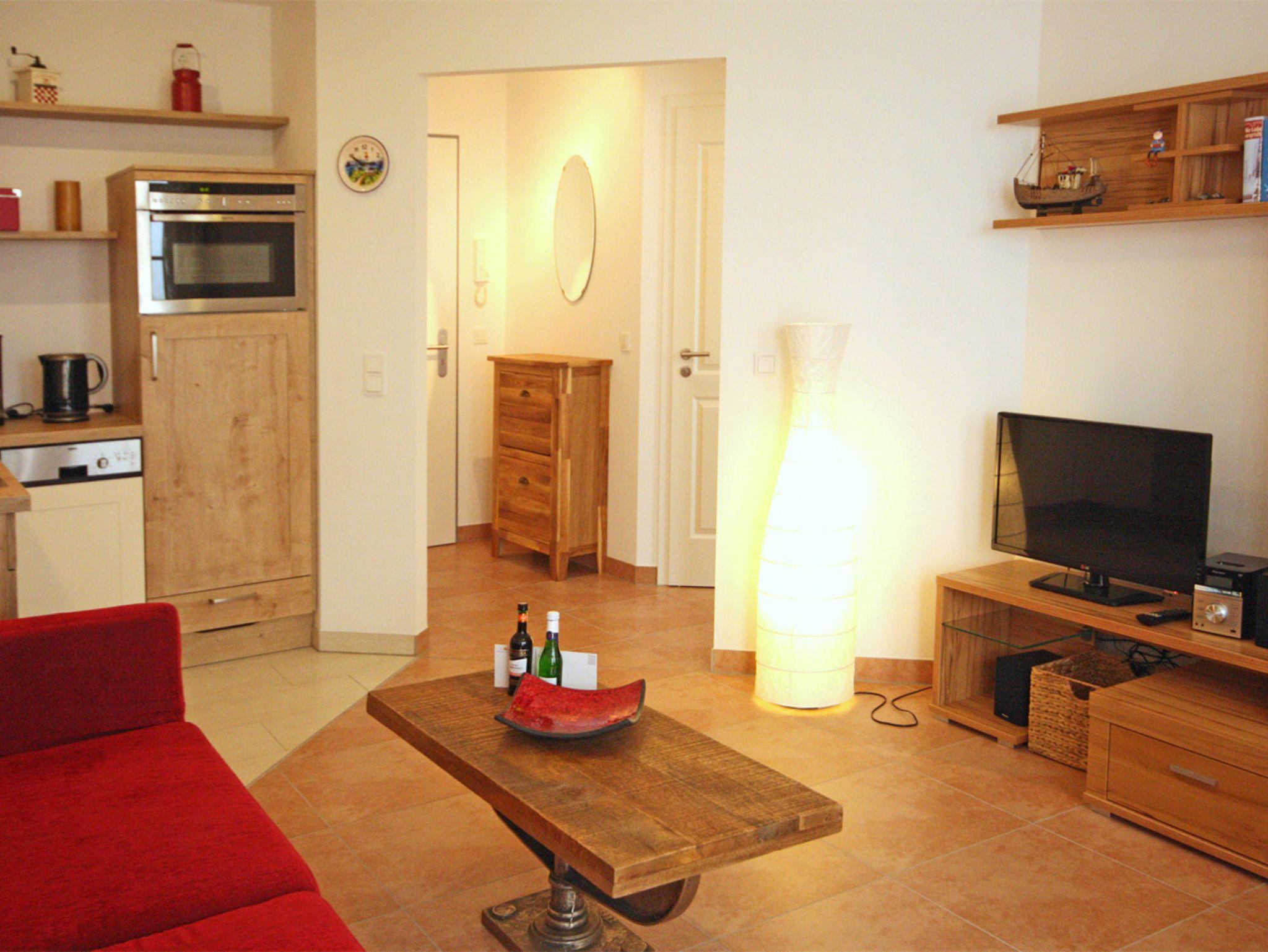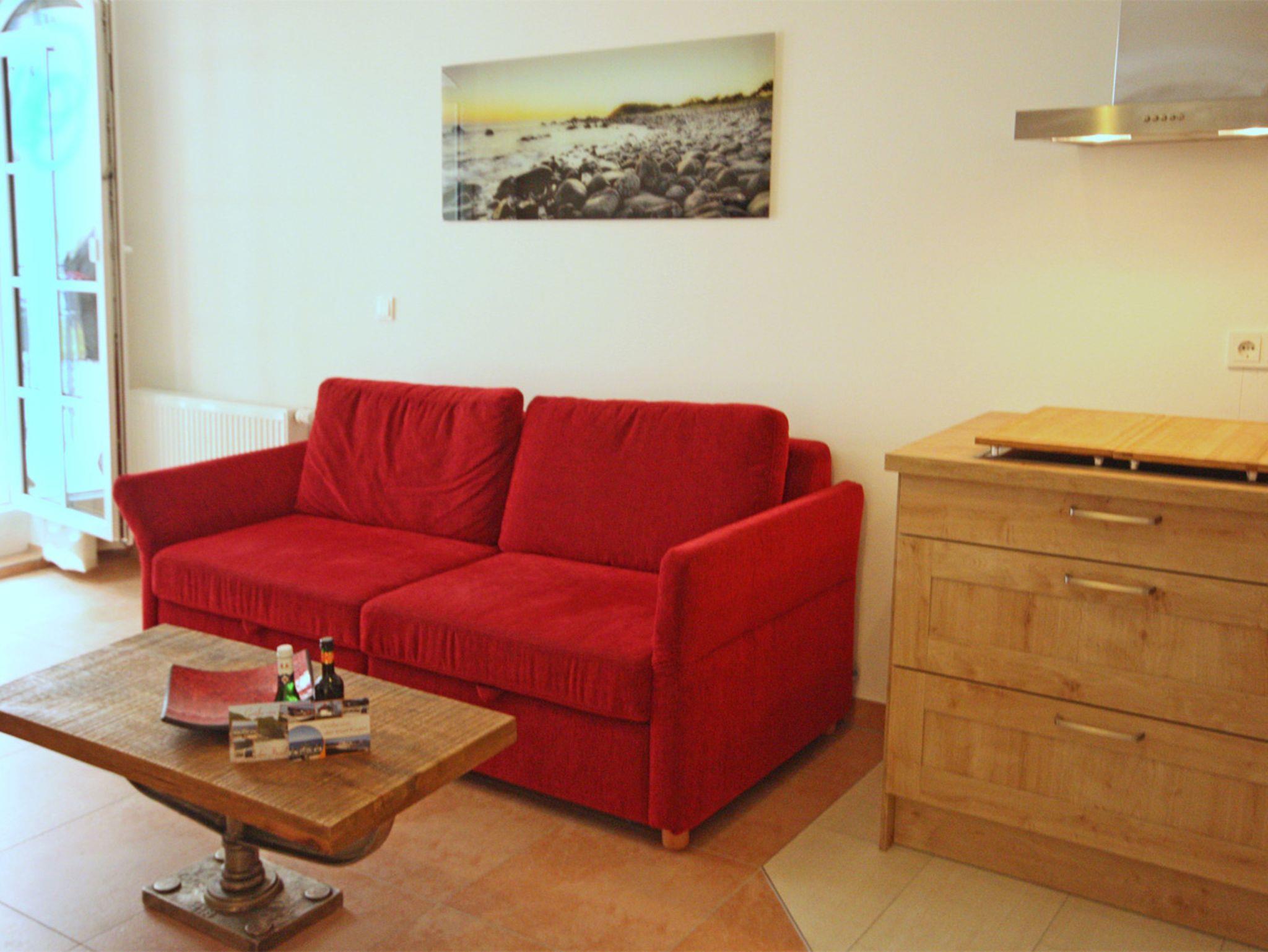 Die Ferienwohnung Strandnah befindet sich im ersten Stock der Ferienresidenz Haus Meeresblick, die weniger als 200 Meter vom Strand entfernt liegt. Freundlich eingerichtet und dennoch modern bietet sie Platz für 2-4 Personen im separaten Schlafzimmer mit Doppelbett als auch auf dem Schlafsofa, das in den Wohn- und Essbereich integriert ist. Zu Ihrer Unterhaltung innerhalb der Wohnung stehen für Sie TV, CD-Player und Radio bereit. Dort ist außerdem die offene Küche mit 4-Plattenherd, Kühlschrank mit Gefrierfach, Spülmaschine, Backofen, Kaffeemaschine und Toaster.