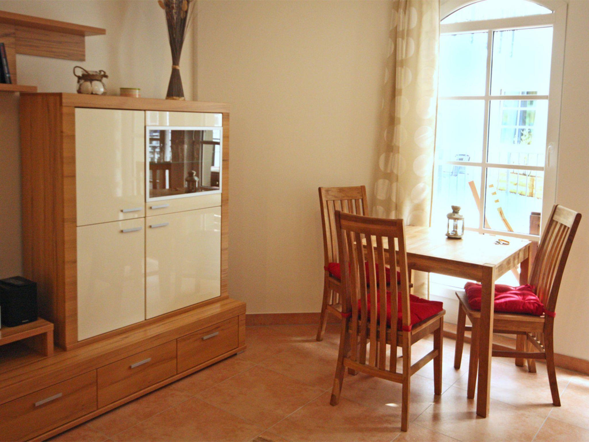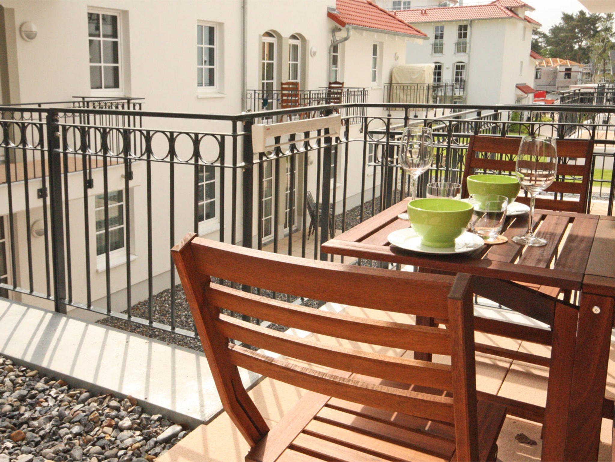 Der Balkon, der in den Innenhof gelegen ist, hat 4 Sitzplätze und bietet Sicht in Richtung Kurpark.
