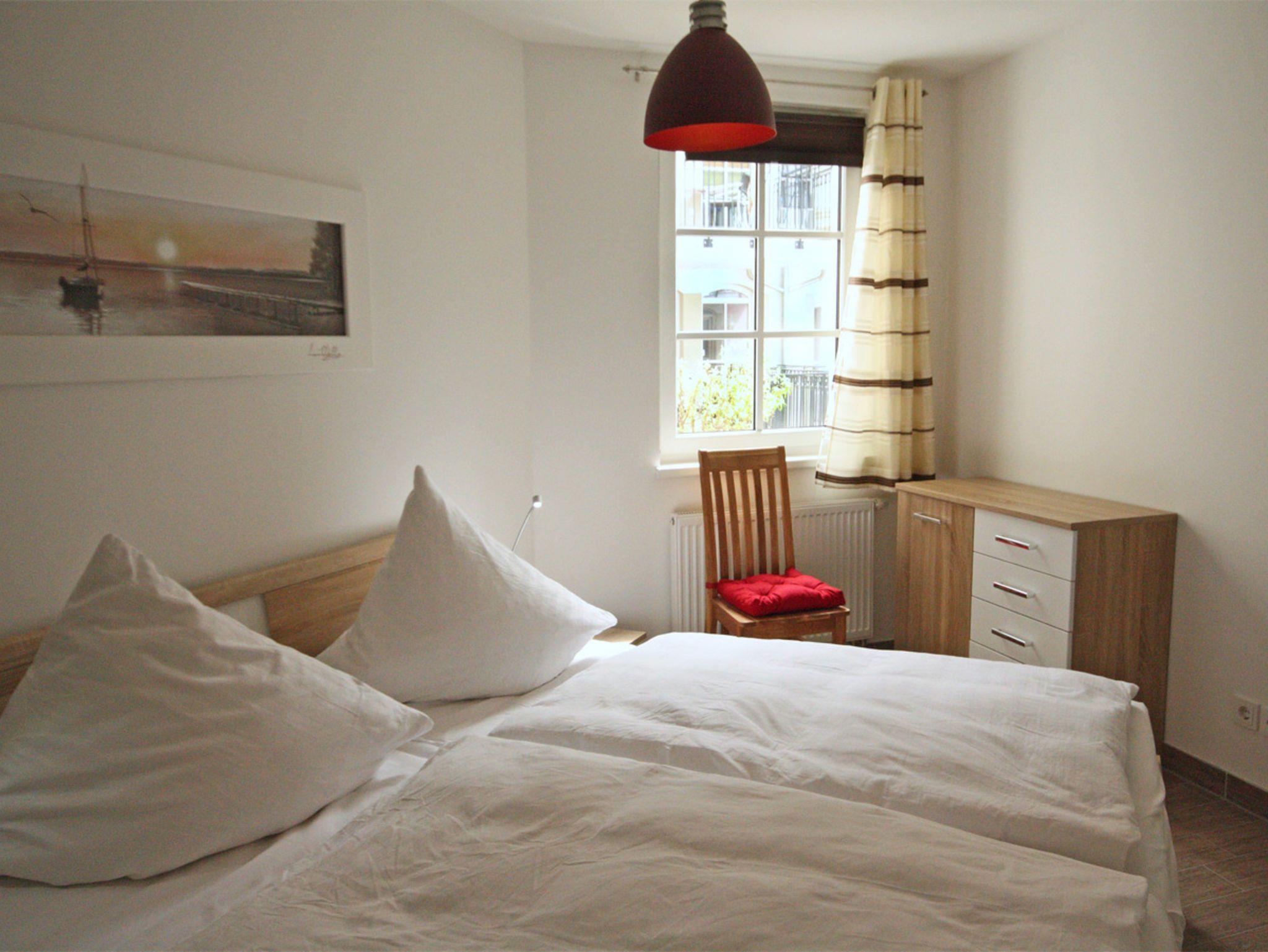 Moderne, neu eingerichtete Ferienwohnung für 2 - 4 Personen, Schlafzimmer mit Doppelbett und möbliertem Balkon zum Innenhof. Die Ferienwohnung liegt in der 1. Etage des Hauses. Das erst 2013 neu eröffnete Haus Meeresblick hat einen direkten Zugang zum Strand. Das Haus ist mit einem Lift, einer Tiefgarage und einem großen Wellnessbereich mit Schwimmbad (ca. 8,00 m x 4,00 m - 1,35 m tief), zwei Saunen (eine finnische Sauna/eine Bio-Sauna) und einem Massagebereich ausgestattet. Der Wellnessbereich ist ganzjährig geöffnet.
