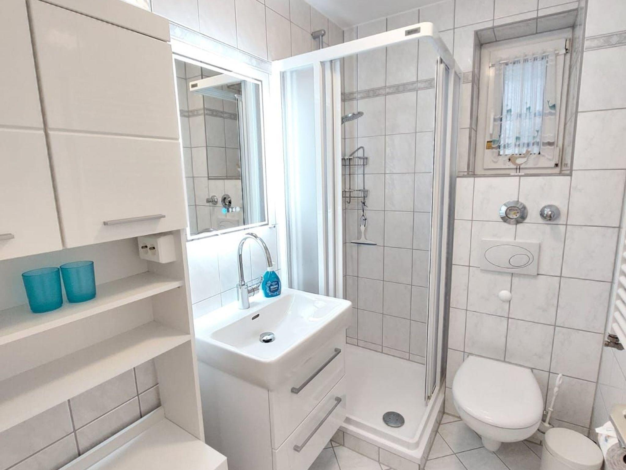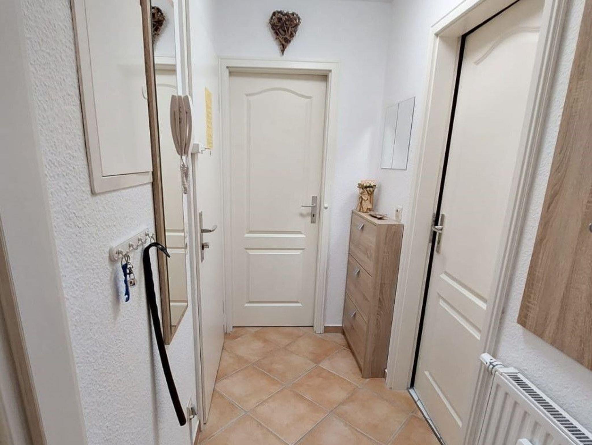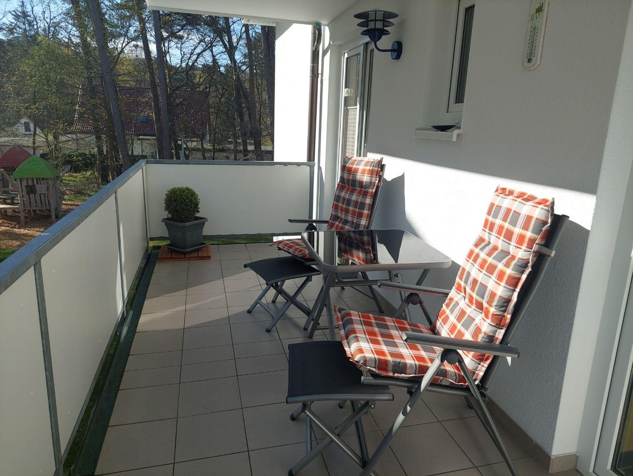 2-Zimmer-Ferienwohnung mit Balkon: 41 m², 1 WZ mit Küchenzeile und Ausgang zum Balkon (2 Balkon-Alu-Hochlehner mit Auflagen u. passende Klapphocker, ein Tisch und Sichtschutz-Balkonumrandung) , ein großer TV Flachbildschirm (HD TV für öffentlich rechtliche Sender), Fliegengitter im WZ- Fenster, Hifi Anlage mit CD, Wohnwand mit Bücherregal, kostenloses WLAN, moderne Küchenzeile mit Geschirrspüler, Cerankochfeld, Backofen, großer Kühlschrank mit Gefrierfach, 1 SZ mit Ausgang zum Balkon, Doppelbett (1.90x1.80 m), Kleiderschrank inkl. Spiegel, verdunkelte Plissees, ruhige Lage, 1 gefliestes Bad mit WC, Dusche mit flachen Einstieg, Waschplatz, beheizter Handtuchhalter, Föhn, Fenster, kleiner Flur mit Schuhschrank, Flurgarderobe, Spiegel, Ferienwohnung komplett gefliest