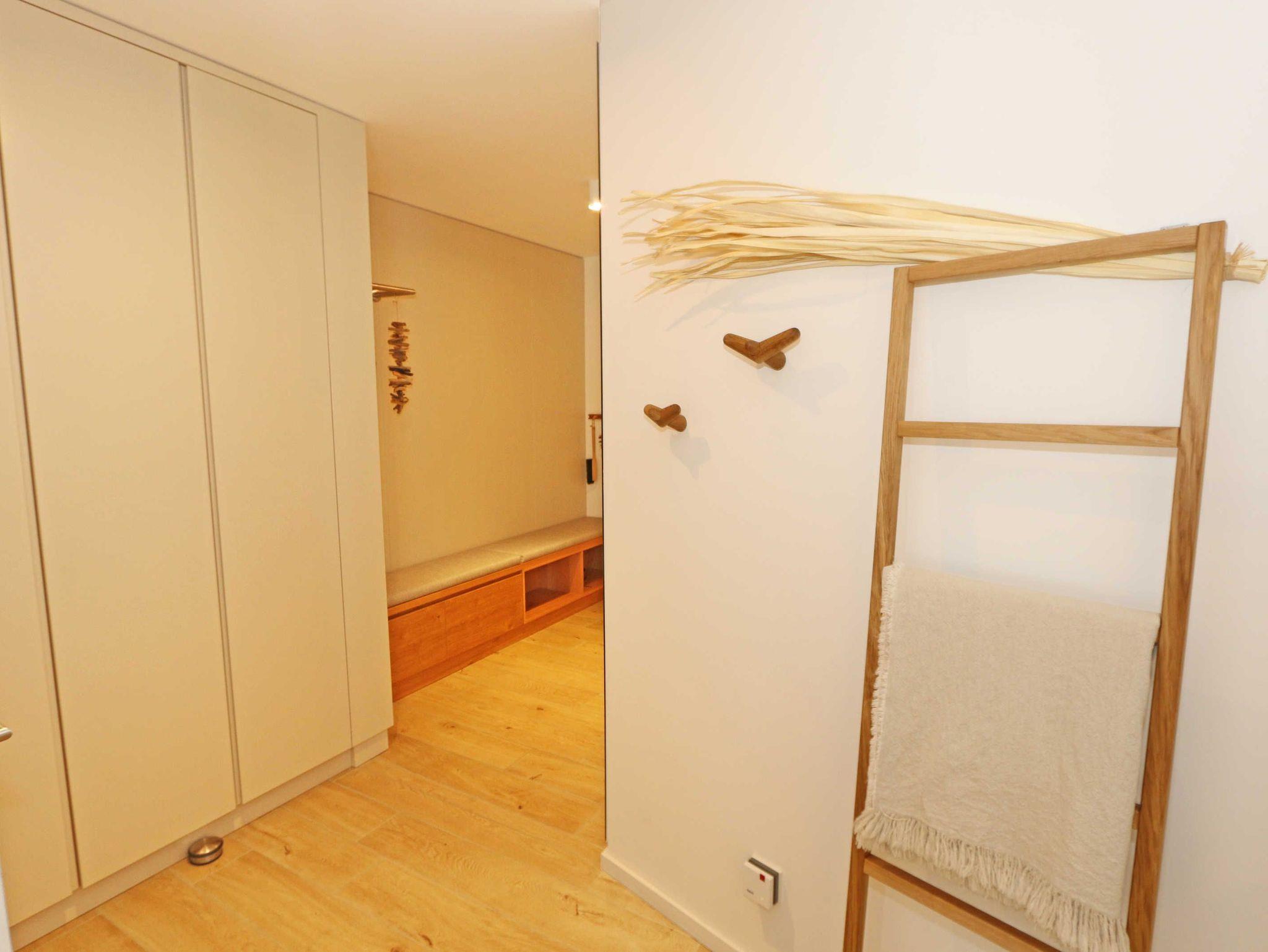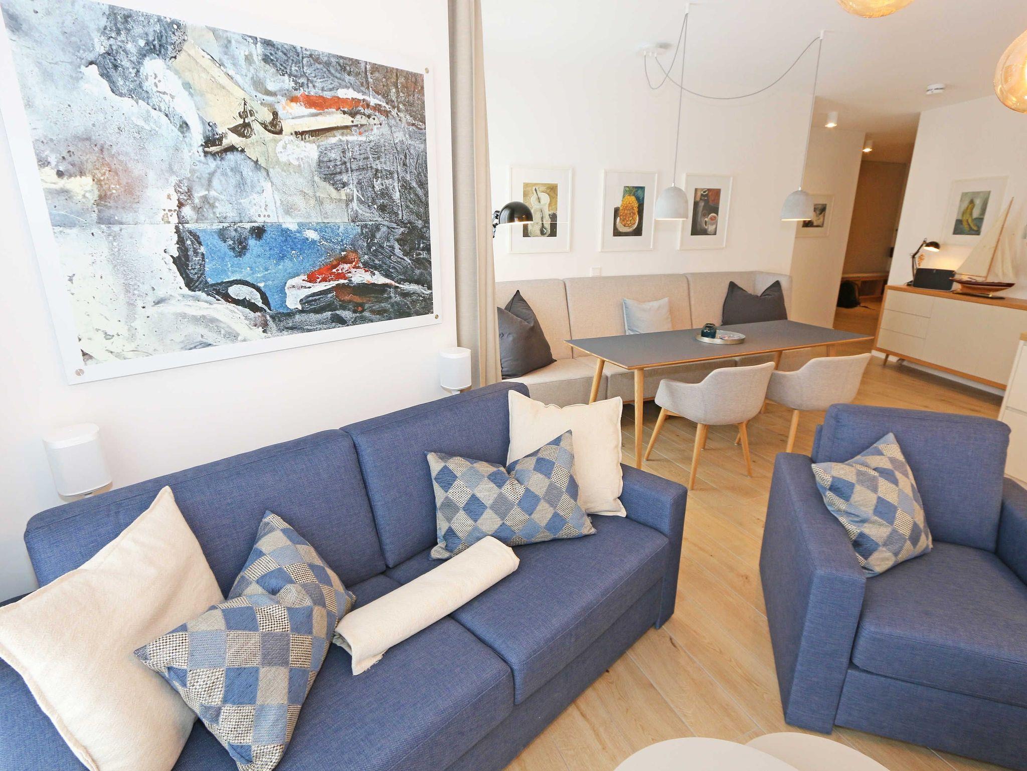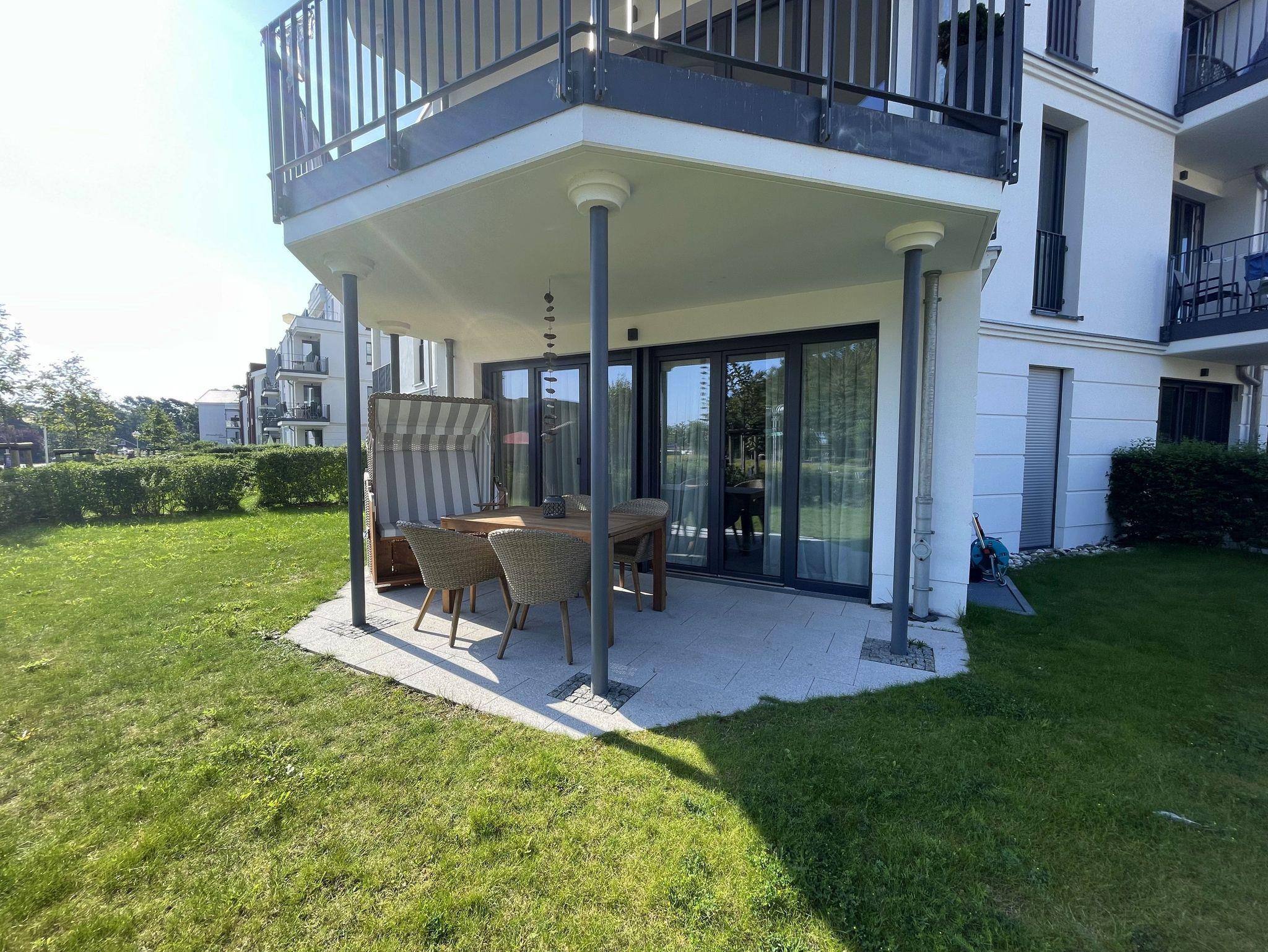 Das geräumige Apartment mit einer Wohnfläche von ca. 80 m² und zwei Schlafzimmern befindet sich im erhöht gelegenen Erdgeschoss des Hauses. Es verfügt über eine bestuhlte und überdachte Terrasse (Nordosten) mit einem zusätzlichen eigenem ca. 150 m² großen Gartenanteil. Die Wohnung eignet sich somit hervorragend für Familien oder Paare mit 2 bis 4 Erwachsene + 1 Kleinkind bis 3 Jahre im Kinderreisebett. Das gemütliche Wohn- und Esszimmer lädt mit ausgewählten Möbeln in hellem Eichenholz und farblich abgestimmten Polstern in charmanter Atmosphäre zum Verweilen ein. Im Essbereich bietet ein langer Tisch mit gepolsterter Sitzbank und Stühlen ausreichend Platz, um ein leckeres Essen zu genießen oder einen geselligen Spieleabend zu verbringen. Nach einem ausgiebigen Strandtag kann man es sich im Wohnbereich auf dem Sessel oder der Couch mit Leselampe bequem machen. Passende Beistelltische, eine Stehlampe und das Sideboard mit einer Auswahl an Gesellschaftsspielen und kleiner Urlaubsbibliothek ergänzen die attraktive Ausstattung. Ein großer 65? Smart-TV und Surround System mit Zugang zu Fernsehen, Film und Musik runden das vielfältige Angebot der Wohnung ab. Ein Account von Netflix, Amazon Prime und Spotify steht Ihnen zusätzlich zur Verfügung. Unterhalb des Fernsehers befindet sich eine praktische Schreibtisch-Konsole, an der Sie sich in die Urlaubspost an Freunde und Familie vertiefen können. Selbstverständlich steht Ihnen ein kostenloser Internetanschluss (WLAN) zur Verfügung. Die offene Küchenzeile ist mit Miele-Geräten hochwertig ausgestattet und lässt mit Ceran-Kochfeld, Backofen, Spülmaschine, Kühlschrank mit Gefrierkombination, Mikrowelle, Kaffeemaschine, Toaster, Wasserkocher und allen nötigen Küchenutensilien bei Kochbegeisterten keine Wünsche offen. Alle lichtdurchfluteten Wohn- und Schlafräume sind mit bodentiefen Fenstern, leichten Stores und blickdichten Vorhängen ausgestattet, die bei Bedarf mit elektrischen Rollläden vollständig verdunkelt werden können. Von allen Räumen können sie in den umlaufenden Garten gelangen und schon am Morgen barfuß über die Wiese laufen, um ihr Frühstück auf der überdachten Terrasse mit Strandkorb bei einer Prise Meeresluft zu genießen. In beiden Schlafzimmern gewährleisten komfortable Boxspringbetten (á 1,80m x 2,00m) mit durchgehendem Topper und gepolstertem Betthaupt tiefen und erholsamen Schlaf. Nachttischablagen und große deckenhohe Kleiderschränke sorgen für eine optimale Raumaufteilung. Zusätzlich steht hier je ein weiterer Smart-TV zur Verfügung. Im Masterbad befindet sich eine ebenerdige Regendusche und ein Handtuchtrockner, im zweiten Bad die Sauna. Beide Bäder sind mit einem Waschtisch mit Schubladen und Ablagefächern, einem Wandspiegel, einem WC, Fön und Kosmetikspiegeln ausgestattet. Auch der Eingangsbereich und Flur ist für einen angenehmen Aufenthalt mit durchdachten Details gestaltet. Eine breite Sitzbank mit Schubfächern, Ganzkörperspiegel, Garderobe und einem weiteren geräumigen Schrank ermöglicht viel zusätzlichen Raum um Strandutensilien, Koffer etc. verstauen zu können. Hier finden Sie u.a. auch einen Staubsauger, Bügeleisen und Bügelbrett, Wäscheständer und Reinigungszubehör. Die gesamte Wohnung ist mit Feinsteinfliesen in Holzoptik ausgelegt. Eine Fußbodenheizung sorgt auch an kühleren Tagen für angenehme Wärme. Alle Lampen sind dimmbar, so dass Sie die Lichtstimmung nach Ihren Wünschen gestalten können. Haustiere sind nicht erlaubt. Zur Wohnung gehört ein Tiefgaragenstellplatz (Nr. 11/ Einfahrtshöhe 2,00m) mit einer Ladestation für Elektrofahrzeuge, der sich bequem über den Fahrstuhl erreichen lässt. Fahrräder können im begrünten Außenbereich oder einem abschließbaren Kellerraum (Nr.19) sicher abgestellt werden. Hier können auch E-Bikes geladen werden. Im Untergeschoss des Gebäudes befindet sich ein weiterer Wellnessbereich mit einer Gemeinschaftssauna und einem Ruheraum. Ein Waschraum mit Waschmaschinen und Wäschetrockner stehen mit Münzautomaten zur Verfügung. Die Erstausstattung eines Wäschepaketes (komplette Bettwäsche, 1 Duschhandtuch, 2 kleine Handtücher) können Sie bis 14 Tage vor der Anreise gegen einen Aufpreis dazu buchen oder durch eigene ergänzen. Ab 2 gebuchten Paketen erhalten Sie einmalig 1 Geschirrtuch und einen Duschvorleger dazu.
