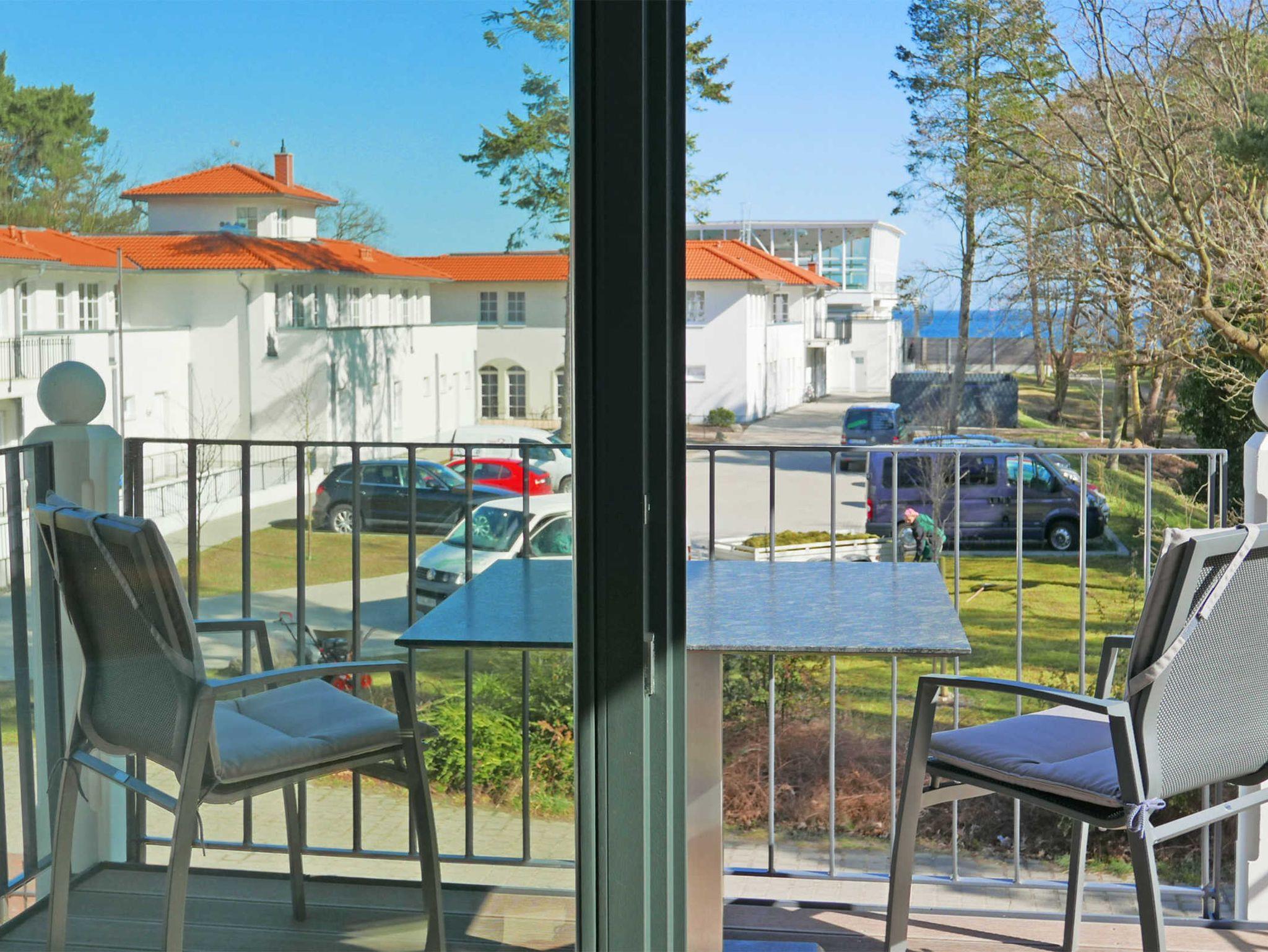 Die bodentiefen Fenster im Wohnbereich bieten einen Blick bis zum Meer. Auf dem Balkon befinden sich Stühle und Tische, auf denen Sie den Blick aufs Meer genießen können.