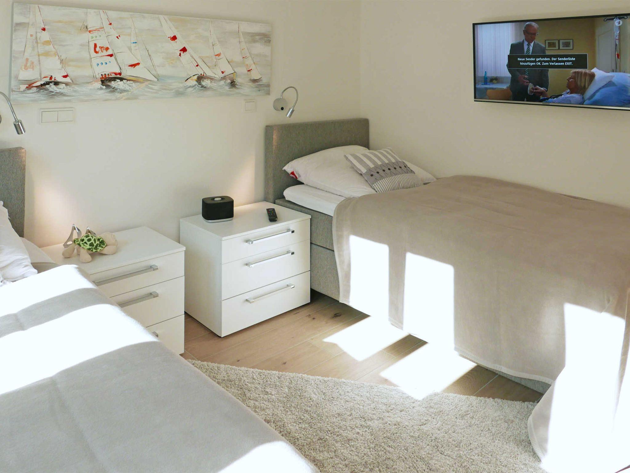 Die moderne sehr hochwwertige Ferienwohnung liegt in der ersten Etage und ist mit einem Lift gut aus der Tiefgarage zu erreichen. Sie wohnen ruhig und dennoch zentral und fast direkt am Wasser. Es gibt 2 sehr schöne Schlafzimmer, eines mit Doppelbett und eines mit 2 Einzelbetten, sowie 2 Duschbäder. In jedem Schlafzimmer gibt es zudem einen Fernseher.