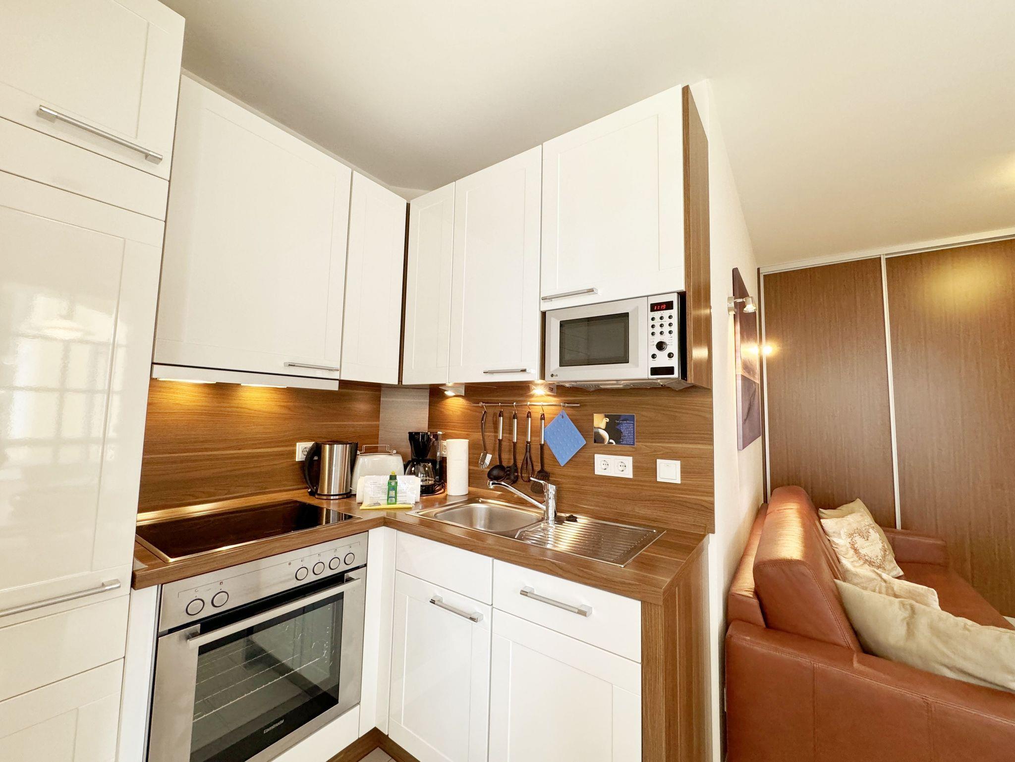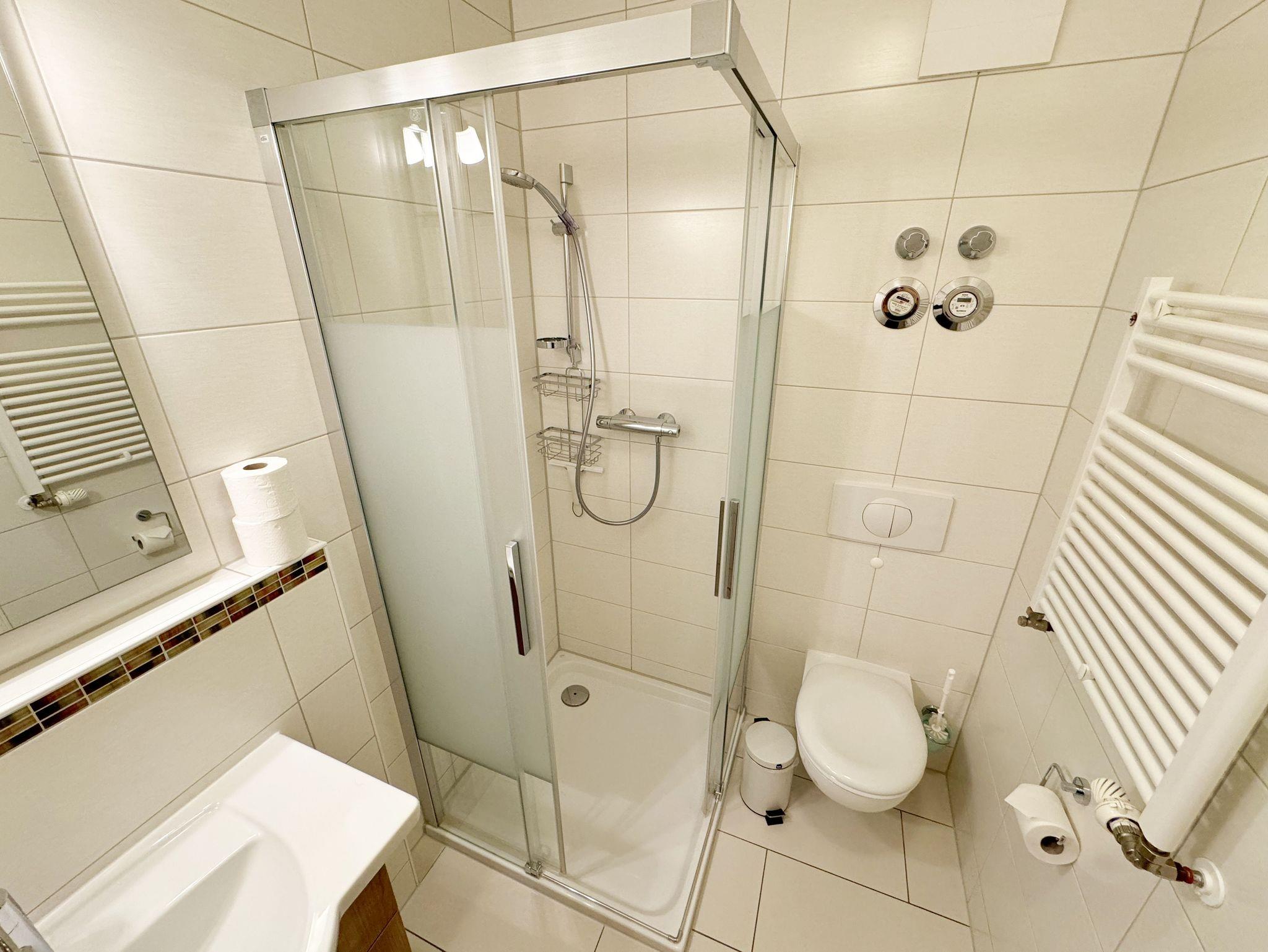 Das Bernsteinchen im Erdgeschoss der Kurparkresidenz Baabe, mit seinen ca. 40 qm, ist geräumiger als man denkt. Die mit viel Liebe zum Detail konzipierte Ferienwohnung ist von hoher Funktionalität und für max. 2 Erwachsene sowie 1 Kleinkind bis 3 Jahre vorgesehen. Nach Strandspaziergängen laden ein großzügiges Ledersofa, 2 kleine Couchtische und eine Anrichte mit einer klangvollen Mini-Stereo-Anlage mit Kassetten-Rekorder und CD-Player zum Relaxen ein. Der inklusive Internetanschluss (WLAN) und der HD-Flachbild-TV runden das Angebot ab. Die angrenzende hochwertige Einbauküche lässt keine Wünsche offen: sie ist ausgestattet mit Spülmaschine, Backofen und 4 Zonen-Ceranfeld, Dunstabzugshaube, Kühlschrank mit Gefrierfach, Mikrowelle, Kaffeemaschine, nickelfreiem Wasserkocher, Toaster, Handmixer inkl. Pürierstab und weiteren Küchenutensilien. Die beiden bestuhlten Terrassen (Ost-/Süd-Seite) sind vom lichtdurchfluteten Essbereich mit Essecke zu erreichen. Hochwertige Bodenfliesen mit Fußbodenheizung sorgen im gesamten Appartement für eine wohlige Raumatmosphäre. Viel Stauraum schaffen im Wohnbereich der maßangefertigte Einbauschrank mit deckenhohen Schiebetüren sowie der begehbare, großzügige Kleiderschrank mit großem Spiegelelement im Schlafzimmer. Hier bieten Ihnen sowohl das Doppelbett (1,60 m x 2,00 m) mit Qualitäts-Latexmatratzen und verstellbaren Lattenrosten, Nachttischablagen, dimmbares Licht, Lesebeleuchtungen sowie auch die Verdunklungsplissees und das Insektenschutzgitter alle Voraussetzungen für einen ruhigen Schlaf. Das Badezimmer verfügt über eine geräumige Dusche mit Eckeinstieg, WC, Fön, Waschtisch und eine Handtuchheizung. Plissee´s und Insektenschutzgitter finden sie auch im Wohnbereich. Für unsere kleinen Gäste stehen 1x Hochstuhl und 1x Kinderreisebett (ohne Zusatzmatratze und ohne Bett-Inlett) inklusive zur Verfügung. Ein eigener PKW-Stellplatz (Nr. 03) in der Tiefgarage, mit einer Einfahrtshöhe von 1,95 m, ist für Sie inklusive. Eine Waschmaschine und einen Trockner können Sie gegen eine Extragebühr im Keller nutzen. Von hier haben Sie die direkte Möglichkeit den Fahrstuhl bis zur Wohnung zu nutzen. Aufgrund der Allergikerfreundlichkeit versteht es sich von selbst, dass weder das Mitbringen von Haustieren noch das Rauchen in der Wohnung erlaubt sind. Die Erstausstattung eines Wäschepaketes (komplette Bettwäsche, 1 Duschhandtuch, 1 kleines Handtuch) können Sie bis 14 Tage vor Anreise gegen einen Aufpreis dazu buchen oder durch eigene ergänzen. Ab 2 gebuchten Paketen erhalten Sie einmalig 1 Geschirrhandtuch und 1 Duschvorleger hinzu.