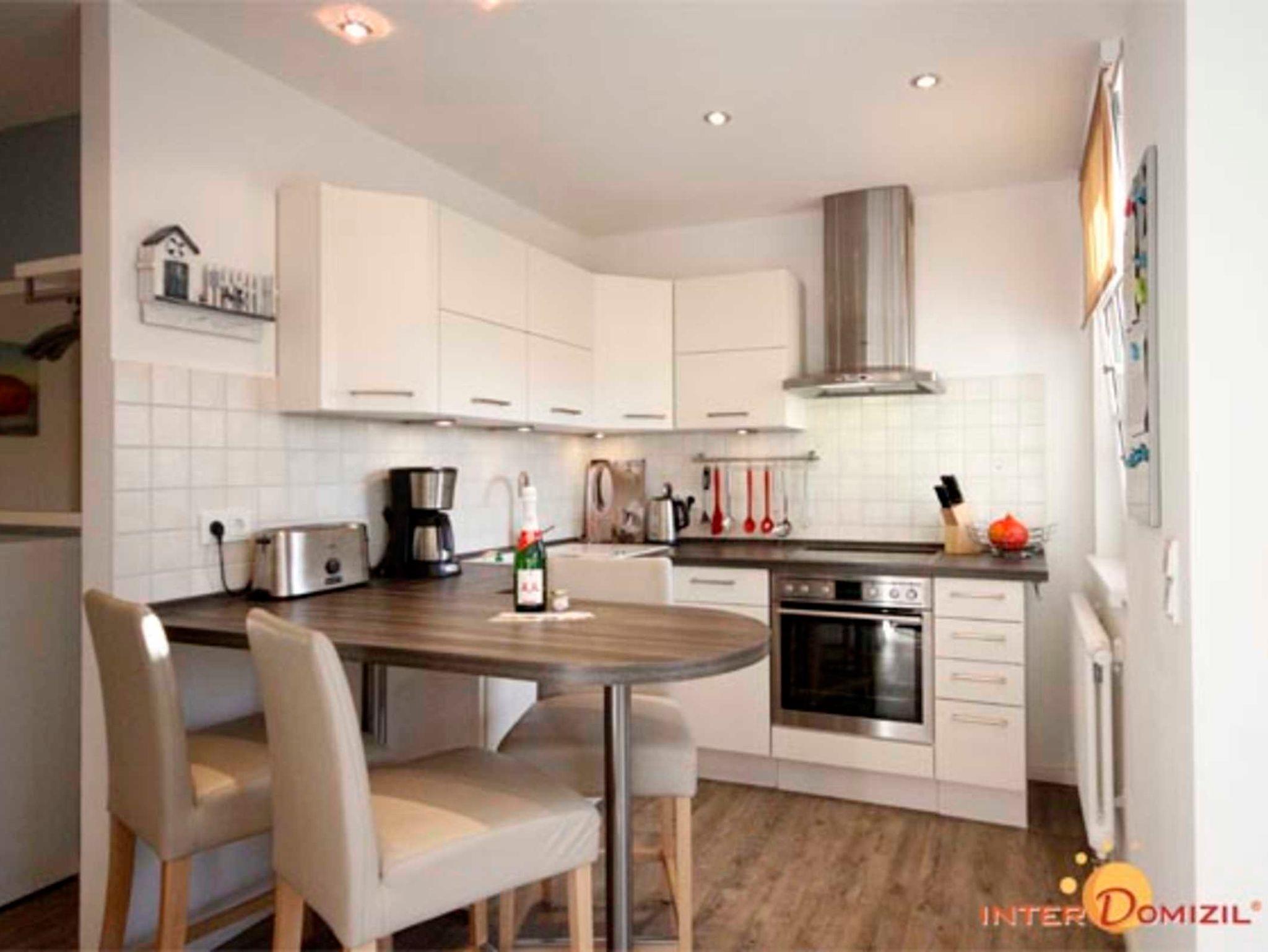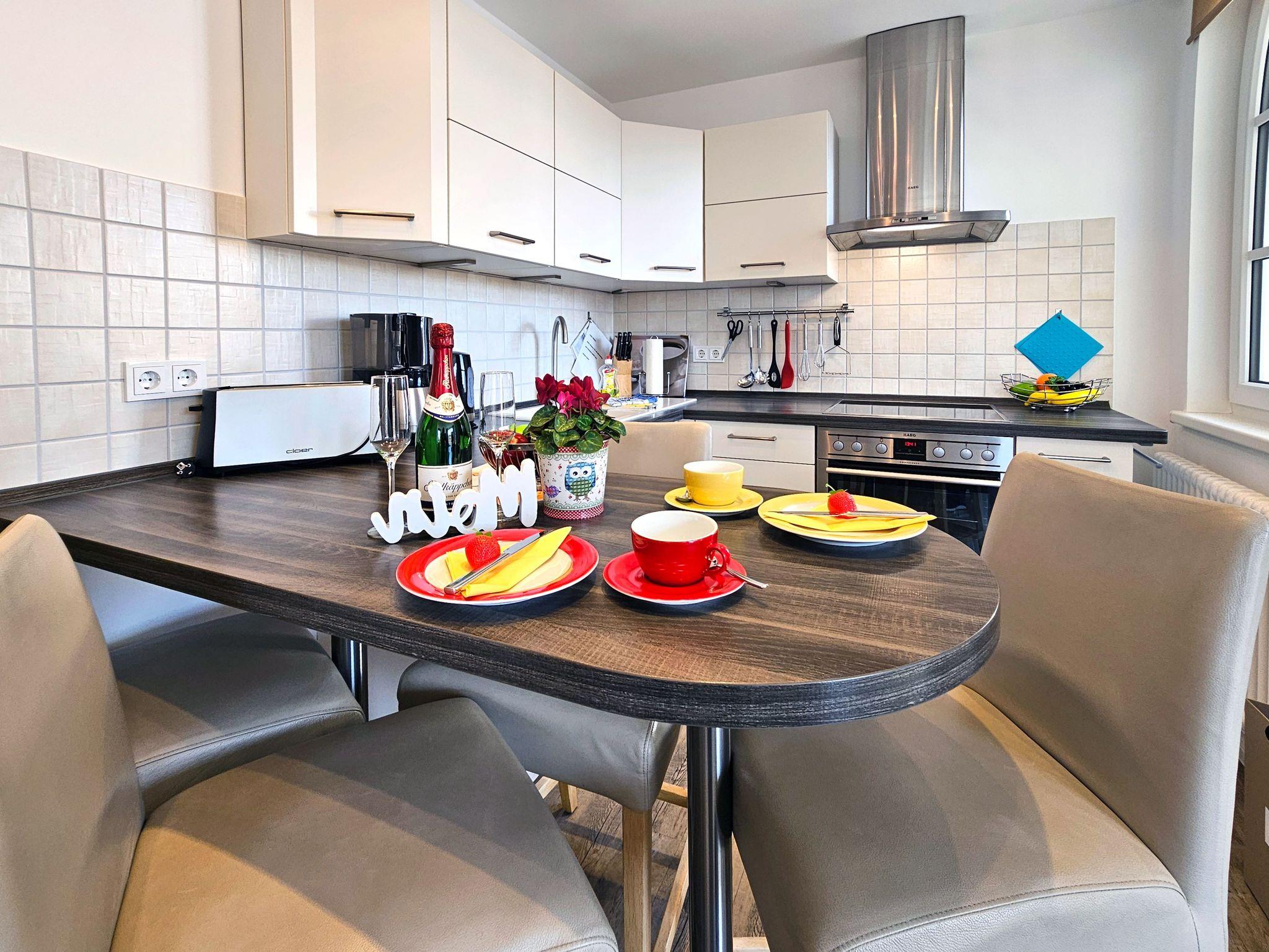 Die Wohnung hat einen großzügigen Wohn-/Essbereich, ausgestattet mit einer modernen Küchenzeile mit Esstisch sowie einem bequemen Sofa, TV mit DVD-Player, Radio und CD-Player.