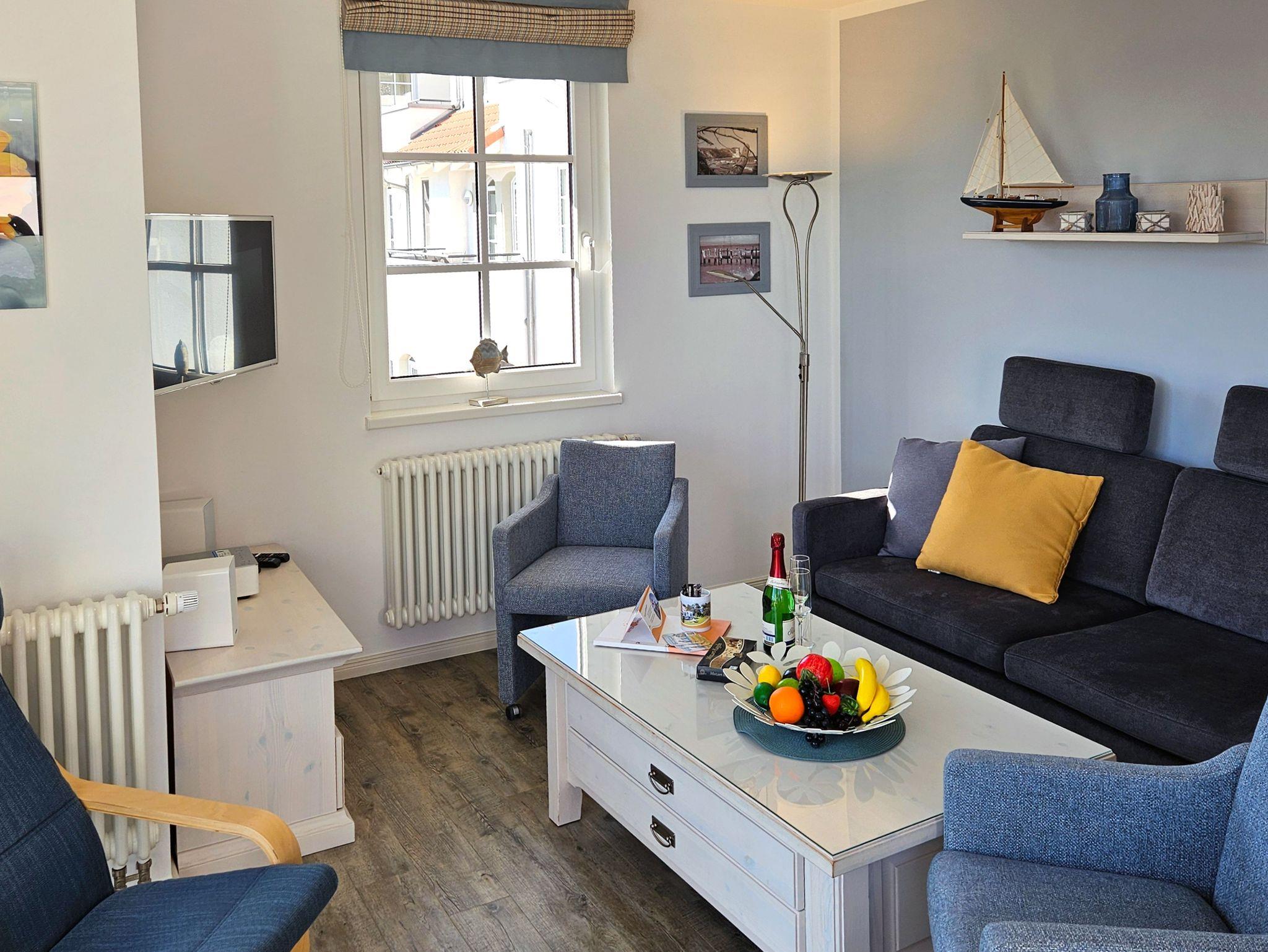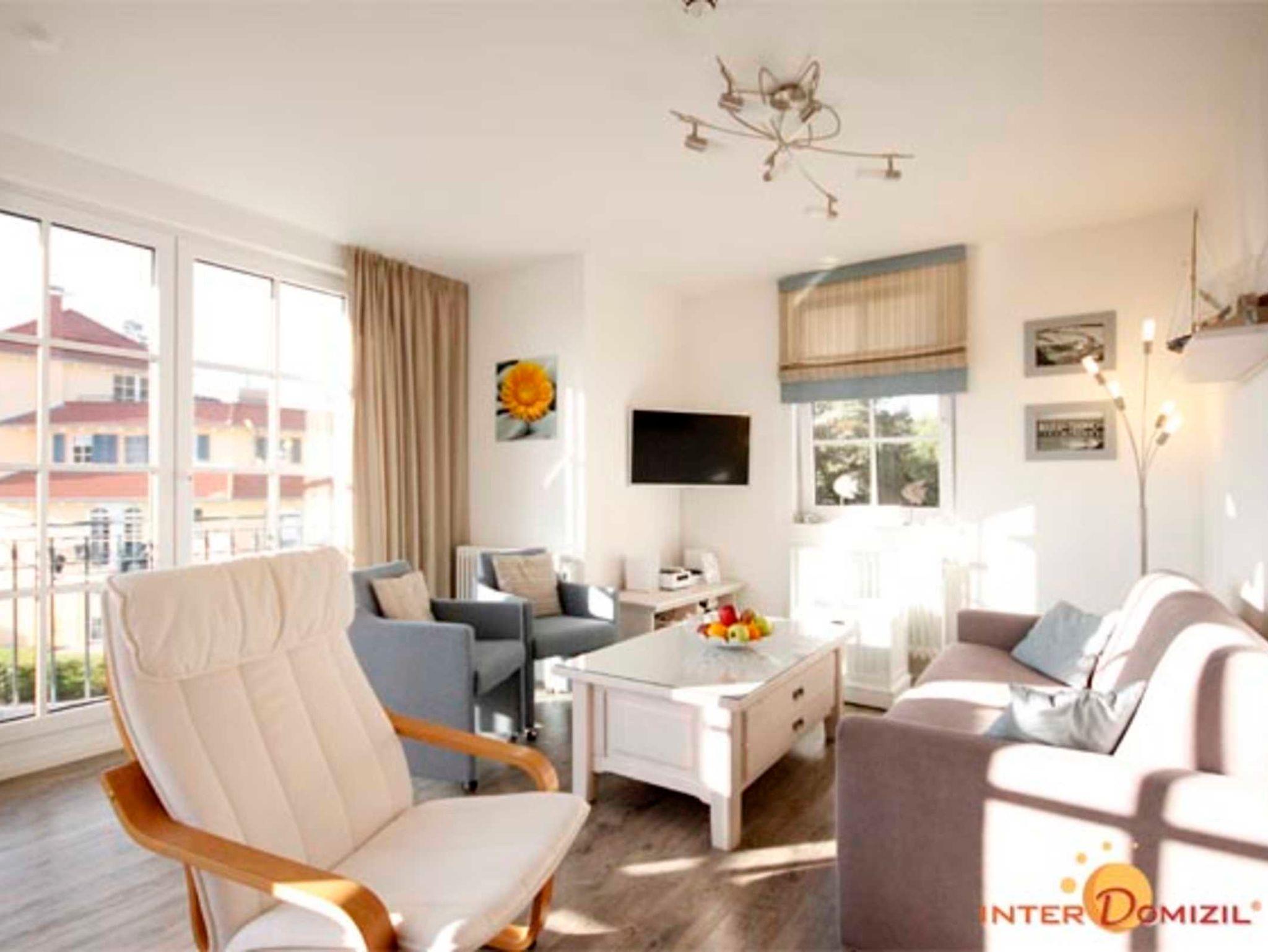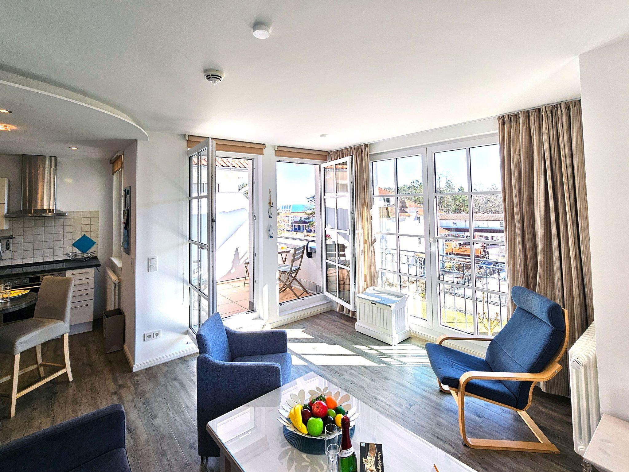 Die helle und komfortabel ausgestattete 3-Zimmer-Ferienwohnung Seebrise in großzügiger Ecklage mit Süd-Balkon und eingeschränktem Meerblick liegt ruhig in der dritten Etage der Residenz Haus Meeresblick.