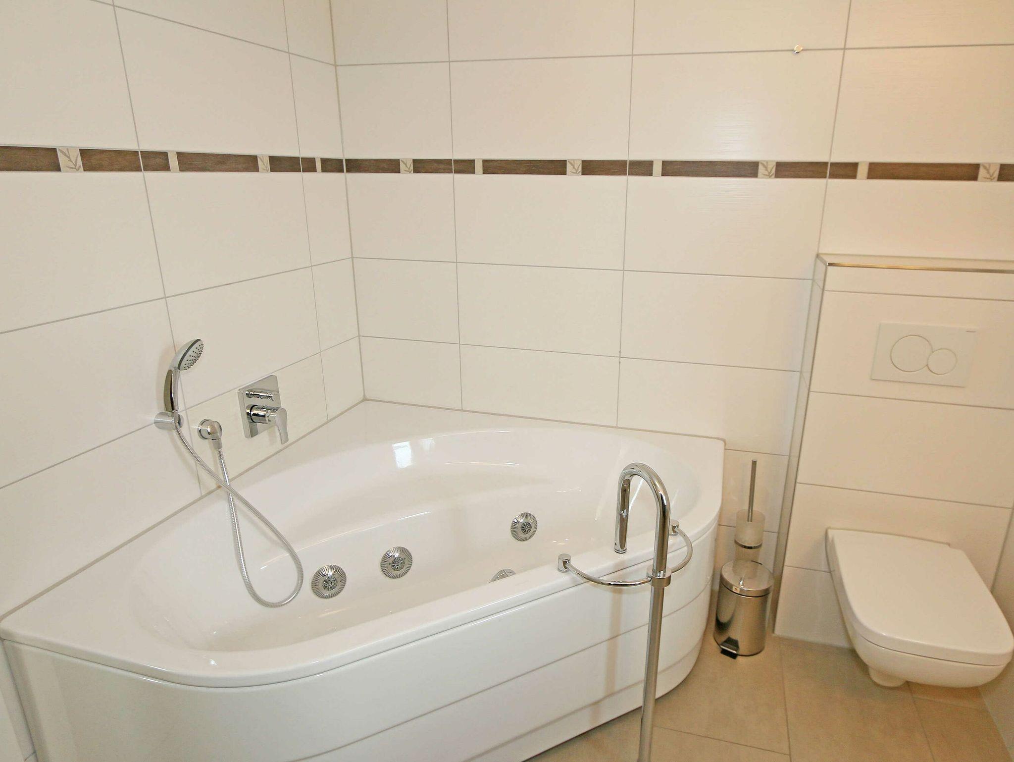 • großes Wellness-Bad mit Sauna, Whirlpool, bodengleicher Dusche, WC, Waschtisch, Handtuchhalter, Waschmaschine und Fön