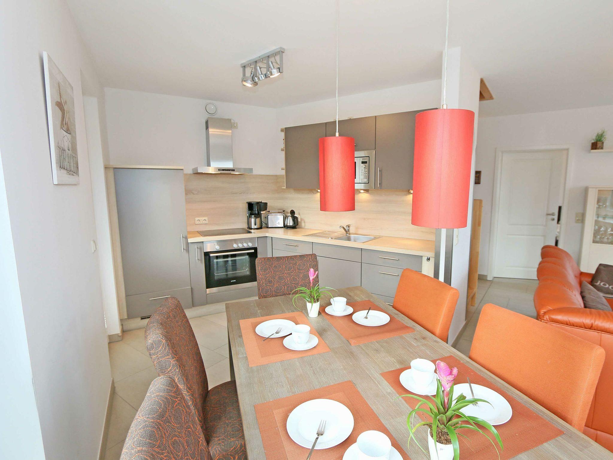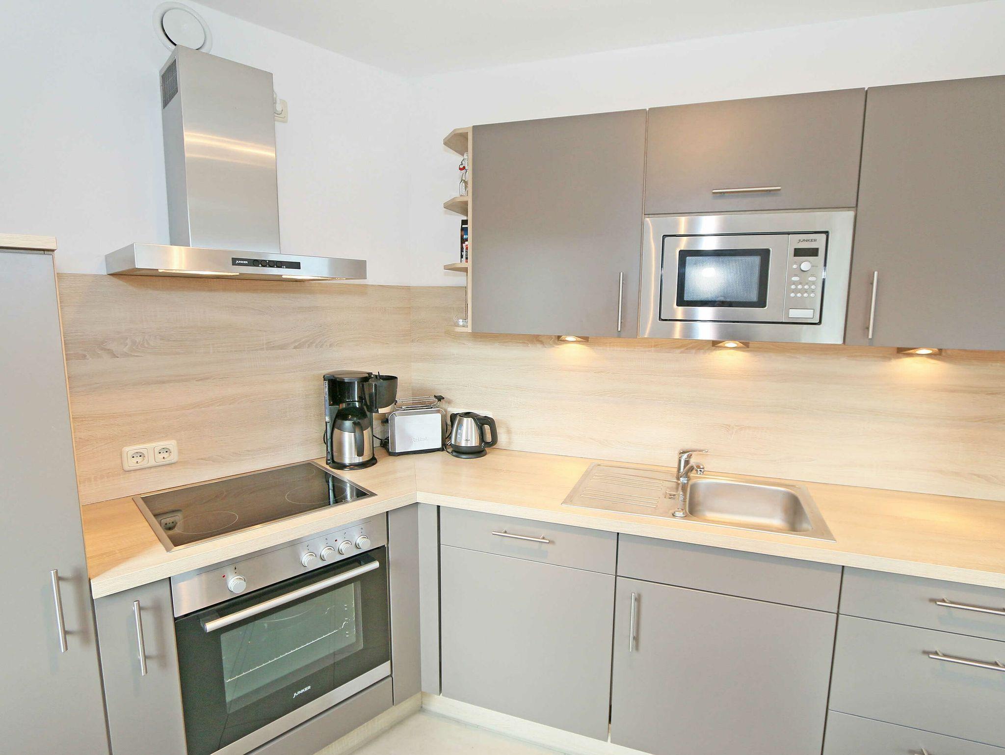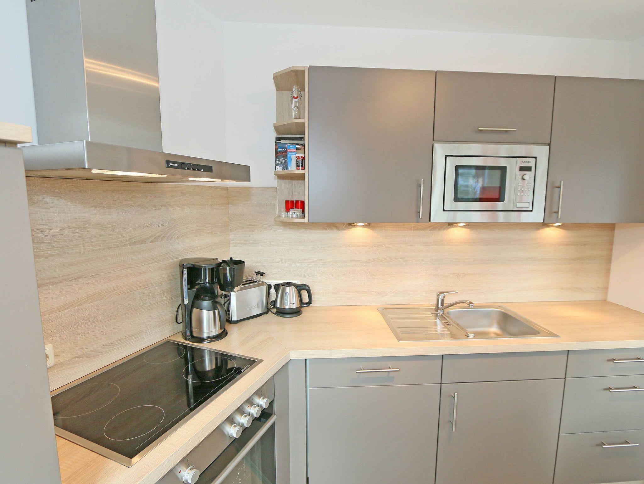 • Küchenzeile mit Geschirrspüler, Kühlschrank mit Gefrierfach, Backofen, 4 Zonen-Cerankochfeld, Mikrowelle, Kaffeemaschine, Toaster, Wasserkocher und diversen Küchenutensilien