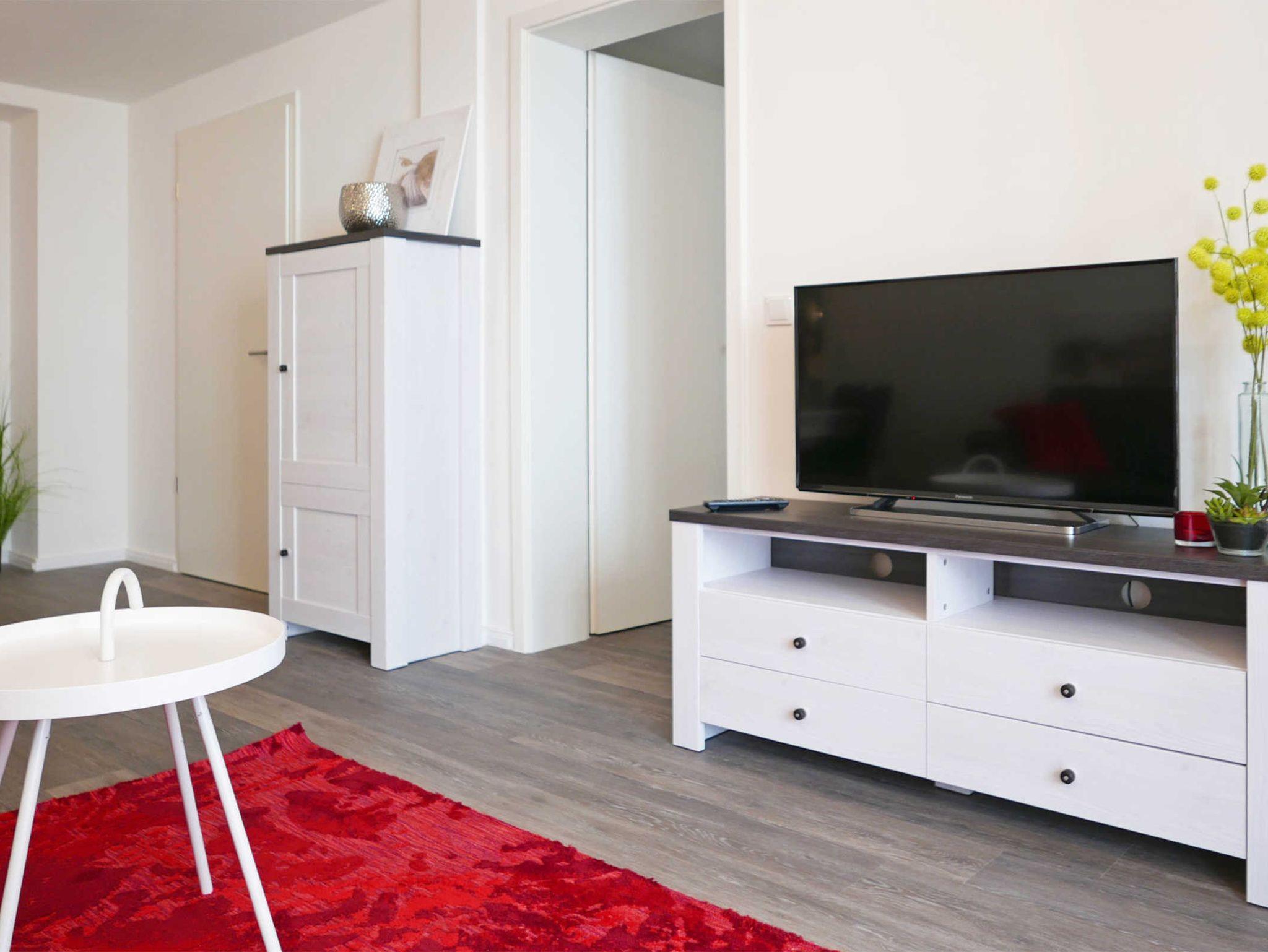 Gemütliche 3-Zimmer-Ferienwohnung für 3 Personen mit tollen roten Farbakzenten im Erdgeschoß des Hauses Meeresblick.