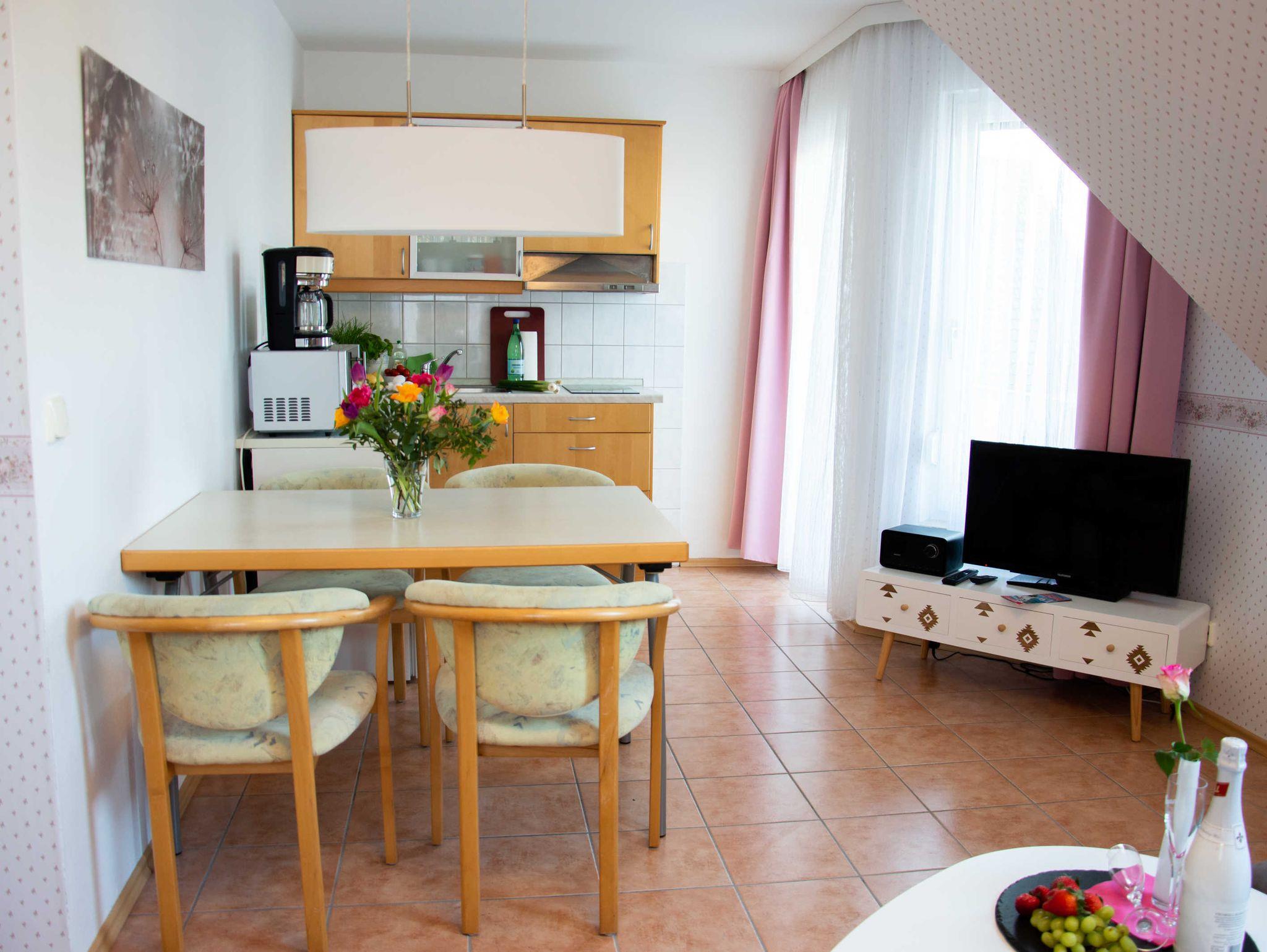 Das helle 2 Zimmerappartement befindet sich im 1. Stock. Die Wohnung hat einen separaten Eingang mit Flur und Garderobe. Sie bietet Ihnen eine Küche mit Essecke und vier Stühlen, ein Wohnzimmer mit Balkon, Flachbild-TV, Stereoanlage, Schlafzimmer mit Zustellbett und Badezimmer.