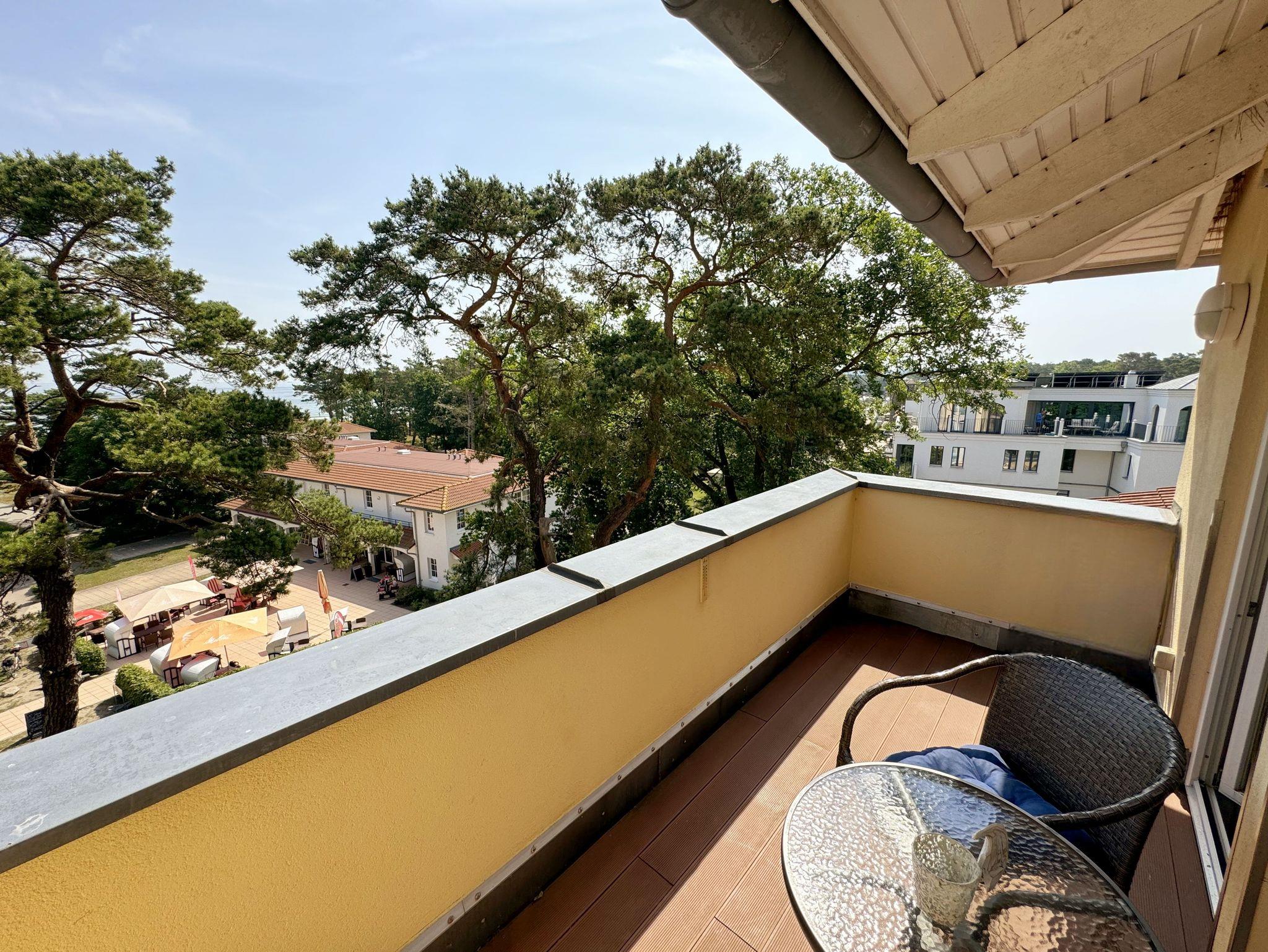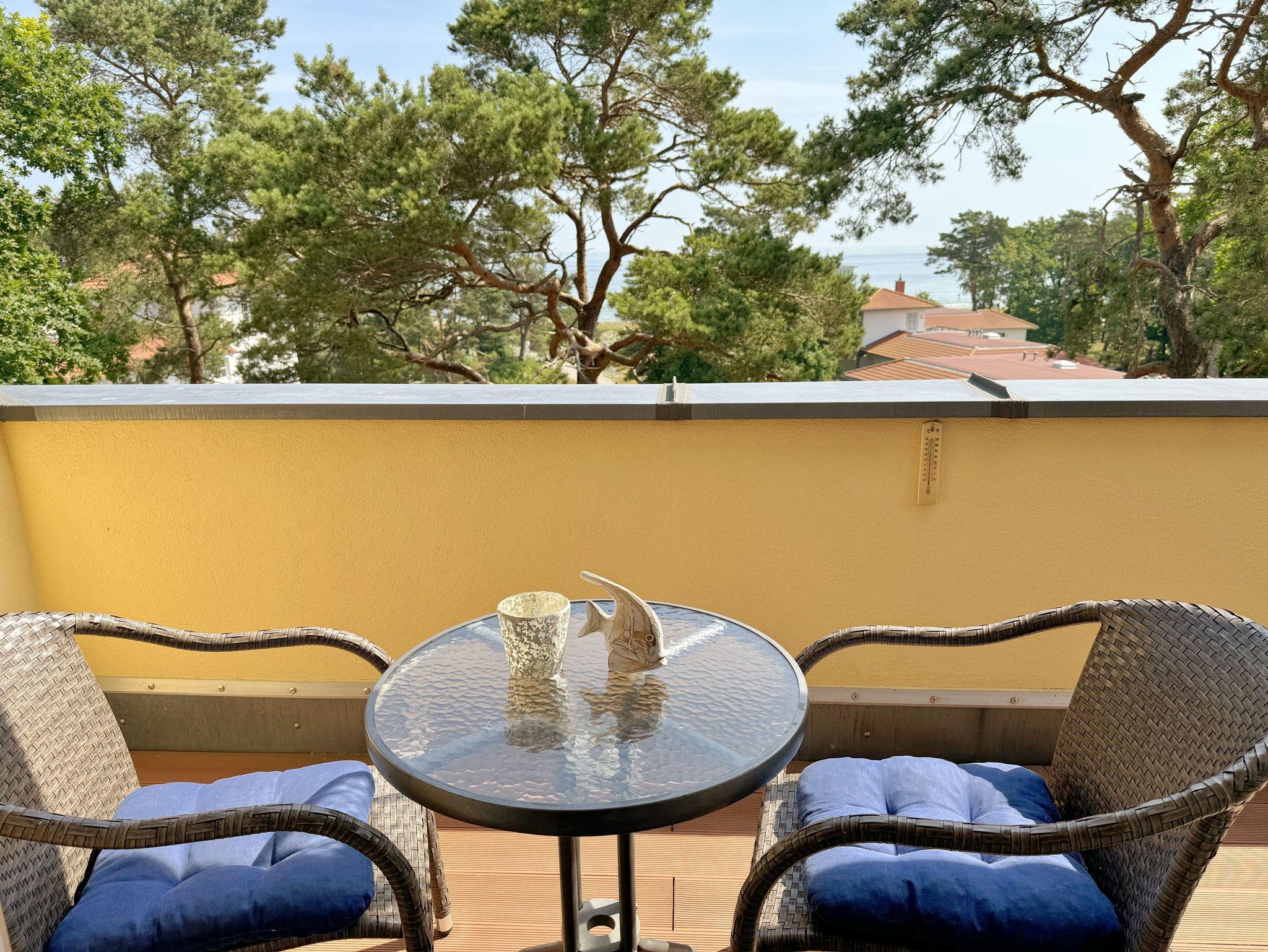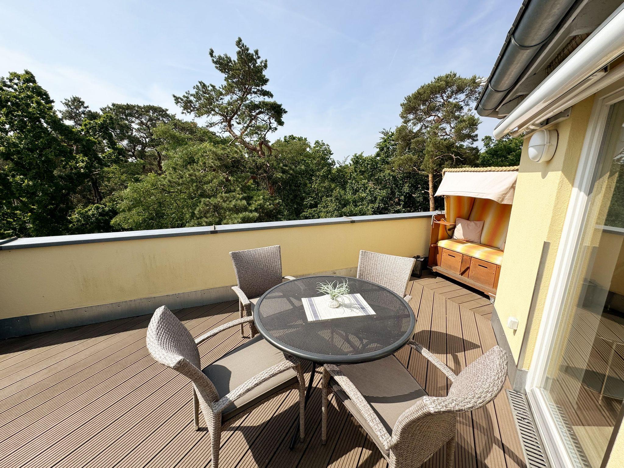 Die 48 qm große Nichtraucherwohnung bietet für max. 2 Erw. + 1 Kind 17 Jahre ein behagliches und gemütliches Ambiente. Sie befindet sich im Obergeschoss (Penthouse) und ist mit einem Aufzug bequem zu erreichen. Großzügige Fensterfronten lassen die Wohnung noch heller erscheinen. Vom Wohnzimmer aus gelangen Sie auf die große Dachterrasse, die mit einem schönen Blick (Süd bis West) in die umgebende Natur einlädt. Weiterhin verfügt die Dachterrasse über eine komplette Bestuhlung, elektrische Markise und einen Strandkorb, wo man den Sommerabend gemütlich und ungestört ausklingen lassen kann. Von dem Nordostbalkon (Schlafzimmer) kann man durch die Baumkronen die Ostsee (ca.100 m) sehen. Bei Wellengang hört man das Meer rauschen. Das Wohnzimmer verfügt über eine komplett eingerichtete Küchenzeile (Ceranfeld, Mikrowelle mit Backfunktion, Kühlschrank, Geschirrspüler) und diversen Küchenutensilien. Weiterhin befindet sich im Wohnzimmer ein Smart-TV, Bluetooth Soundbox mit DAB-Radio, Leselampe und einer Schlafcouch, 1,50m x 2,00m die in wenigen Handgriffen zur Schlafstätte umgebaut werden kann. Das Bad besteht aus Dusche und WC sowie einen Fön. Das Schlafzimmer verfügt über einen Kleiderschrank, Doppelbett (1,80m x 2,00m), verstellbare Lattenroste und Nachttischkonsolen und LED-TV. Vom Schlafzimmer aus können Sie den Balkon betreten und auf die Ostsee schauen. Wohnraum und Bad verfügen über Fußbodenheizung. Im Kellergeschoss befindet sich ein Waschraum (Waschmaschine/Trockner) sowie eine Sauna gegen Extragebühr. Einen Fahrradständer haben Sie direkt vor dem Haus. Auch im Urlaub brauchen Sie in der Wohnung nicht auf einen Internetanschluss (WLAN/LAN) verzichten. Dieser ist für Sie inklusive!!! Ein PKW-Stellplatz (Nr.21) ist direkt vor dem Haus. Haustiere sind nicht erlaubt. Die Erstausstattung eines Wäschepaketes (komplette Bettwäsche, 1 Duschhandtuch, 2 kleine Handtücher) können Sie bis 14 Tage vor Anreise gegen einen Aufpreis dazu buchen oder durch eigene ergänzen. Ab 2 gebuchten Paketen erhalten Sie einmalig 1 Geschirrhandtuch und 1 Duschvorleger hinzu.