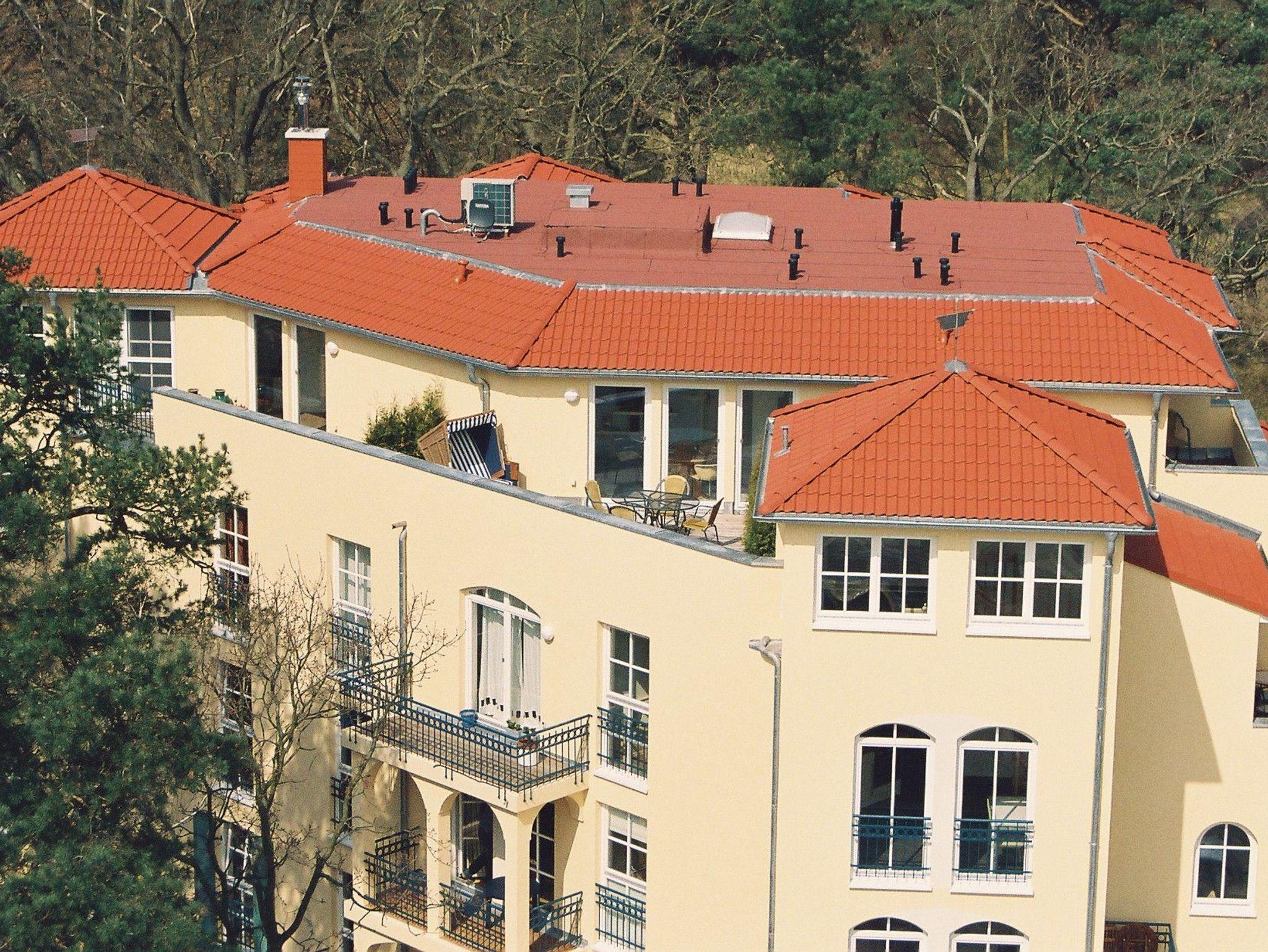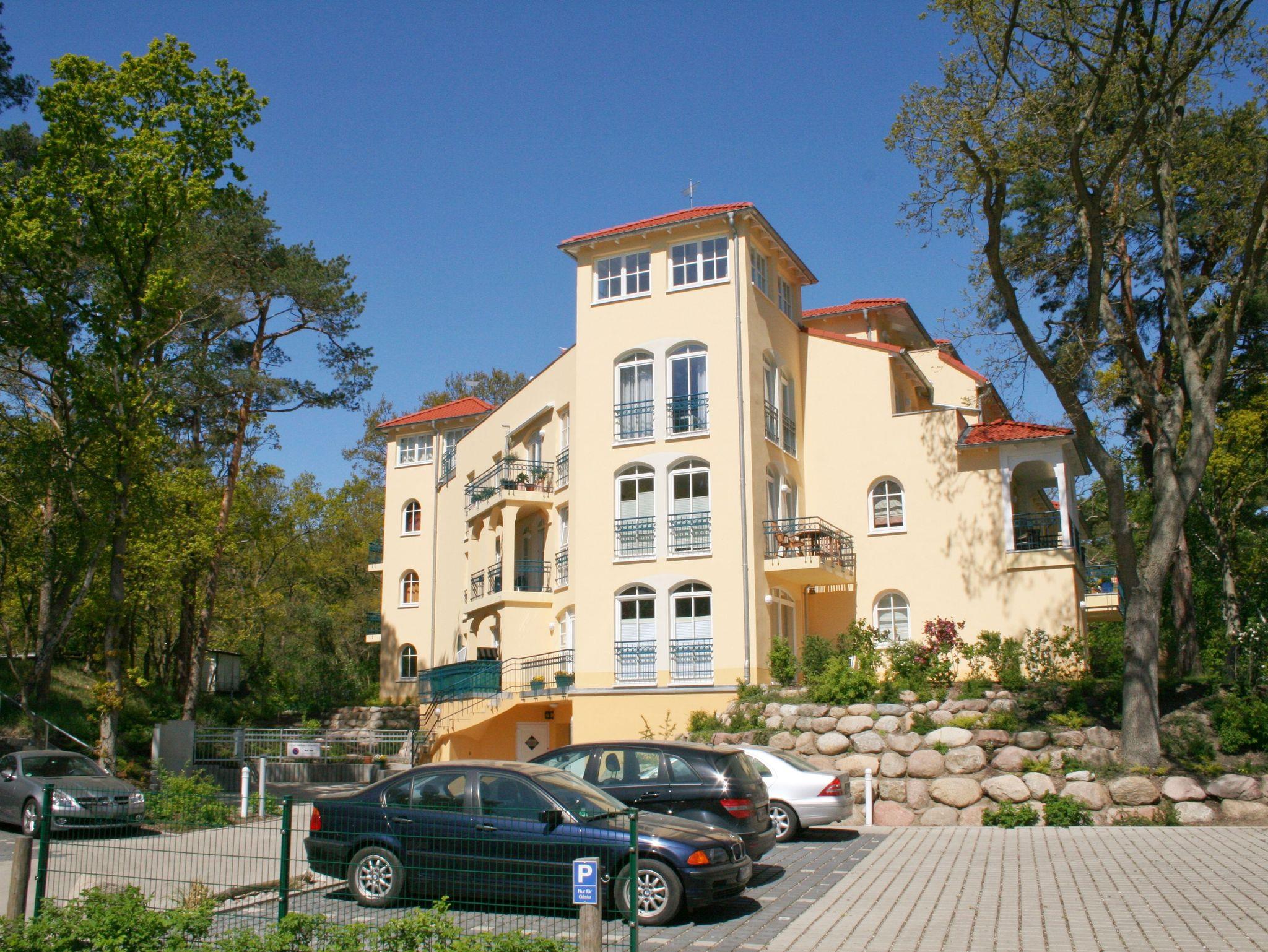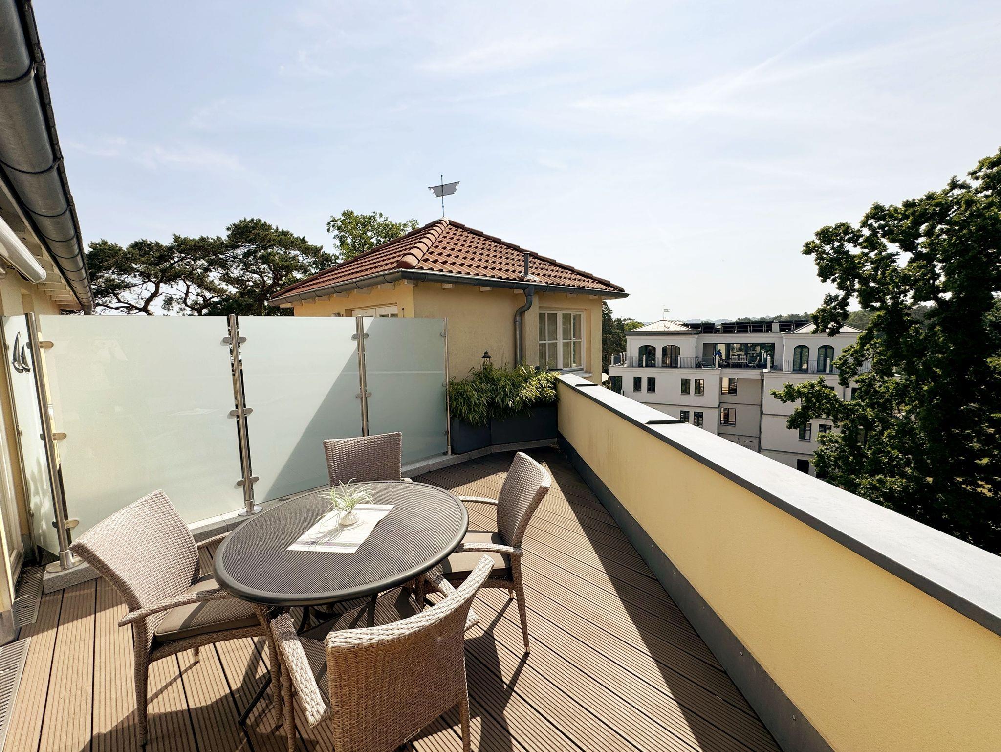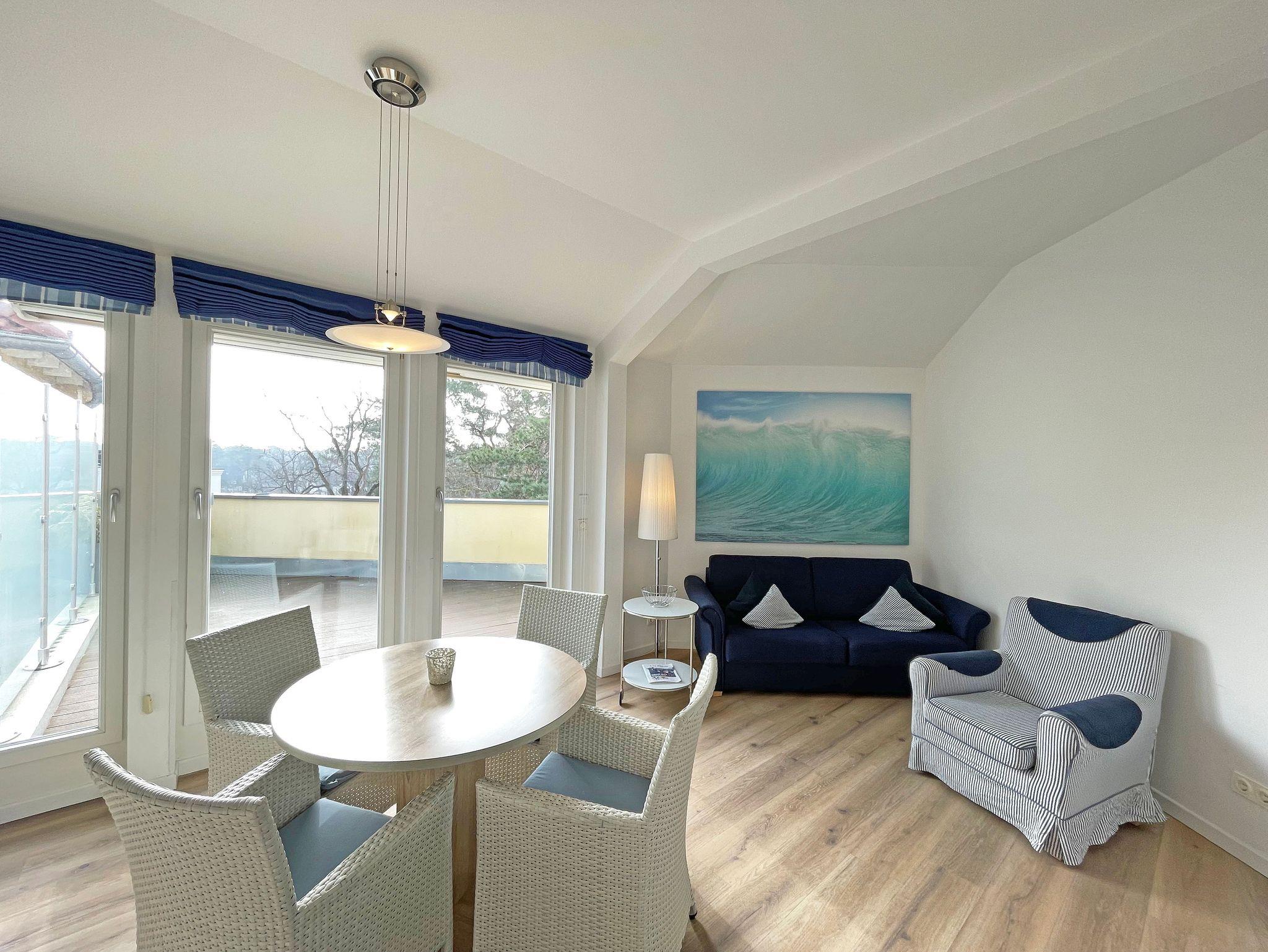 Die 48 qm große Nichtraucherwohnung bietet für max. 2 Erw. + 1 Kind 17 Jahre ein behagliches und gemütliches Ambiente. Sie befindet sich im Obergeschoss (Penthouse) und ist mit einem Aufzug bequem zu erreichen. Großzügige Fensterfronten lassen die Wohnung noch heller erscheinen. Vom Wohnzimmer aus gelangen Sie auf die große Dachterrasse, die mit einem schönen Blick (Süd bis West) in die umgebende Natur einlädt. Weiterhin verfügt die Dachterrasse über eine komplette Bestuhlung, elektrische Markise und einen Strandkorb, wo man den Sommerabend gemütlich und ungestört ausklingen lassen kann. Von dem Nordostbalkon (Schlafzimmer) kann man durch die Baumkronen die Ostsee (ca.100 m) sehen. Bei Wellengang hört man das Meer rauschen. Das Wohnzimmer verfügt über eine komplett eingerichtete Küchenzeile (Ceranfeld, Mikrowelle mit Backfunktion, Kühlschrank, Geschirrspüler) und diversen Küchenutensilien. Weiterhin befindet sich im Wohnzimmer ein Smart-TV, Bluetooth Soundbox mit DAB-Radio, Leselampe und einer Schlafcouch, 1,50m x 2,00m die in wenigen Handgriffen zur Schlafstätte umgebaut werden kann. Das Bad besteht aus Dusche und WC sowie einen Fön. Das Schlafzimmer verfügt über einen Kleiderschrank, Doppelbett (1,80m x 2,00m), verstellbare Lattenroste und Nachttischkonsolen und LED-TV. Vom Schlafzimmer aus können Sie den Balkon betreten und auf die Ostsee schauen. Wohnraum und Bad verfügen über Fußbodenheizung. Im Kellergeschoss befindet sich ein Waschraum (Waschmaschine/Trockner) sowie eine Sauna gegen Extragebühr. Einen Fahrradständer haben Sie direkt vor dem Haus. Auch im Urlaub brauchen Sie in der Wohnung nicht auf einen Internetanschluss (WLAN/LAN) verzichten. Dieser ist für Sie inklusive!!! Ein PKW-Stellplatz (Nr.21) ist direkt vor dem Haus. Haustiere sind nicht erlaubt. Die Erstausstattung eines Wäschepaketes (komplette Bettwäsche, 1 Duschhandtuch, 2 kleine Handtücher) können Sie bis 14 Tage vor Anreise gegen einen Aufpreis dazu buchen oder durch eigene ergänzen. Ab 2 gebuchten Paketen erhalten Sie einmalig 1 Geschirrhandtuch und 1 Duschvorleger hinzu.