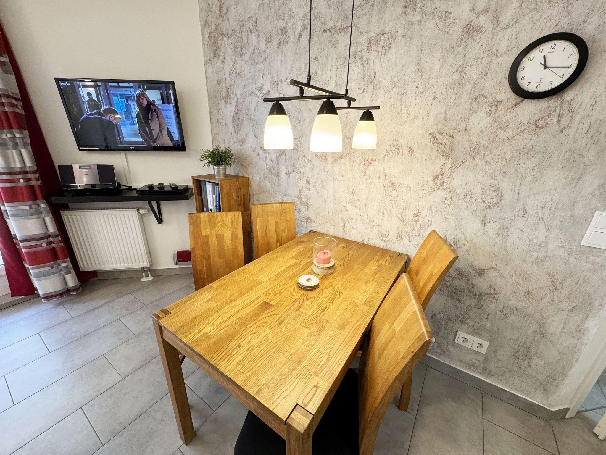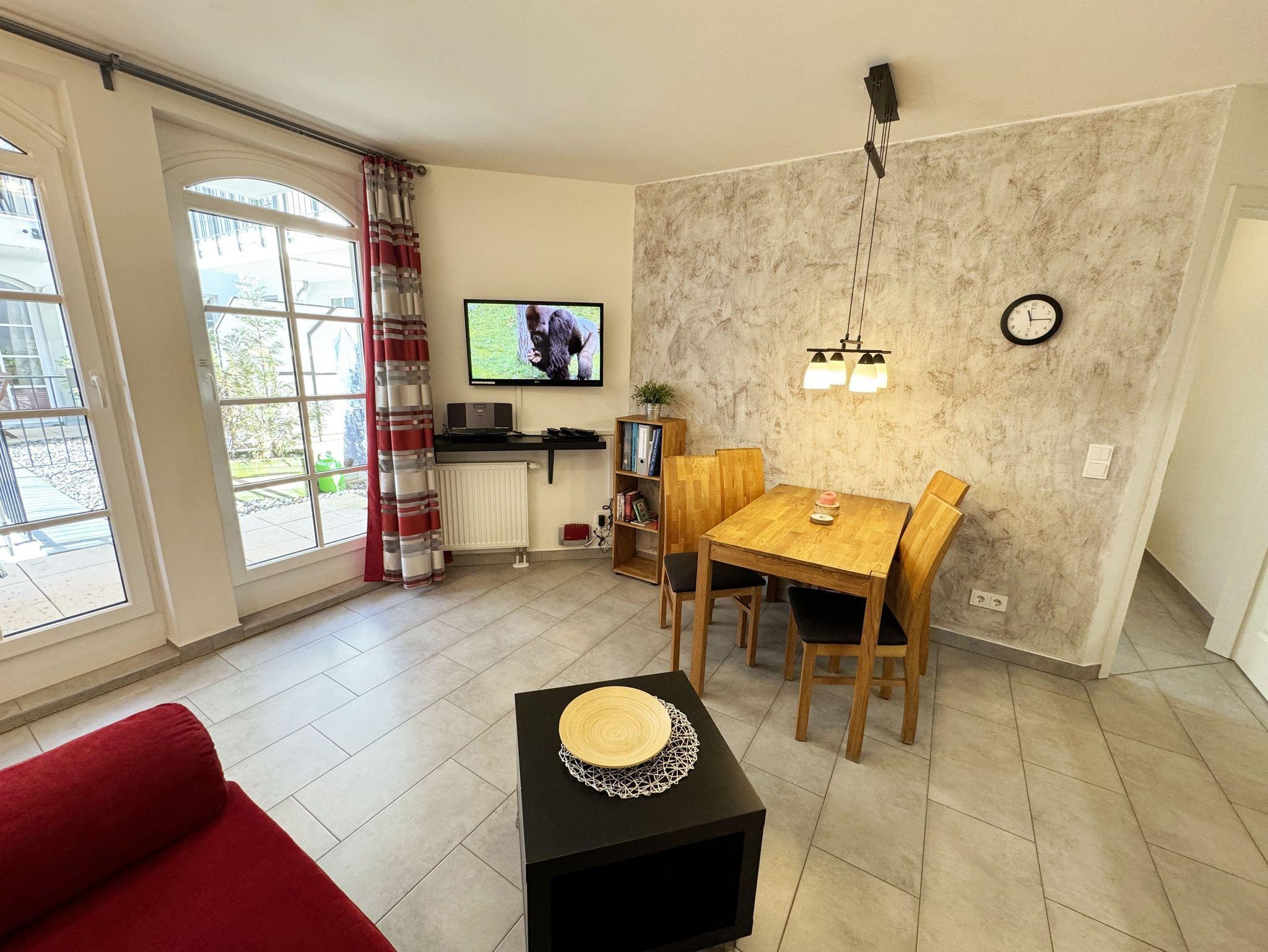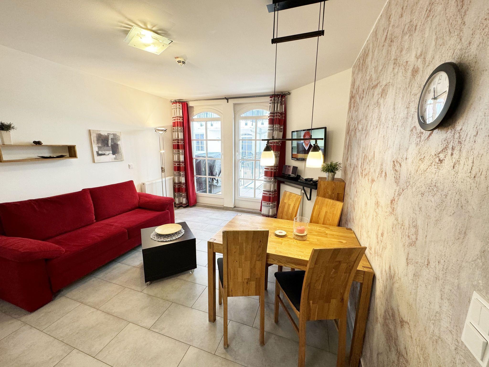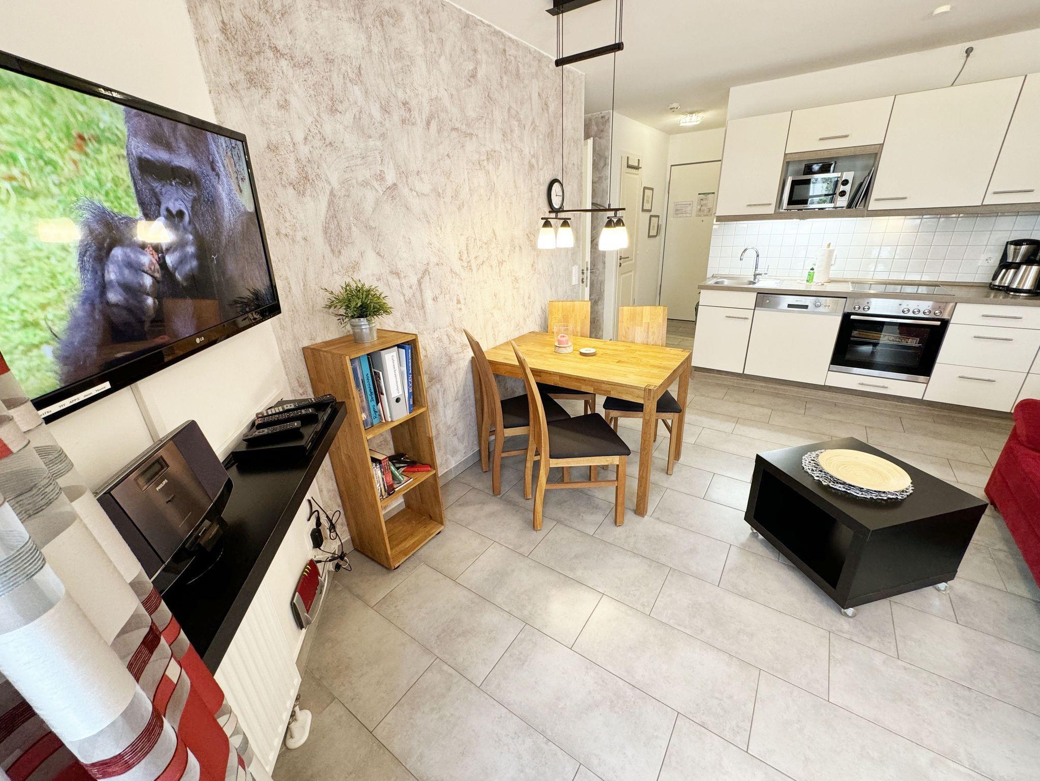 Ihre Nichtraucher/Ferienwohnung Nautica ist mit viel Liebe zum Detail ausgestattet und eingerichtet worden. Sie wohnen in einer ca. 40 qm 2-Zimmer Wohnung, die für 2 bis 4 Personen ausgelegt ist. Die Wohnung befindet sich in der 1. Etage und ist per Fahrstuhl bequem zu erreichen. In der Wohnung finden Sie einen kombinierten Wohn/Koch- und Essbereich. Die integrierte geräumige Küchenzeile lässt mit Mikrowelle, Backofen, Ceranfeld, Spülmaschine, Kühlschrank mit Gefrierfach, Kaffeemaschine und anderen praktischen Helfern keine Wünsche offen. Im Wohnbereich ist weiterhin eine Essecke und eine gemütliche Couch vorhanden, die in wenigen Handgriffen zur 2. Schlafstätte (Schlafcouchmaße 1,60 x 2,00 m) umfunktioniert werden kann. Abgerundet wird der Wohnbereich mit einem Smart-TV, Blu-Ray Player, Leselampe und einer Musikanlage mit DAB-Radio. Auch auf einen Internetanschluss (WLAN) müssen Sie im Urlaub nicht verzichten. Dieser ist für Sie inklusive! Der Balkon ist vom Wohn/Essbereich begehbar und komplett möbliert. Das Schlafzimmer ist mit einem Doppelbett (1,60m x 2,00m), Nachttischkonsolen, kleinem Flachbildschirm und einem begehbaren Kleiderschrank sowie ein Insektenschutzgitter ausgestattet. Auch 1x Kinderreisebett (ohne Matratze und Bett Inlett) sowie 1x Kinderhochstuhl werden unseren kleinen Gästen zur Verfügung gestellt (inklusive). Das Bad verfügt über eine ebenerdige Dusche, Waschbecken, Kosmetikspiegel, Fön, WC und Handtuchheizkörper. Ein eigener PKW-Stellplatz (Nr.23, Einfahrtshöhe 2,00m) befindet sich in der Tiefgarage des Hauses. Auch 1 Hund ist gegen eine Gebühr ein gern gesehener Gast in der Wohnung. Im Keller des Hauses haben Sie die Möglichkeit eine Waschmaschine/Trockner gegen Gebühr zu nutzen. Mit dem Fahrstuhl des Hauses A gelangen sie in das Untergeschoss der Meeresblickanlage, wo Sie ein großzügiger und heller Wellnessbereich erwartet. Hier können sie in einem Pool kleine Bahnen schwimmen, in 2 Saunen Ihren Kreislauf in Schwung bringen, in einem dazugehörigen Ruheraum Ihren Körper wieder beruhigen, in einer Schneckendusche sowie weiteren Duschen das kühle Nass genießen und auf einer Außenterrasse mit Außendusche die frische Luft einatmen. Die Erstausstattung eines Wäschepaketes (komplette Bettwäsche, 1 Duschhandtuch, 2 kleine Handtücher) können Sie bis 14 Tage vor Anreise gegen einen Aufpreis dazu buchen oder durch eigene ergänzen. Ab 2 gebuchten Paketen erhalten Sie einmalig 1 Geschirrhandtuch und 1 Duschvorleger hinzu.
