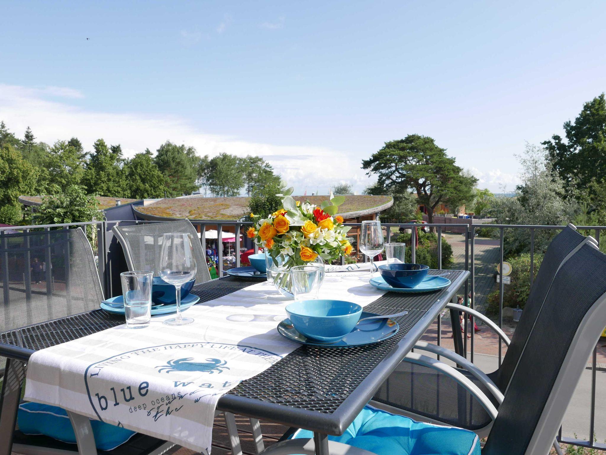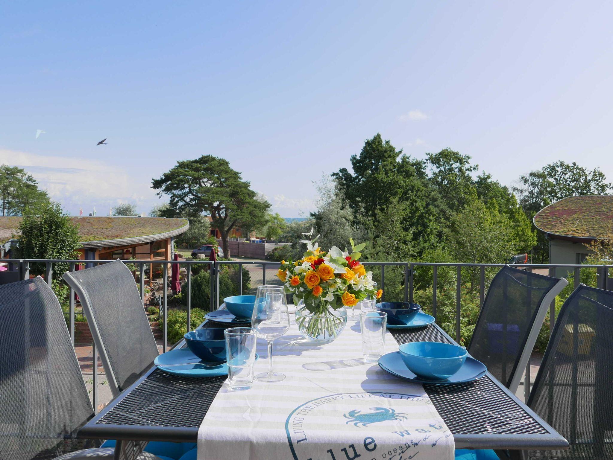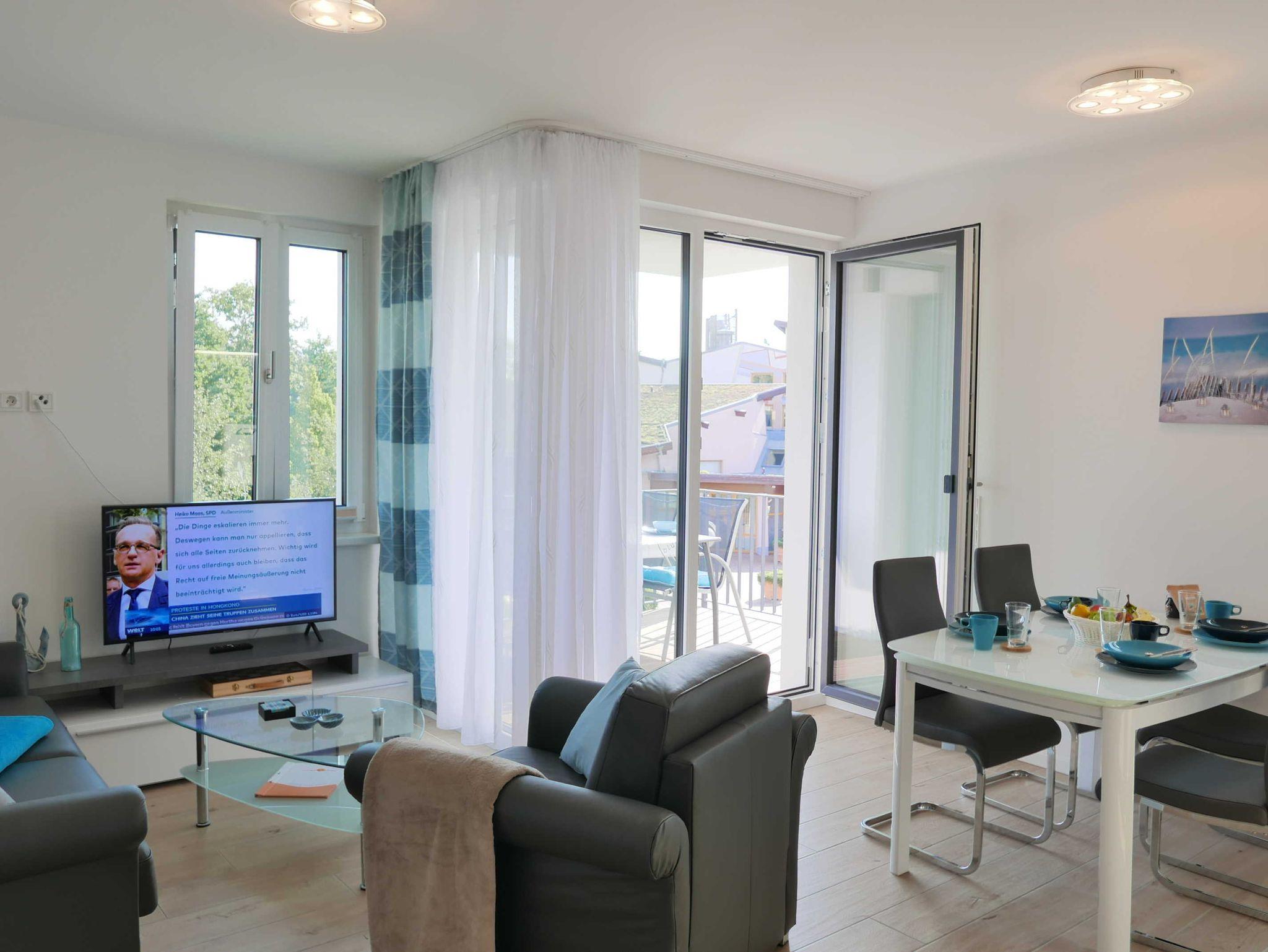 Helle moderne Ferienwohnung mit Meerblick vom Balkon für 4 Personen vis a vis dem Meer und Strand. Sie ist gelegen im ersten Obergeschoss der Villa Strandläufer vom Villen-Ensemble Baabe.