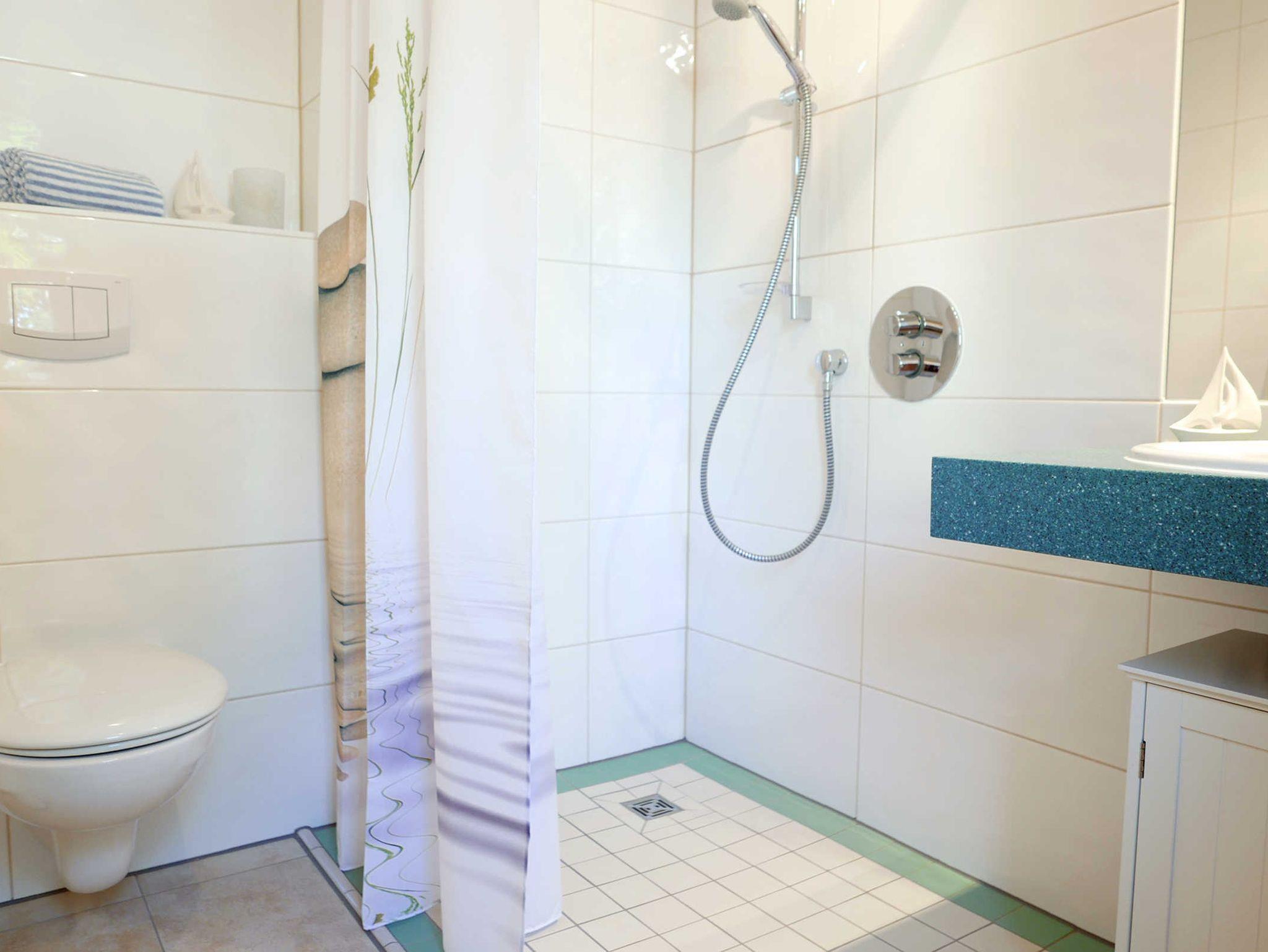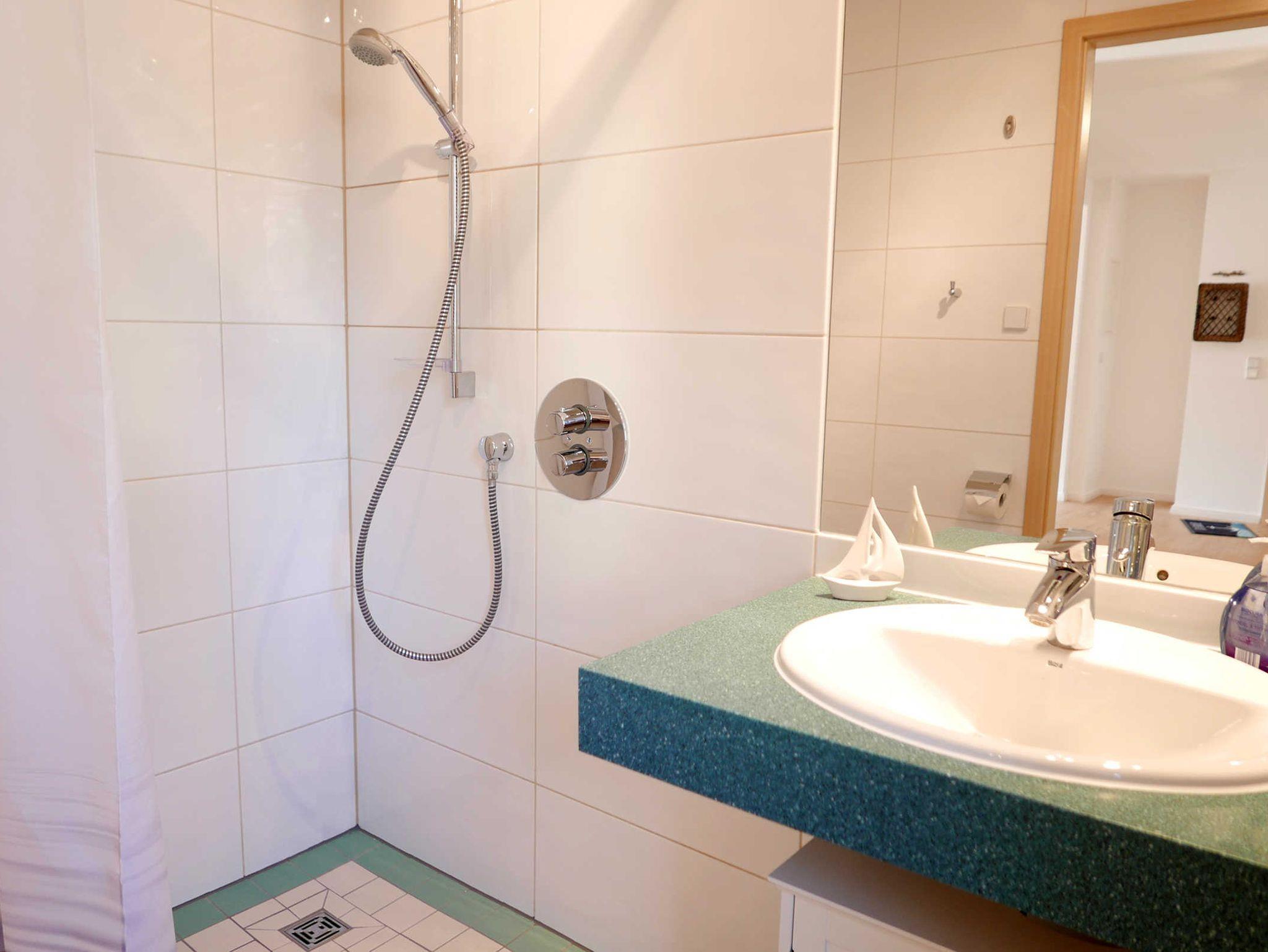 Das großzügige Badezimmer trumpft mit einer ebenerdigen Dusche, einem großem Waschtisch und einem Fön auf.