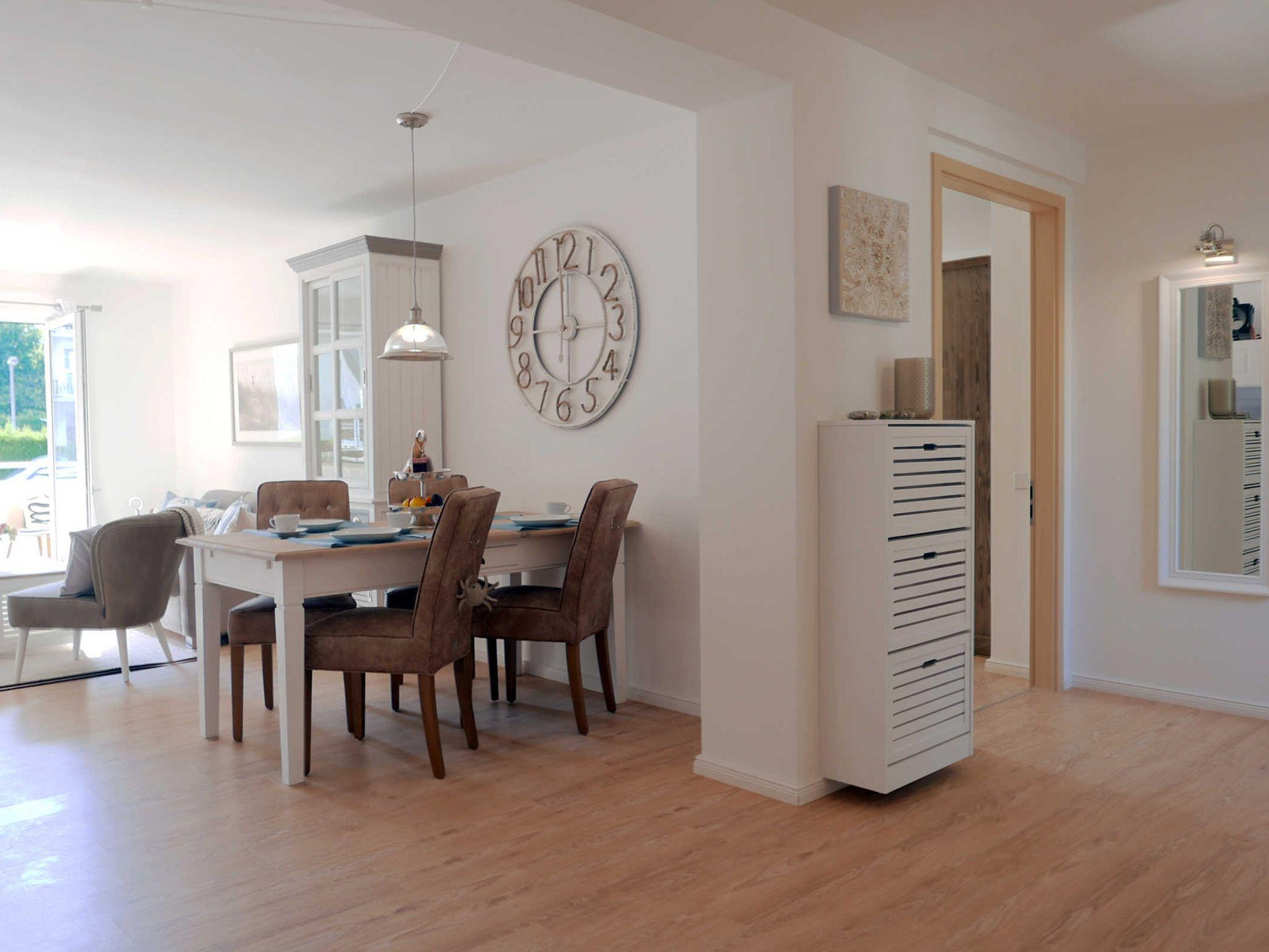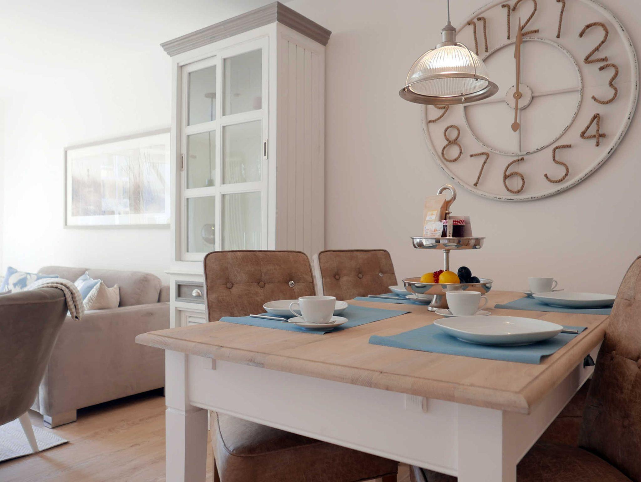 Das Wohnzimmer ist hochwertig ausgestattet mit einem gemütlichen Sofabereich in hellen Farben und einem Flachbildfernseher. Das Sofa lässt sich bei Bedarf zu einem Schlafsofa umfunktionieren (160x200cm). Ein Esstisch mit 4 Sitzplätzen befindet sich ebenfalls in diesem Zimmer. Von hier hat man auch den Zugang zu dem Balkon.