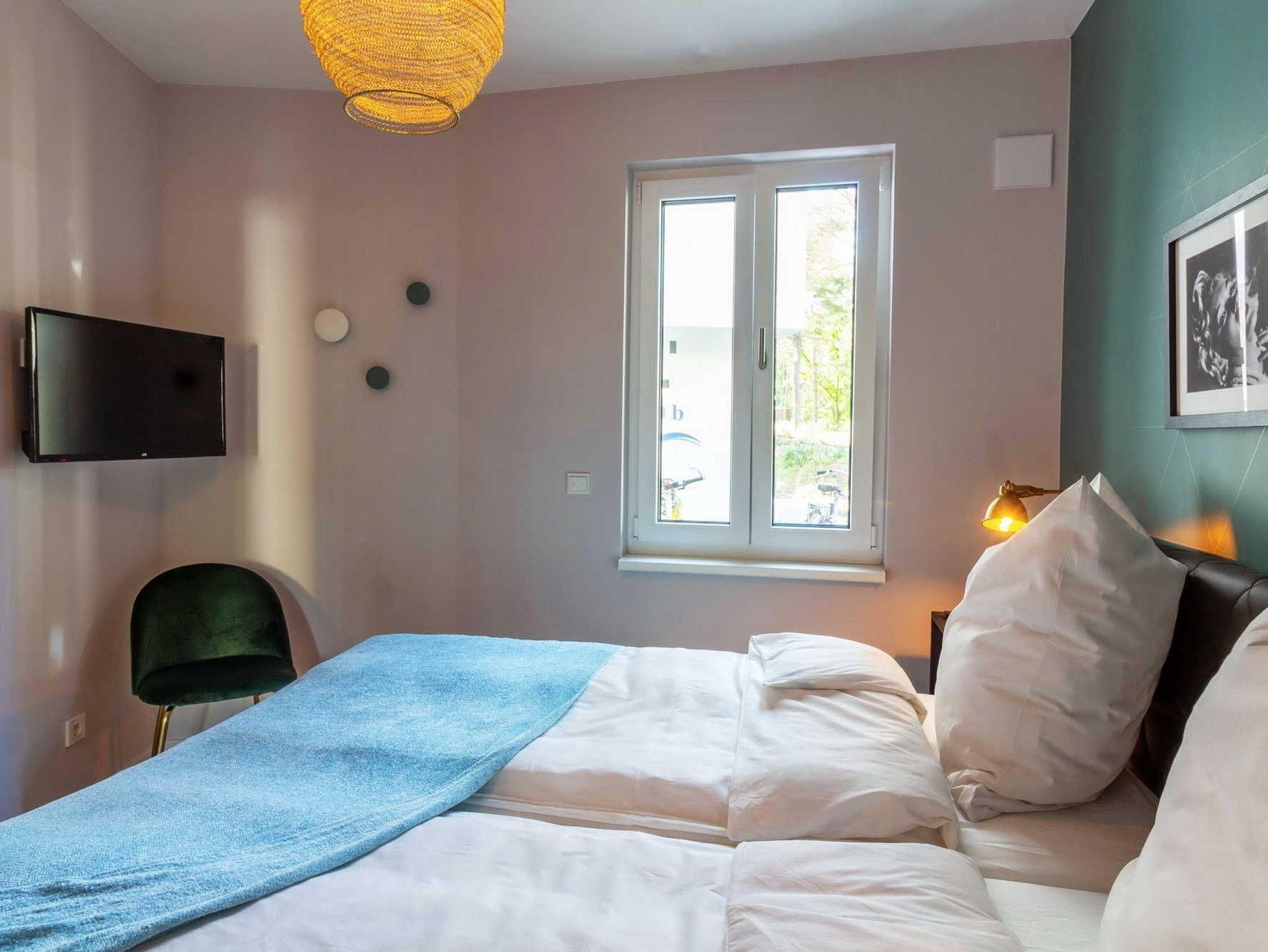 Das 180x200m große Boxspringbett mit zwei separaten Matratzen sorgt für Erholung in der Nacht. Natürlich befindet sich auch hier ein 32“ Smart TV. Ebenfalls finden Sie hier eine Gepäckablage und ein Schwebetürenschrank mit ausreichend Stauraum.
