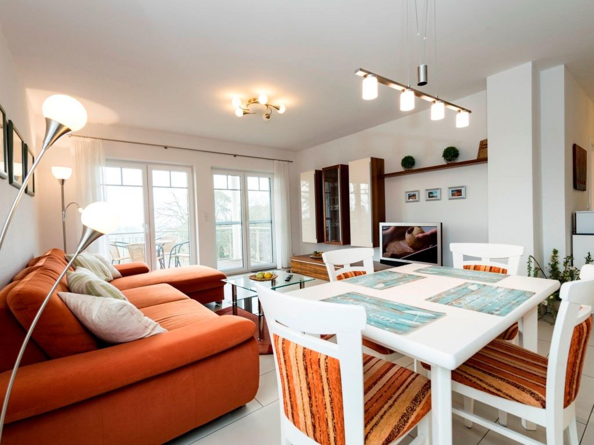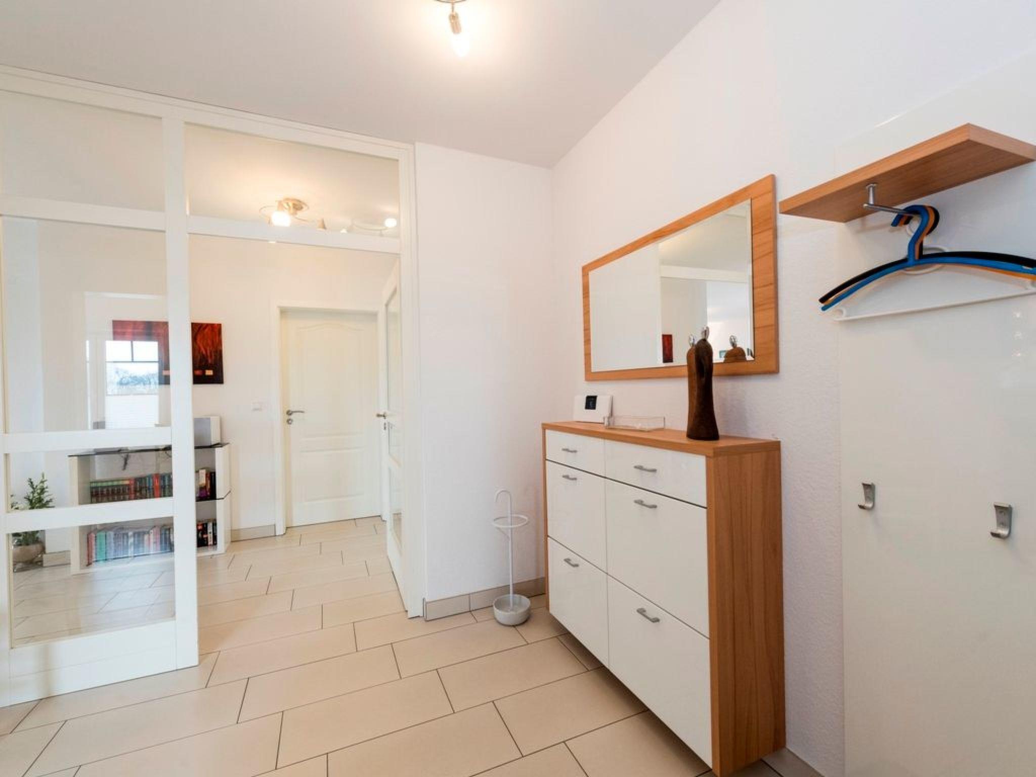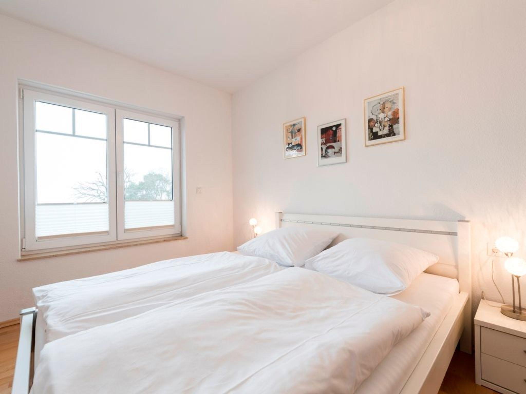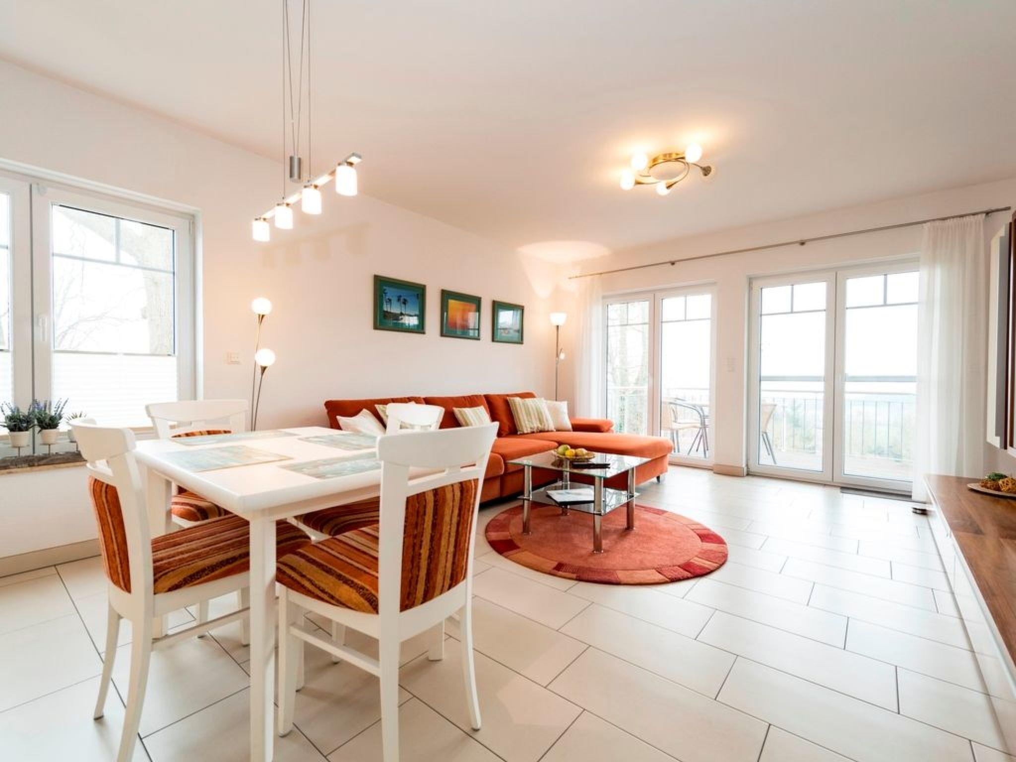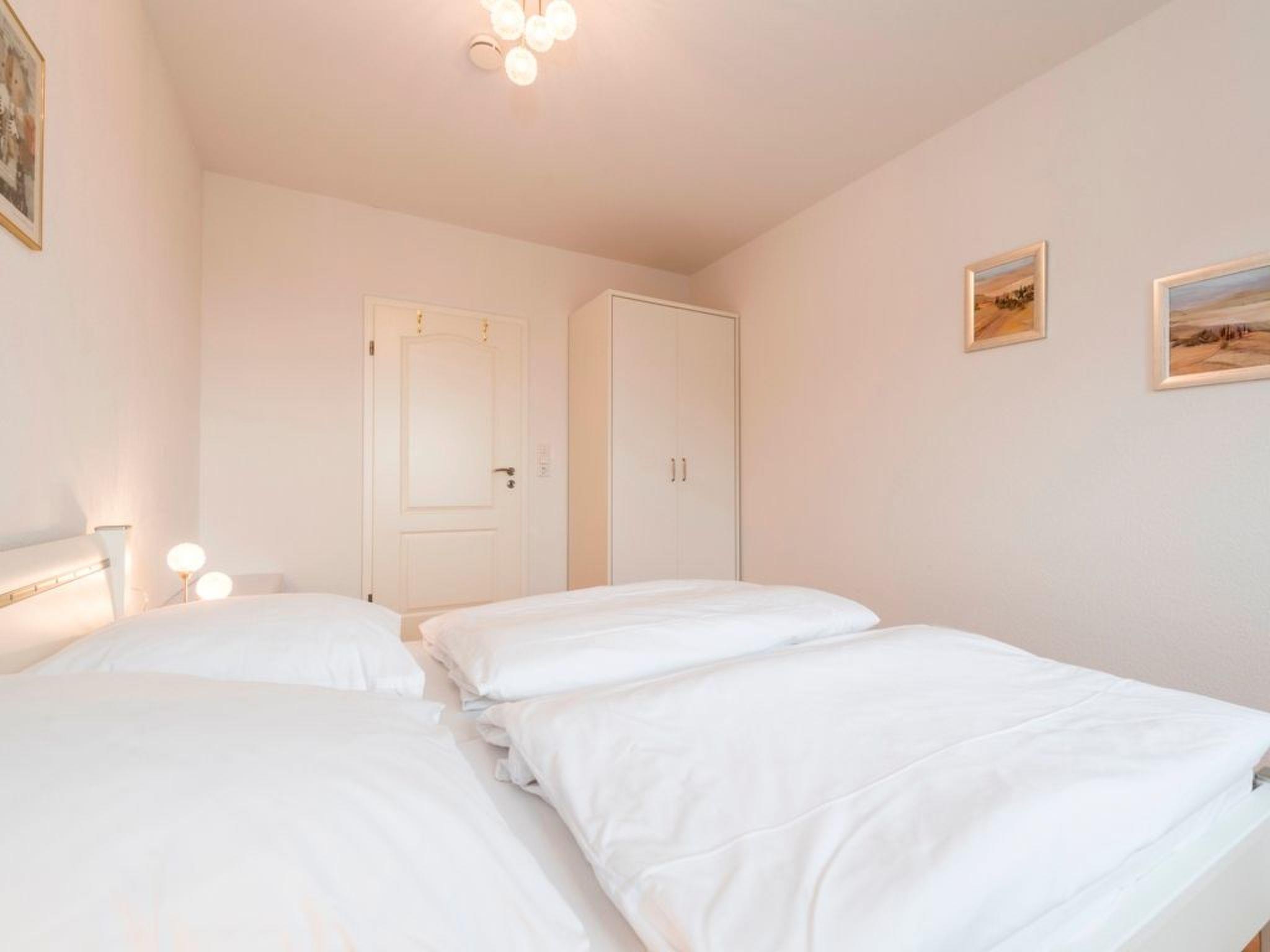 The generously proportioned 3-room flat is modern and furnished to a high standard and has a balcony with a wonderful view of Göhren's south beach. Bicycles can be stored outside the house in a bicycle shed. One free parking space per flat is available for each guest directly at the house. Free W-LAN available in the flat. Living space: 82 m² 3-room flat Large entrance area with cloakroom and shoe cupboard. Spacious living area with corner sofa and coffee table, sideboard with large flat-screen TV, CD radio system and dining table with 4 chairs. Fitted kitchen integrated into the living room, equipped with: 4-ring ceramic hob, large oven, extractor bonnet, microwave, large fridge with freezer compartment, dishwasher, toaster, coffee machine, kettle, blender and high-quality kitchen utensils. 2 bedrooms, each with a double bed (180 x 200 cm) and large wardrobe. One bedroom with flat-screen TV. 1 bathroom with large walk-in shower, 2 washbasins, WC and hairdryer. 1 balcony with garden furniture. The entire flat is equipped with underfloor heating. Non-smoking! (But you are welcome to smoke on the balcony).
