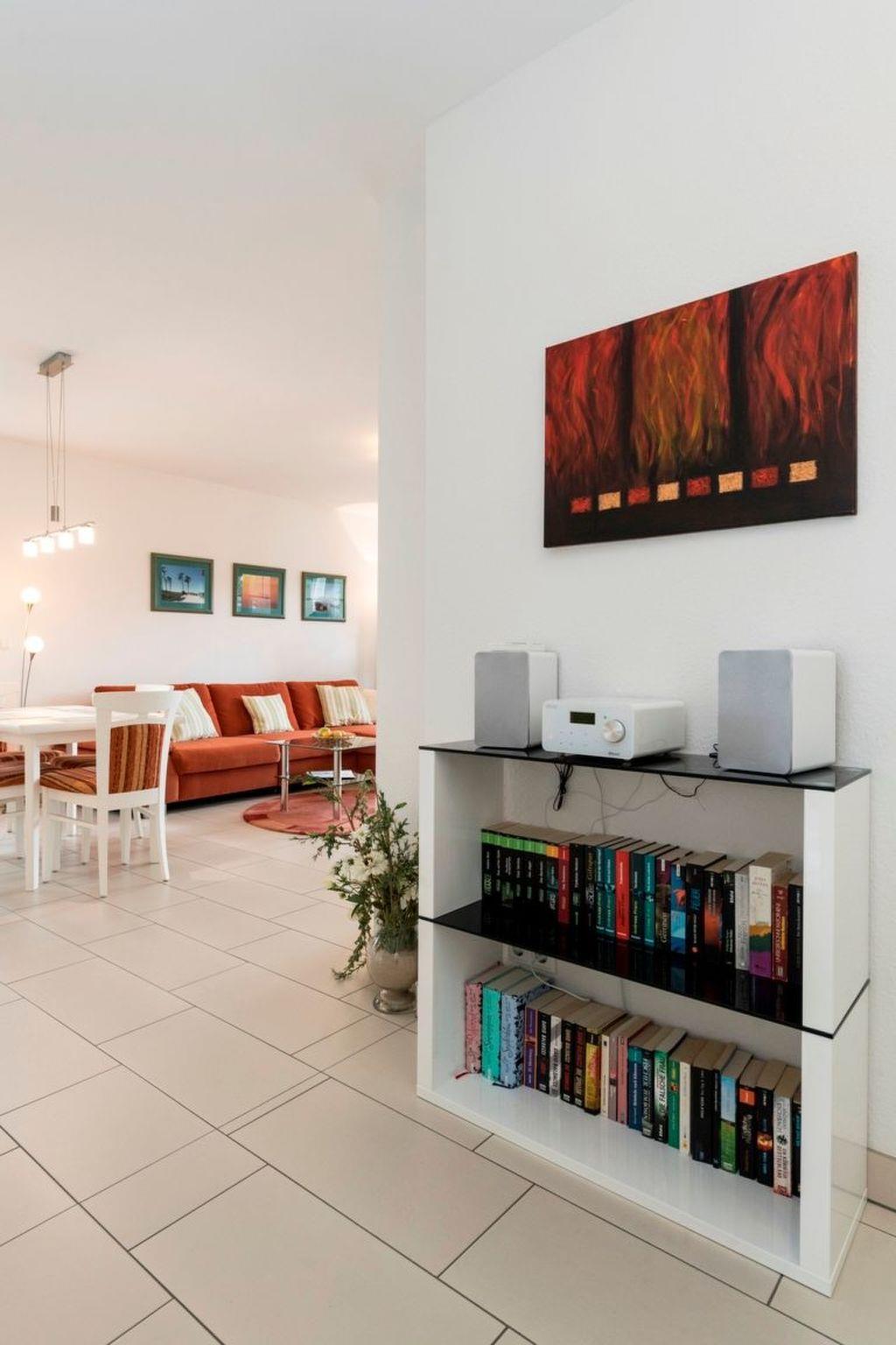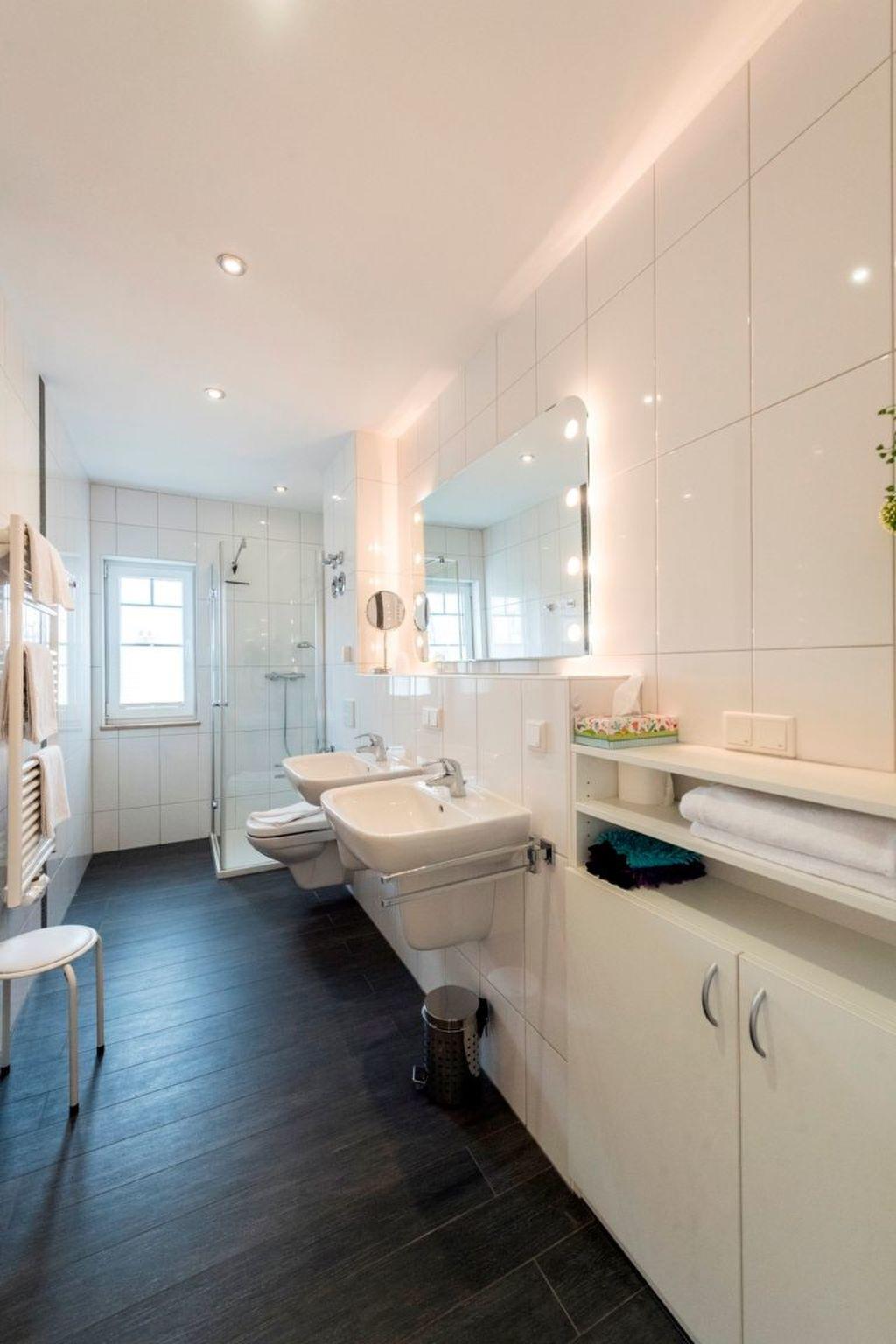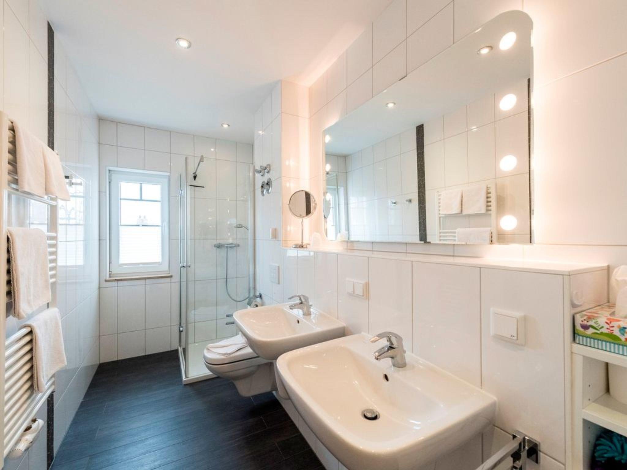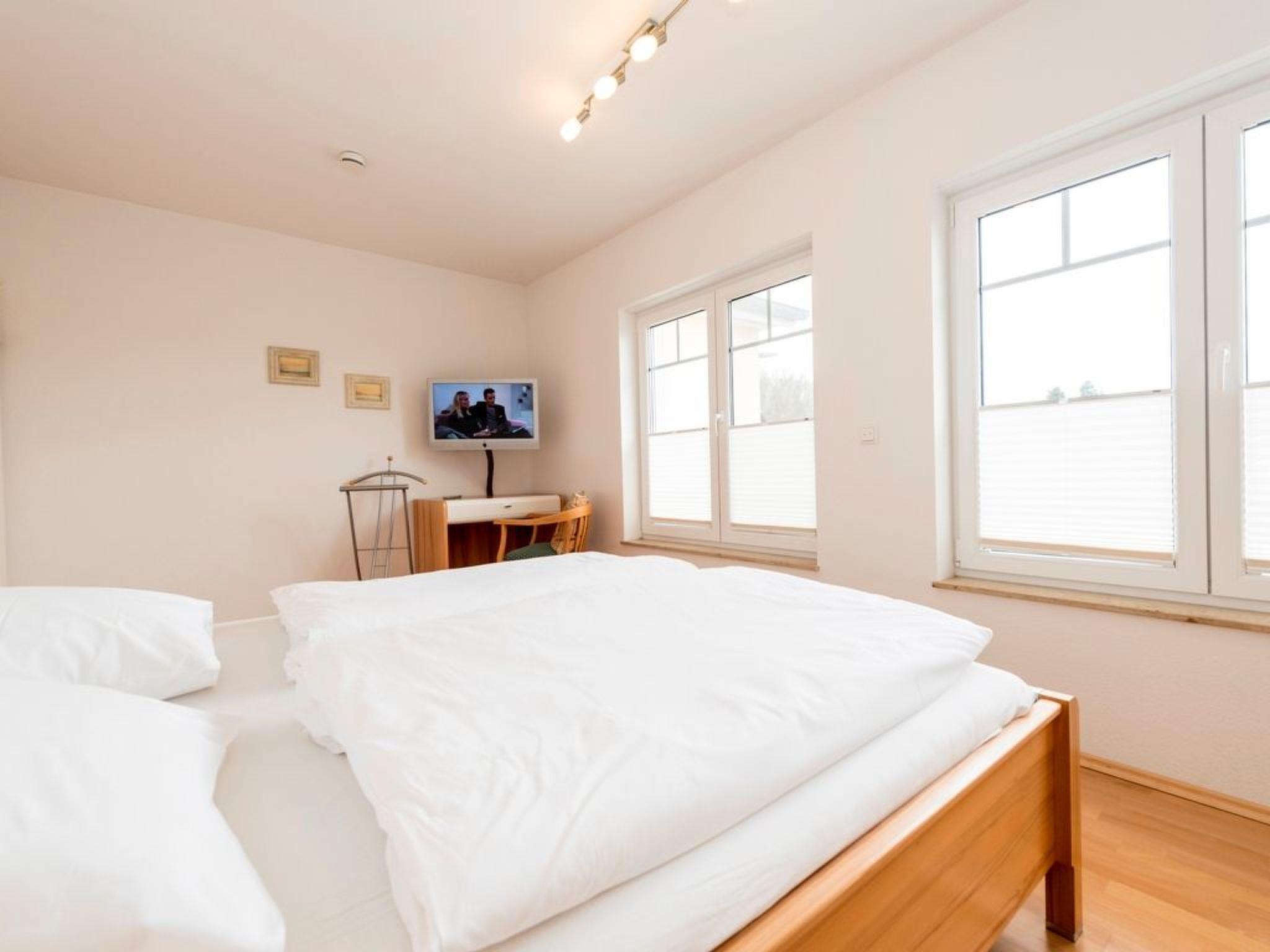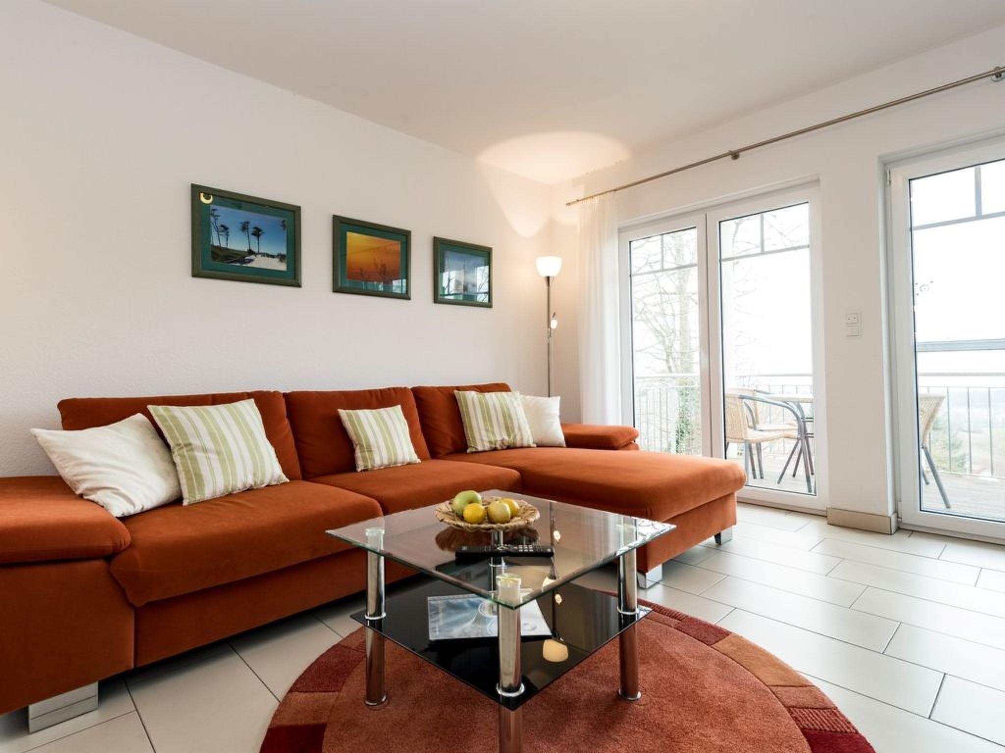 The generously proportioned 3-room flat is modern and furnished to a high standard and has a balcony with a wonderful view of Göhren's south beach. Bicycles can be stored outside the house in a bicycle shed. One free parking space per flat is available for each guest directly at the house. Free W-LAN available in the flat. Living space: 82 m² 3-room flat Large entrance area with cloakroom and shoe cupboard. Spacious living area with corner sofa and coffee table, sideboard with large flat-screen TV, CD radio system and dining table with 4 chairs. Fitted kitchen integrated into the living room, equipped with: 4-ring ceramic hob, large oven, extractor bonnet, microwave, large fridge with freezer compartment, dishwasher, toaster, coffee machine, kettle, blender and high-quality kitchen utensils. 2 bedrooms, each with a double bed (180 x 200 cm) and large wardrobe. One bedroom with flat-screen TV. 1 bathroom with large walk-in shower, 2 washbasins, WC and hairdryer. 1 balcony with garden furniture. The entire flat is equipped with underfloor heating. Non-smoking! (But you are welcome to smoke on the balcony).