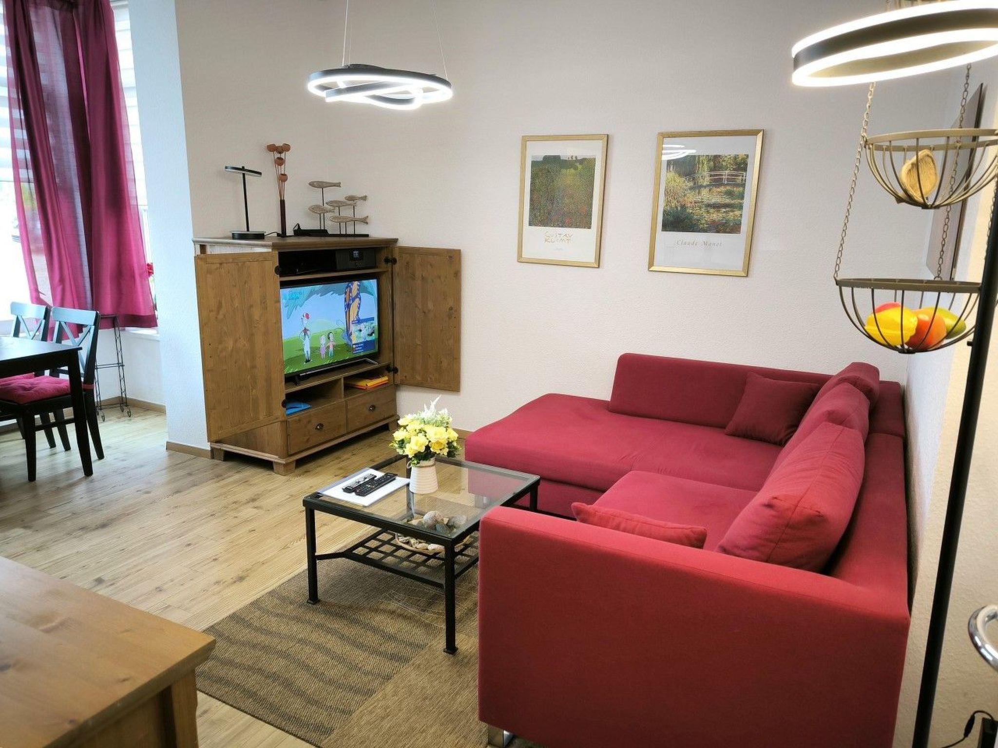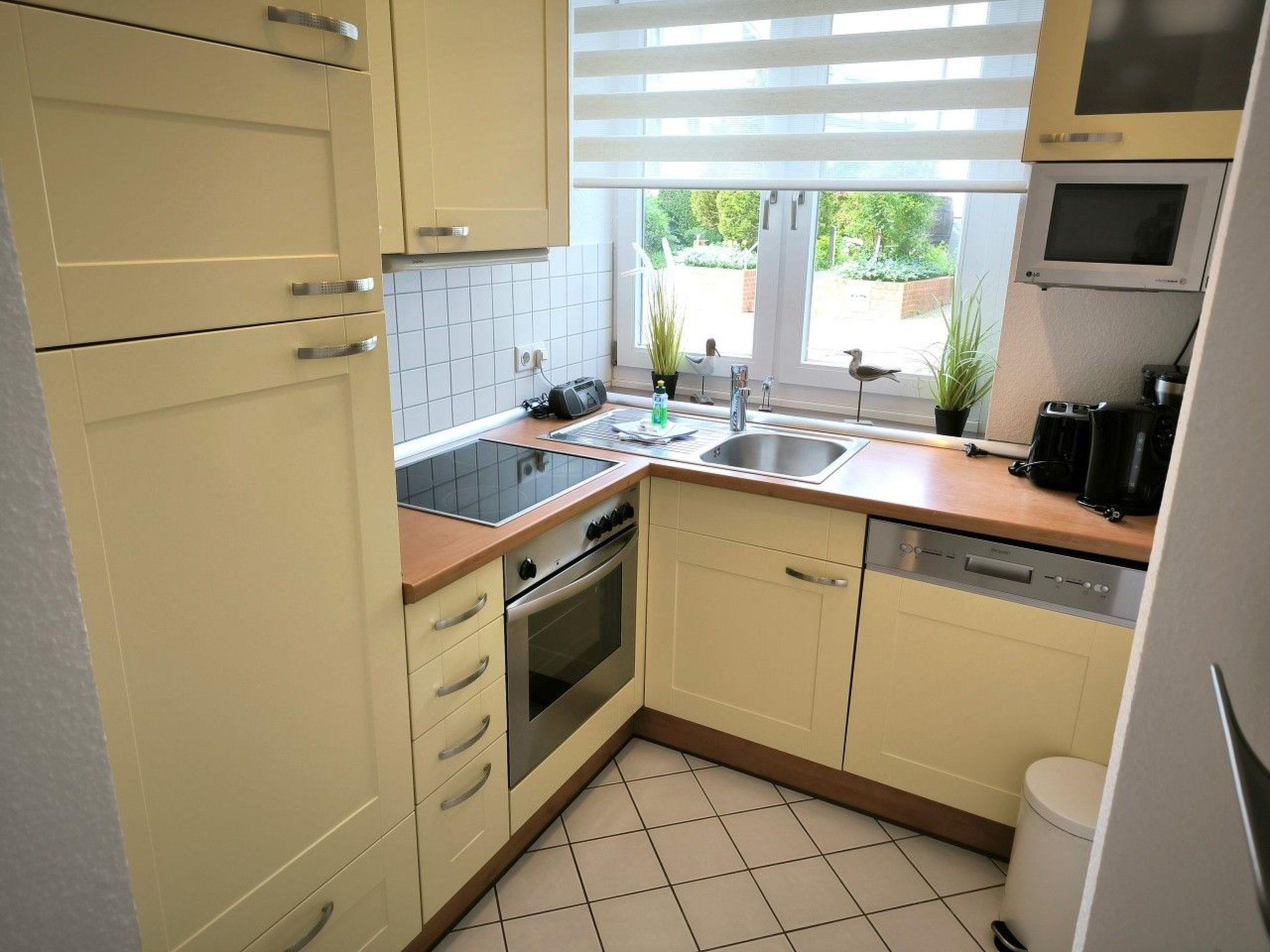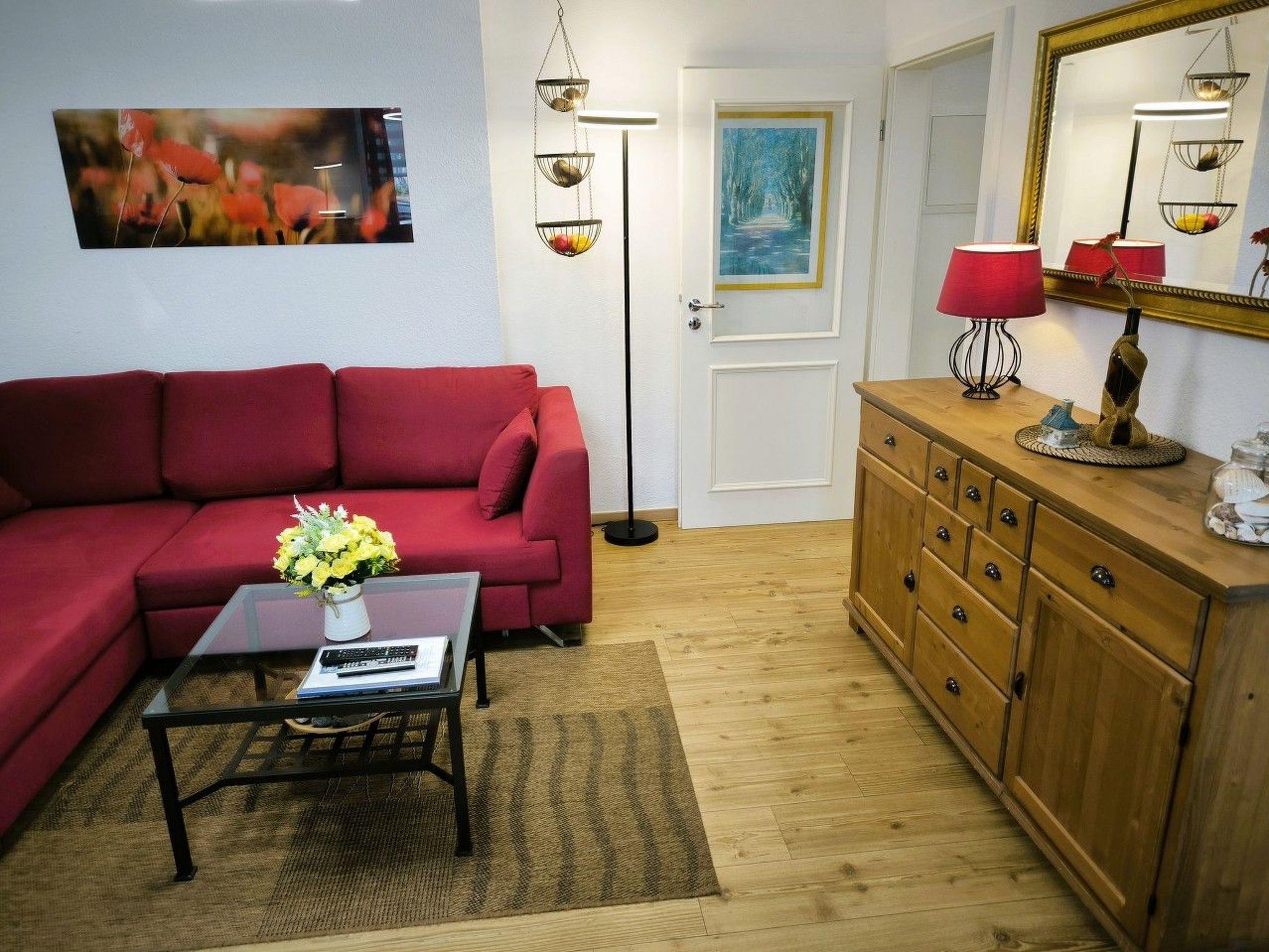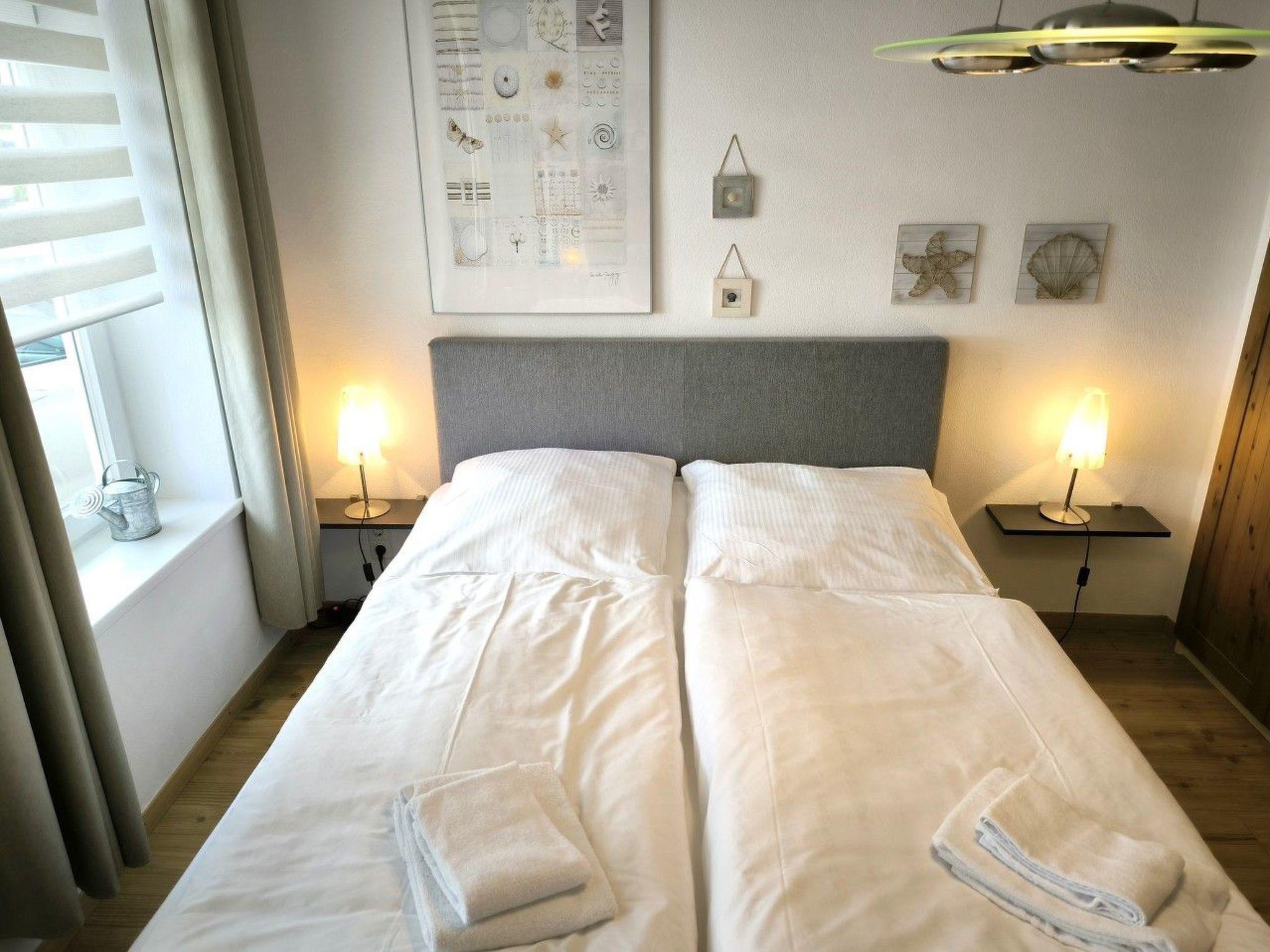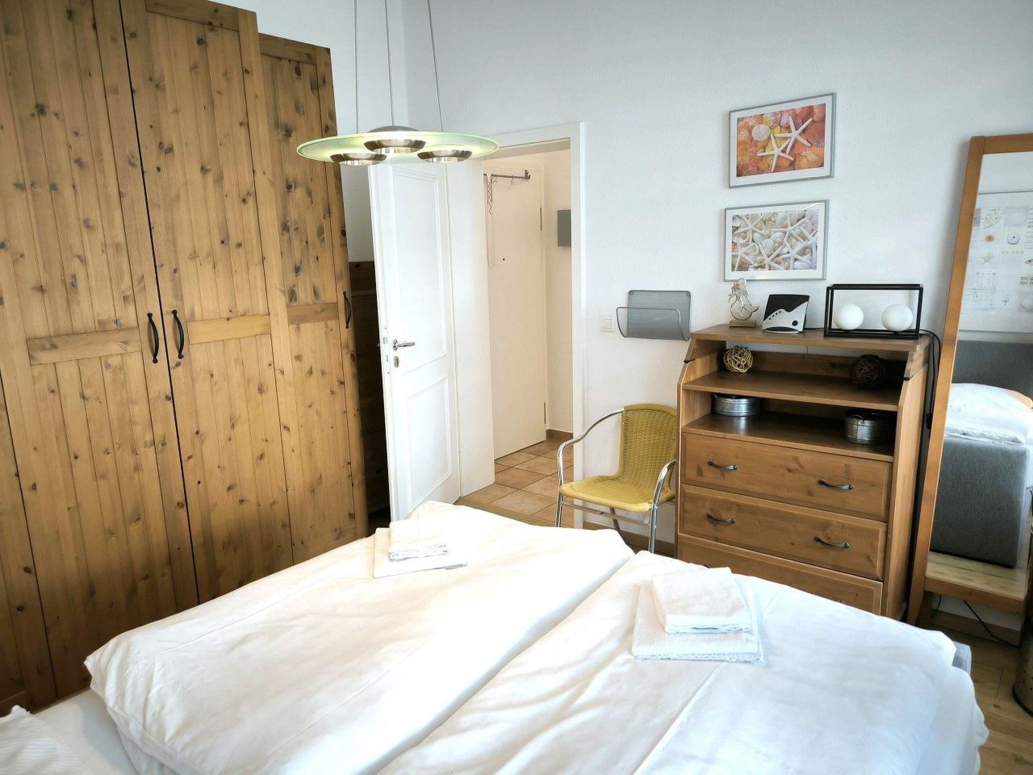 Living space: 45 m² for max. 4 persons. Entrance area. 1 living room with pull-out sofa bed for two people, 1 small coffee table, sideboard, TV cabinet with TV, DVD player and radio/CD system, 1 dining table with 4 chairs. Fitted kitchen separated from the living area, equipped with 4-ring ceramic hob and oven, extractor bonnet, large fridge with freezer compartment, sink, dishwasher, toaster, coffee machine, kettle, egg cooker, blender and various kitchen utensils. 1 bedroom with rattan bed (180 x 200 cm) and large wardrobe, shoe cabinet, standing mirror and chest of drawers with drawers and fold-out changing table and alarm clock radio. 1 bathroom with shower, WC and hairdryer. Free W-LAN!