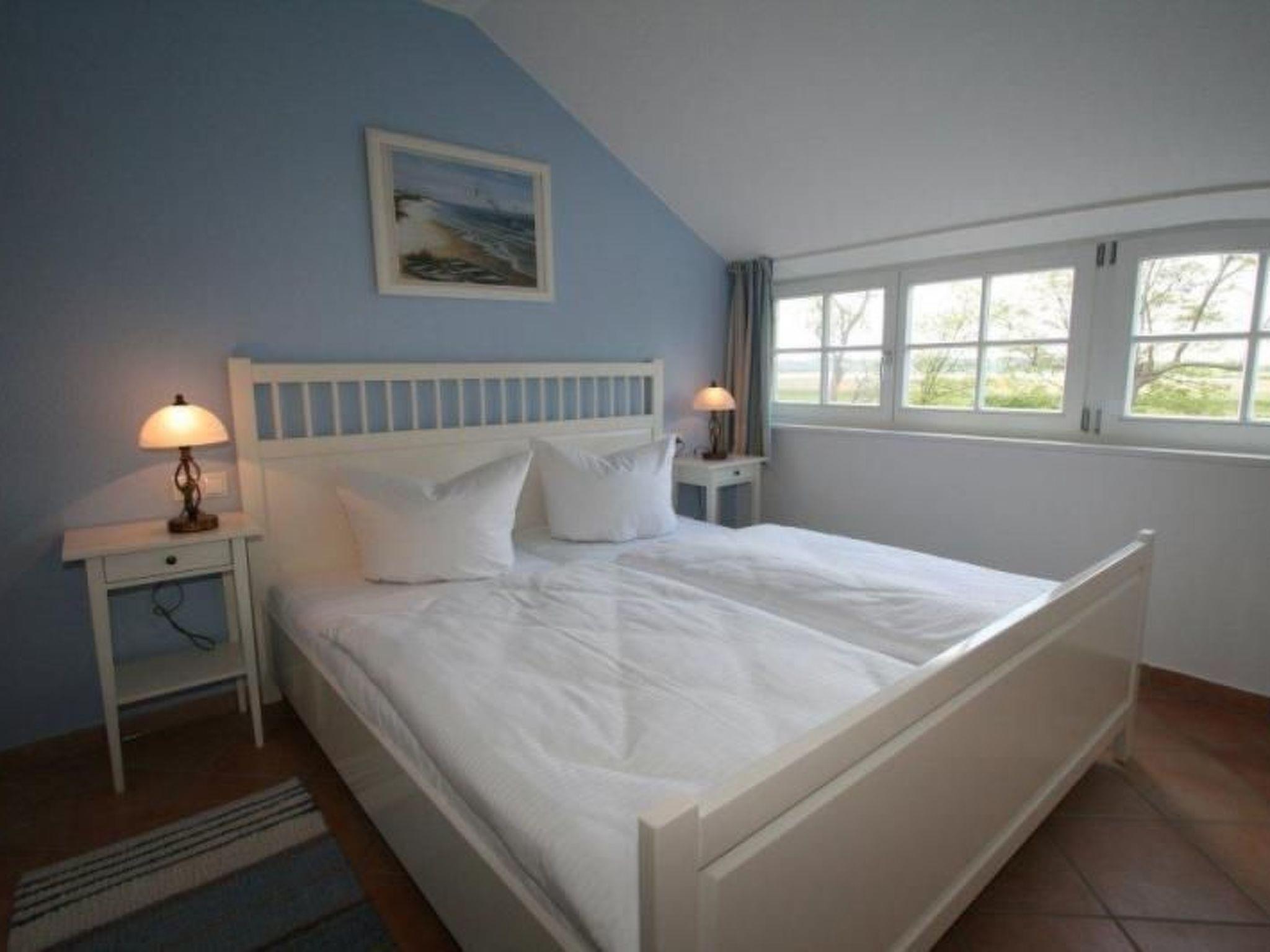The 83 m² holiday flat extends over two floors and offers the feeling of living in your own terraced house. The interior design is upscale and ideal for up to six people (four adults plus two small children). The spacious living area on the ground floor has numerous windows and a fireplace that invites you to cosy get-togethers. Enjoy the marvellous view of the idyllic Bodden landscape. A high-quality kitchen on the ground floor is ideal for dining or socialising. On the top floor there are two separate bedrooms, a modern shower room and a guest WC on the ground floor, which round off the living comfort.