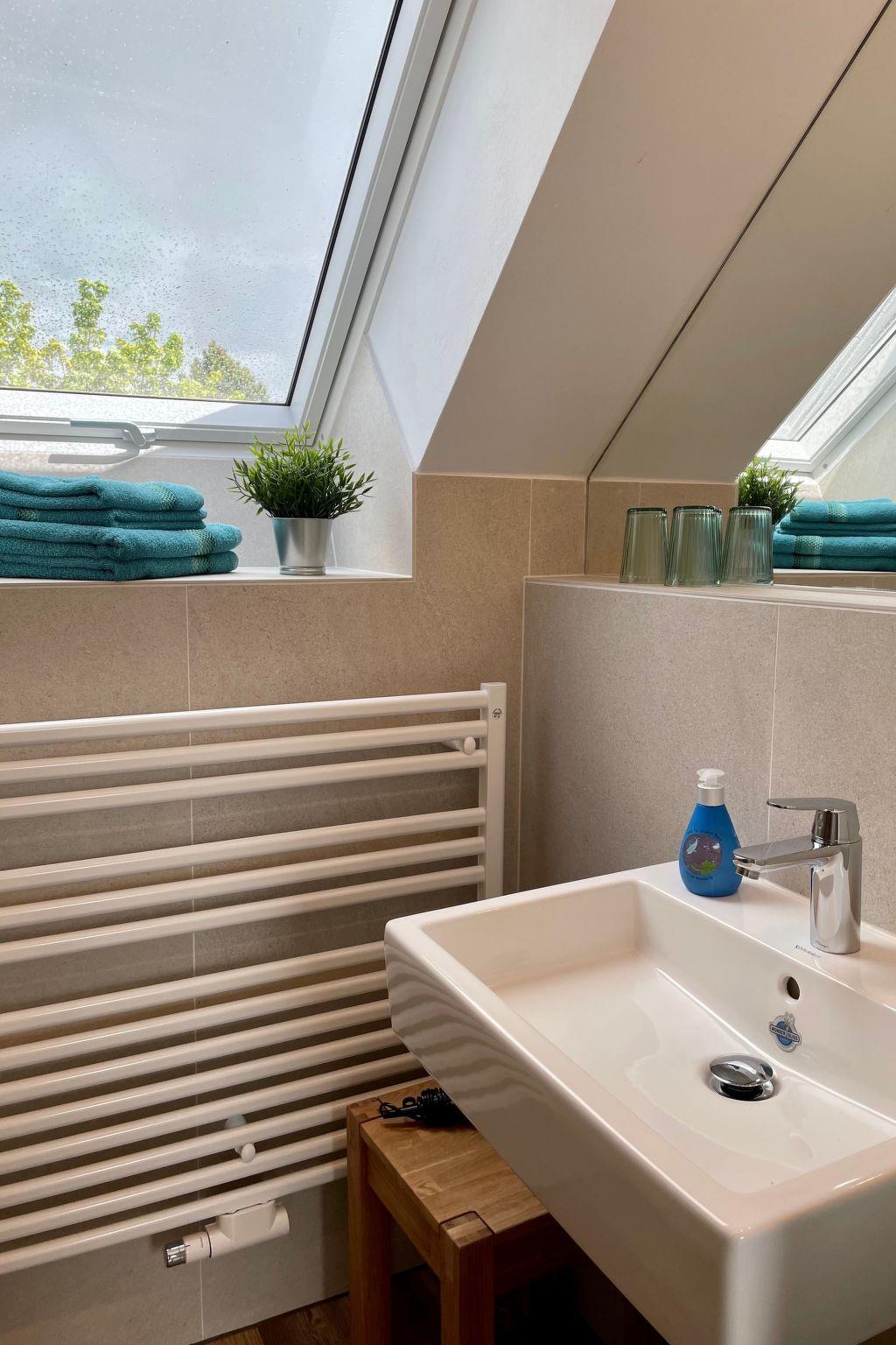 The 3-room maisonette flat has two bedrooms with king-size box-spring beds (1.80 m x 2.00 m), a living room with sofa set (sofa bed 1.40 m x 2.00 m), an integrated fitted kitchen, a dining area and two shower rooms. The fully equipped kitchen with dining area is integrated into the large living room. From here you have access to the balcony with a wonderful view of the countryside.