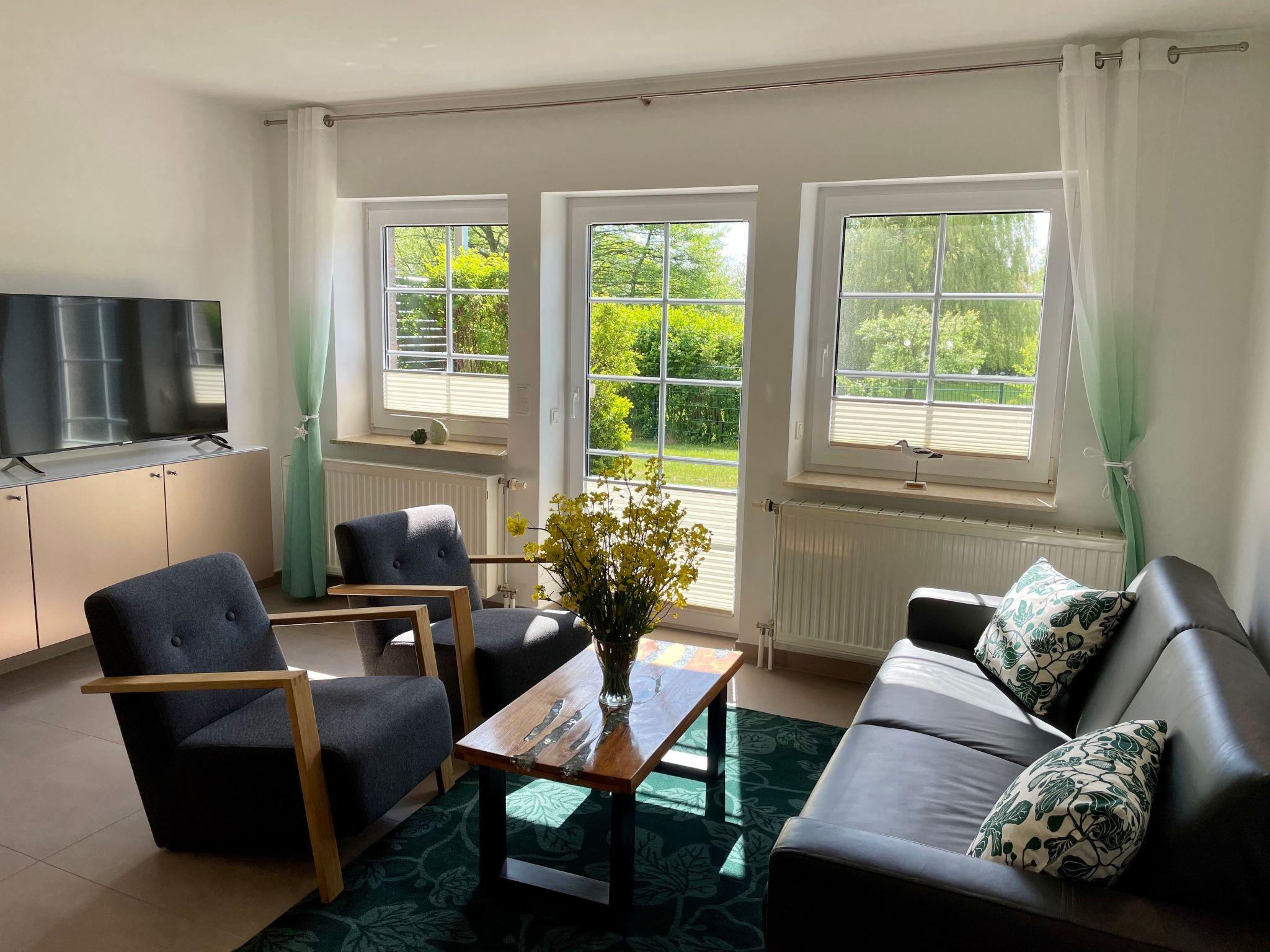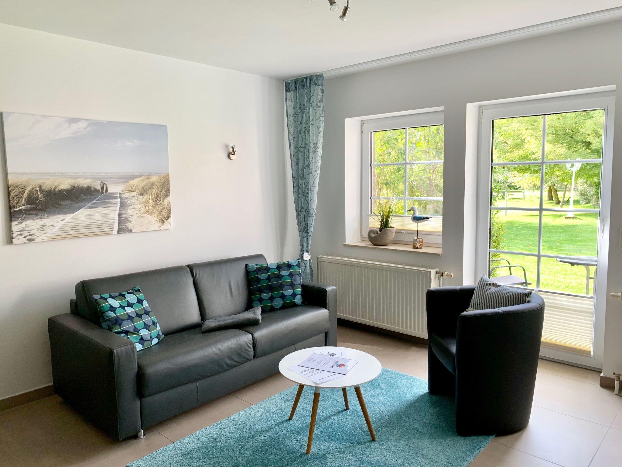 The 2-room flats have a bedroom with box-spring bed, a living room with sofa bed, an integrated fitted kitchen, a dining area, a shower room and a furnished terrace in the garden. All flats have smart TVs in the living room and bedrooms. Wi-Fi in the flats is free of charge. The fully equipped kitchen is integrated into the large living room. From here you have direct access to the sun terrace with garden furniture and a view of the salt marshes.