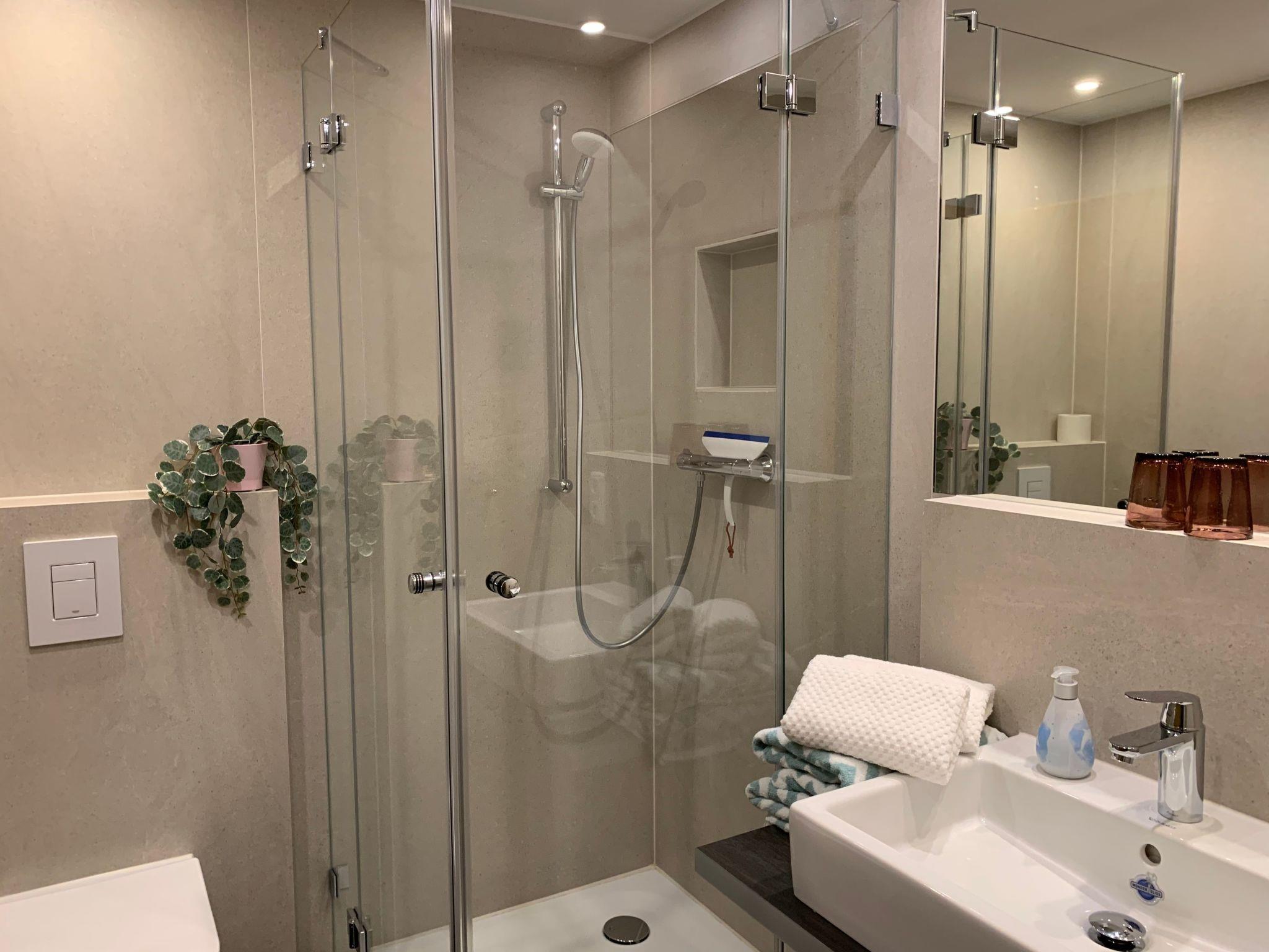 2-room flat for 2 to 3 people on the ground floor (approx. 49 sqm living space) The flat has a bedroom with a king-size box-spring bed, a living room with a sofa bed, an integrated fitted kitchen, a dining area, a bathroom with shower/WC, a safe, smart TVs in the living room and bedroom and a furnished terrace in the garden. The fully equipped kitchen with dining area is integrated into the large living room. From here you have direct access to the sun terrace with garden furniture. All our holiday flats are non-smoking flats.