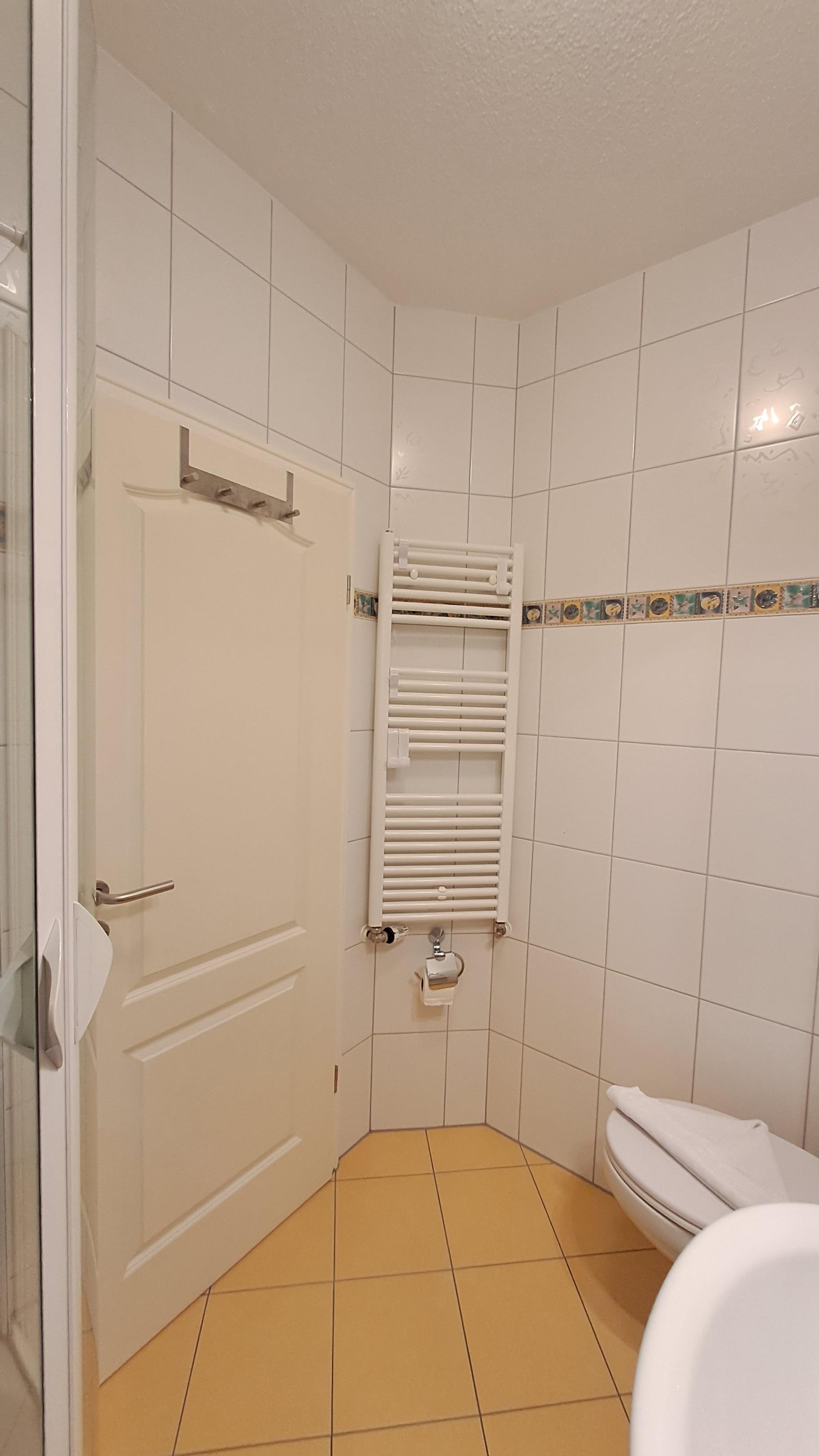 - innenliegend mit Dusche, Spiegelschrank, Waschbecken, Handtuchwärmer, WC und kleinem Regal