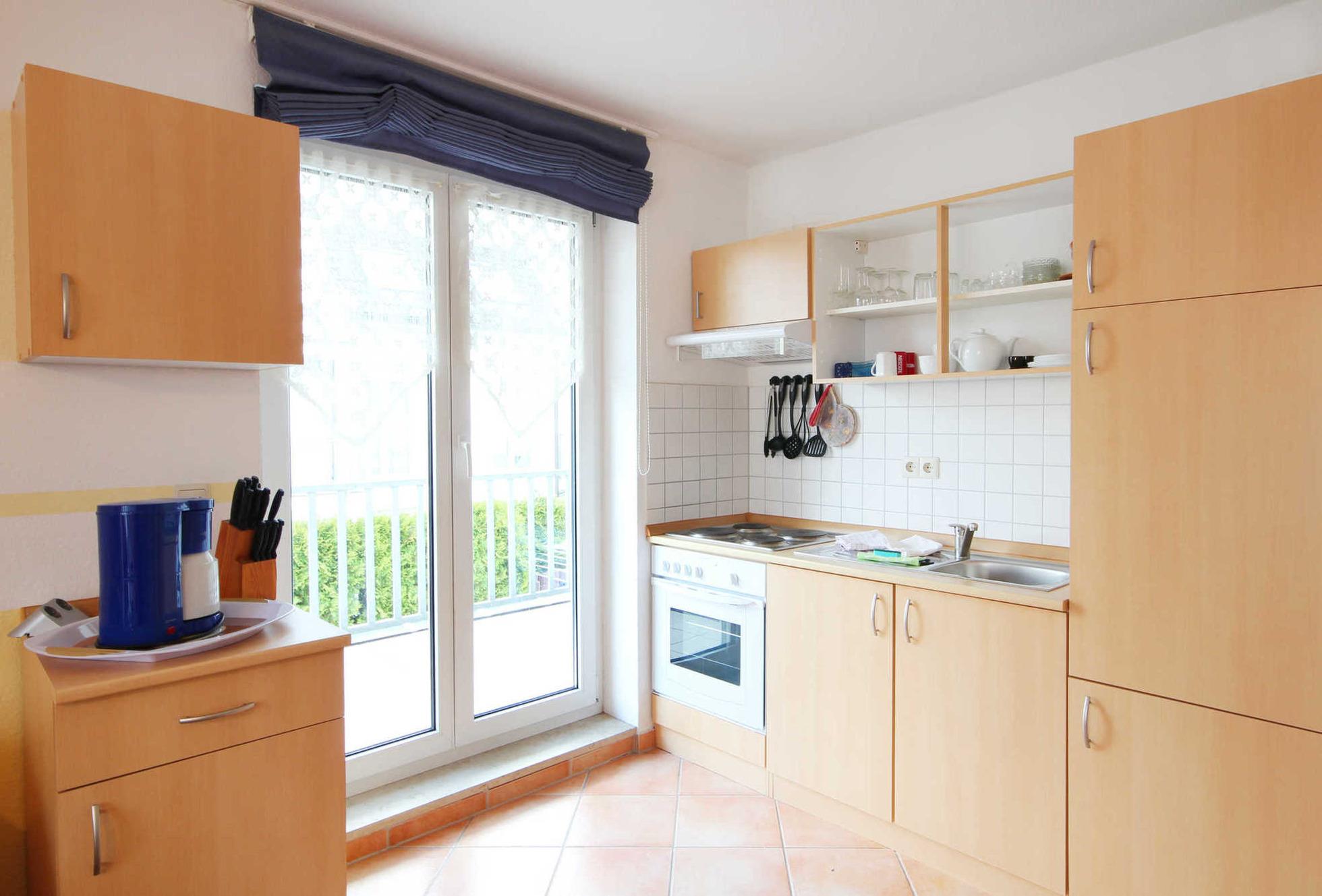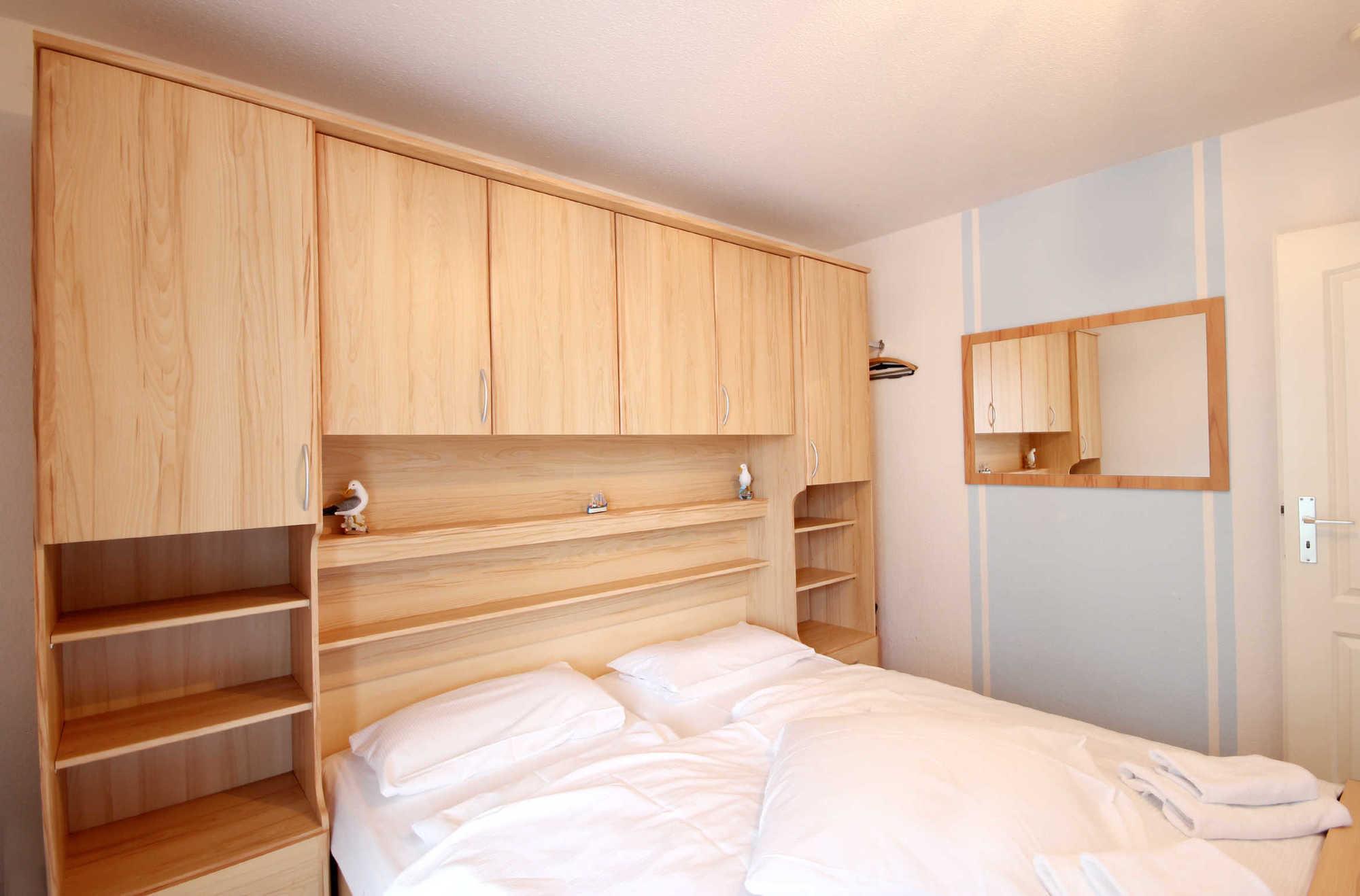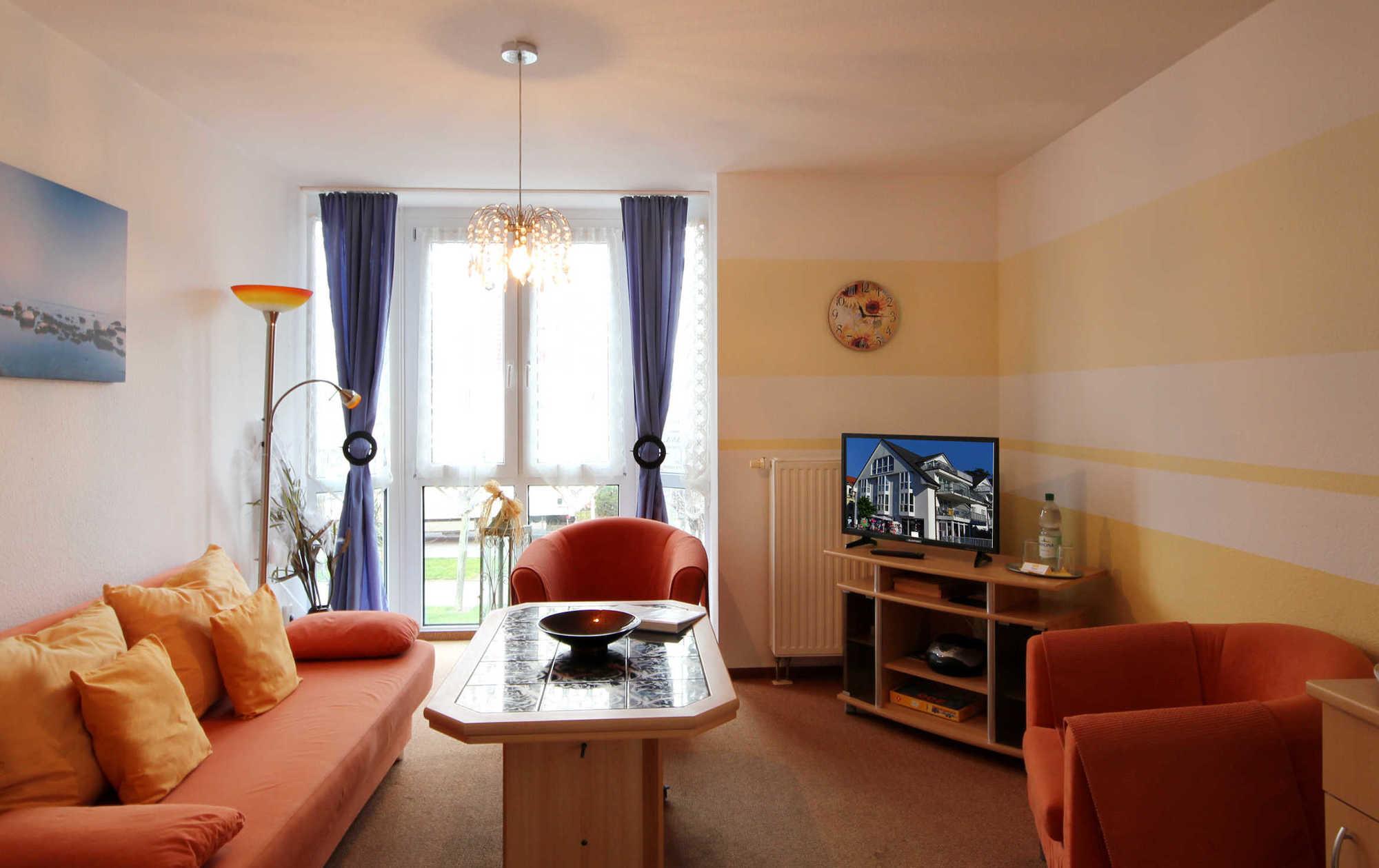 Ihre 2-Zimmerwohnung 54RB7 (Nichtraucher) hat eine Größe von ca. 41 qm und ist für bis zu 4 Personen eingerichtet. Sie befindet sich im 1. Obergeschoss und verfügt über einen großen Ostbalkon auf dem Sie bei Sonne frühstücken können und Blick auf die Flaniermeile des Ortes haben. Die Wohnung teilt sich auf in Wohnraum mit kompletter Küchenzeile, Bad, Balkon und einen Schlafraum. Im Wohnbereich finden Sie ein Flachbild-TV, Radio / CD-Player und ein Schlafsofa, welches eine Schlafgelegenheit für die 3. und 4. Person bietet. Im Schlafraum gibt es ein Doppelbett mit integriertem Schrank, der Ihnen genug Stauraum bietet. Das Badezimmer verfügt über ein Fenster, Waschtisch, Dusche, Handtuchheiztrockner und WC. Die Küchenzeile ist mit 4-Platte-Kochfeld, Backofen, Kühlschrank, Kaffeemaschine, Toaster und diversen kleinen Küchenhelfern ausgestattet. Von der Küche / Wohnbereich und dem Schlafzimmer aus haben Sie direkten Zugang zu dem Balkon. Ein wohnungseigener Garagenstellplatz steht Ihnen zur Verfügung.