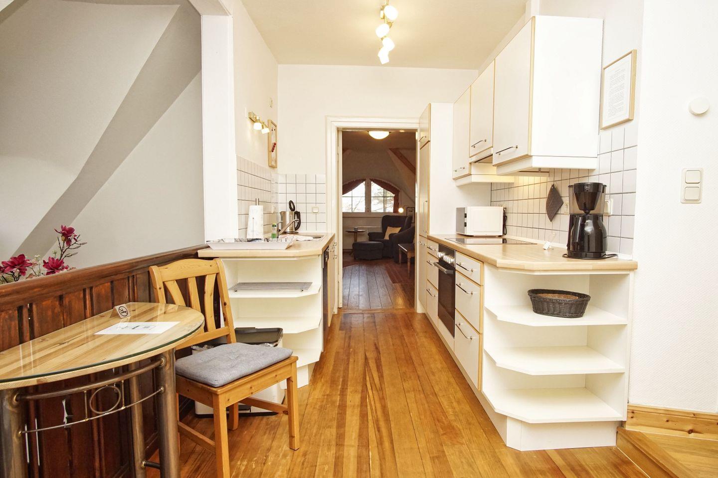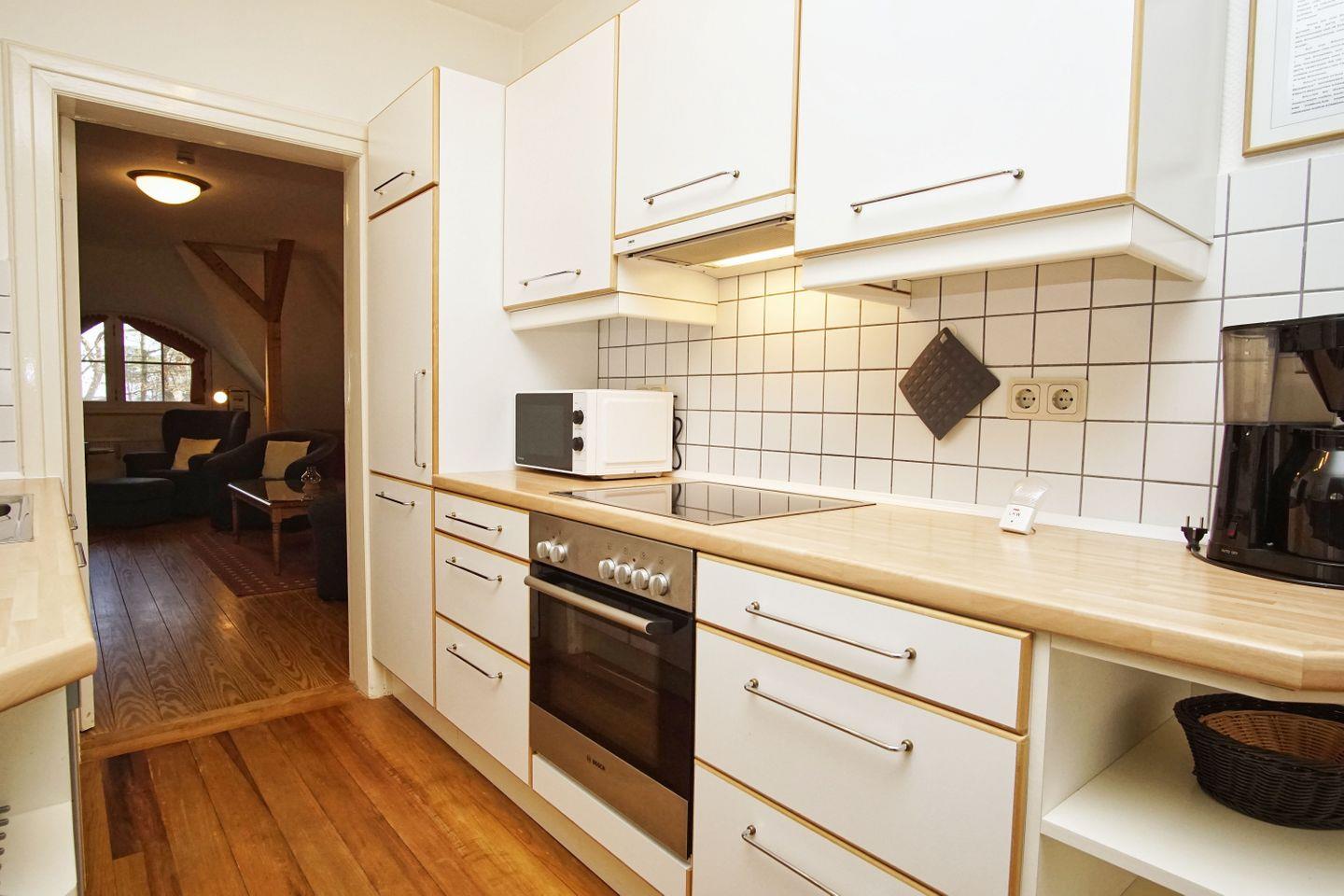 KÜCHE // separate Küche, Ceranfeld, Spülmaschine, Kühlschrank mit Gefrierfach, Mikrowelle, Kaffeemaschine, Toaster, Wasserkocher, reichlich Besteck sowie Geschirr und diverse Küchenutensilien ++