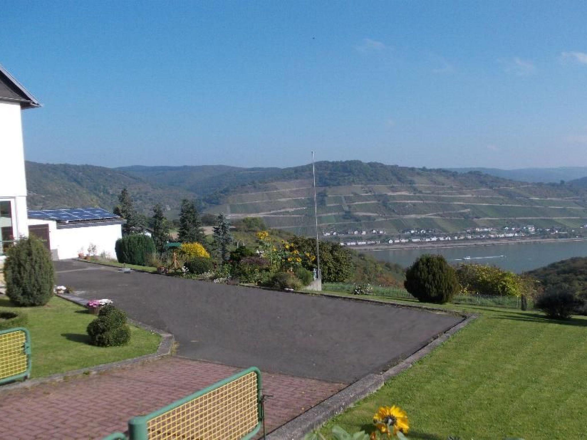 The flat has 2 terraces with garden furniture, one on the east side with a view of the Rhine and one on the west side, on a quiet local road. 1000m² of well-kept grounds with sunbathing lawn and barbecue facilities belong to the house. Enjoy the peace and quiet and the unique view of the Rhine, over the Rhine valley with the calmly flowing, mighty river and over the hills of the Taunus and Soonwald.