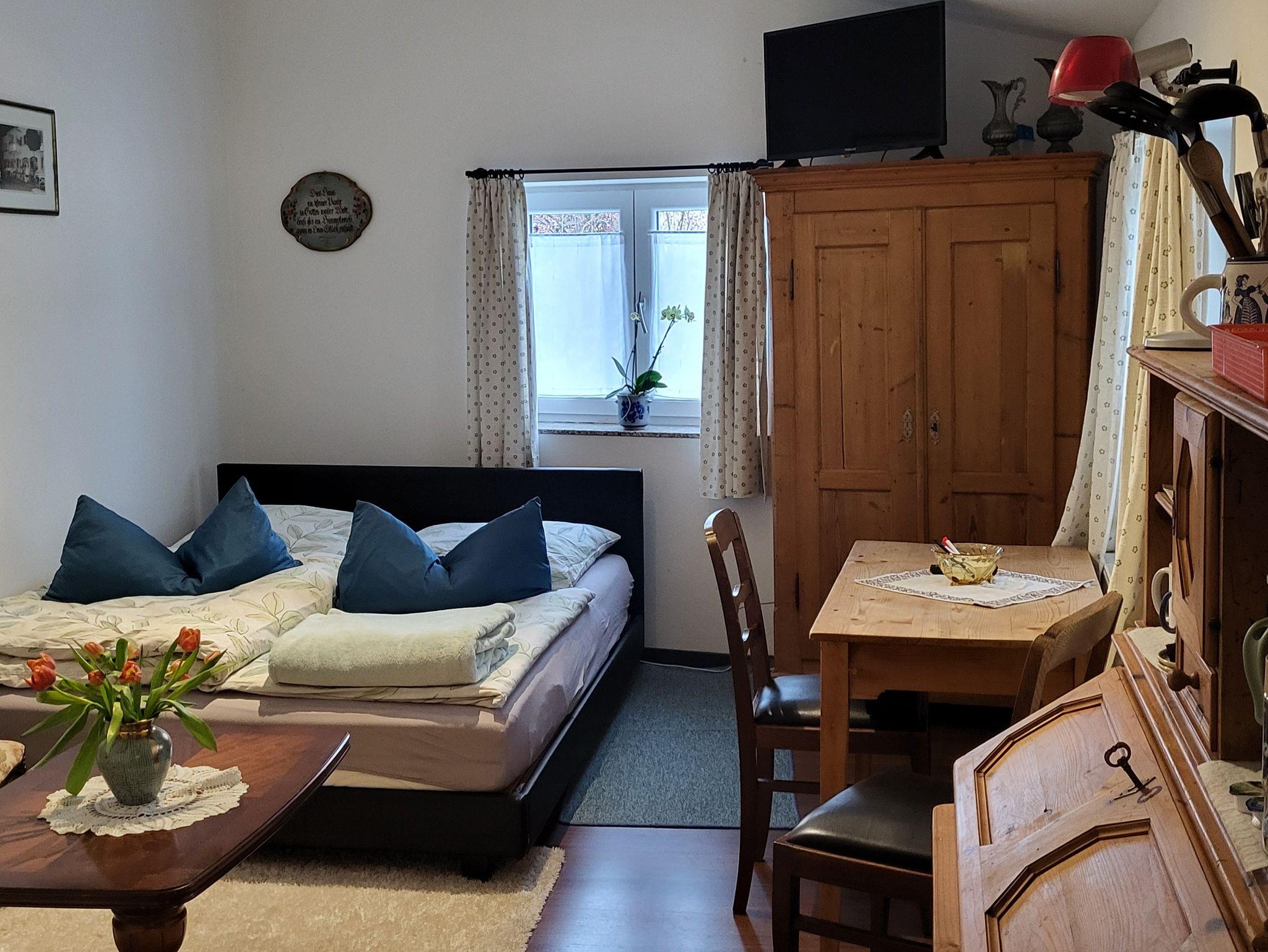 Das kleine, gemütliche Ein-Zimmer-Apartment mit Blick auf den Bach hat einen separaten Eingang im ersten Stock. Es hat eine gut ausgestattete Kochnische mit Kochplatten, Kühlschrank, Kaffeemaschine, Wasserkocher, einige Gewürze und Geschirr. Das moderne Badezimmer hat eine Dusche. Hier finden Sie Handtücher, Shampoo, Duschgel und Spülung. Das französische Bett ist 1,60 m x 2 m. Es gibt einen Flachbildschirm TV und gutes WLAN.