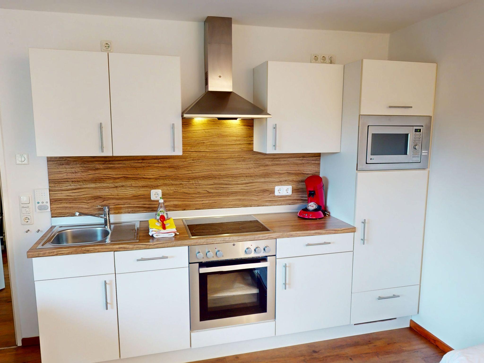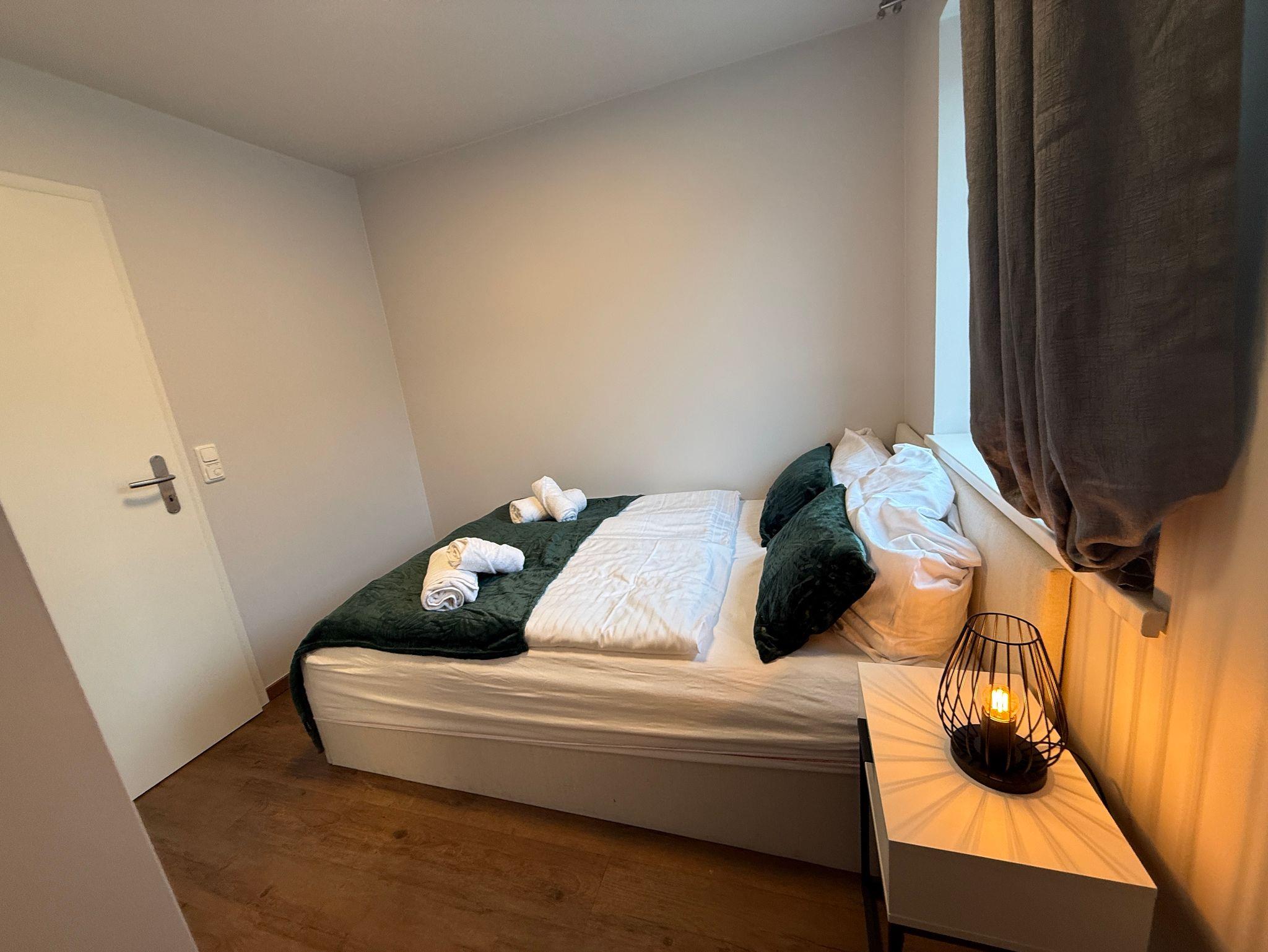 Diese komplett möblierte 1,5-Zimmer-Ferienwohnung im 1. OG bietet Platz für bis zu drei Personen und eignet sich für Singles oder Gäste, die getrennt schlafen möchten.
