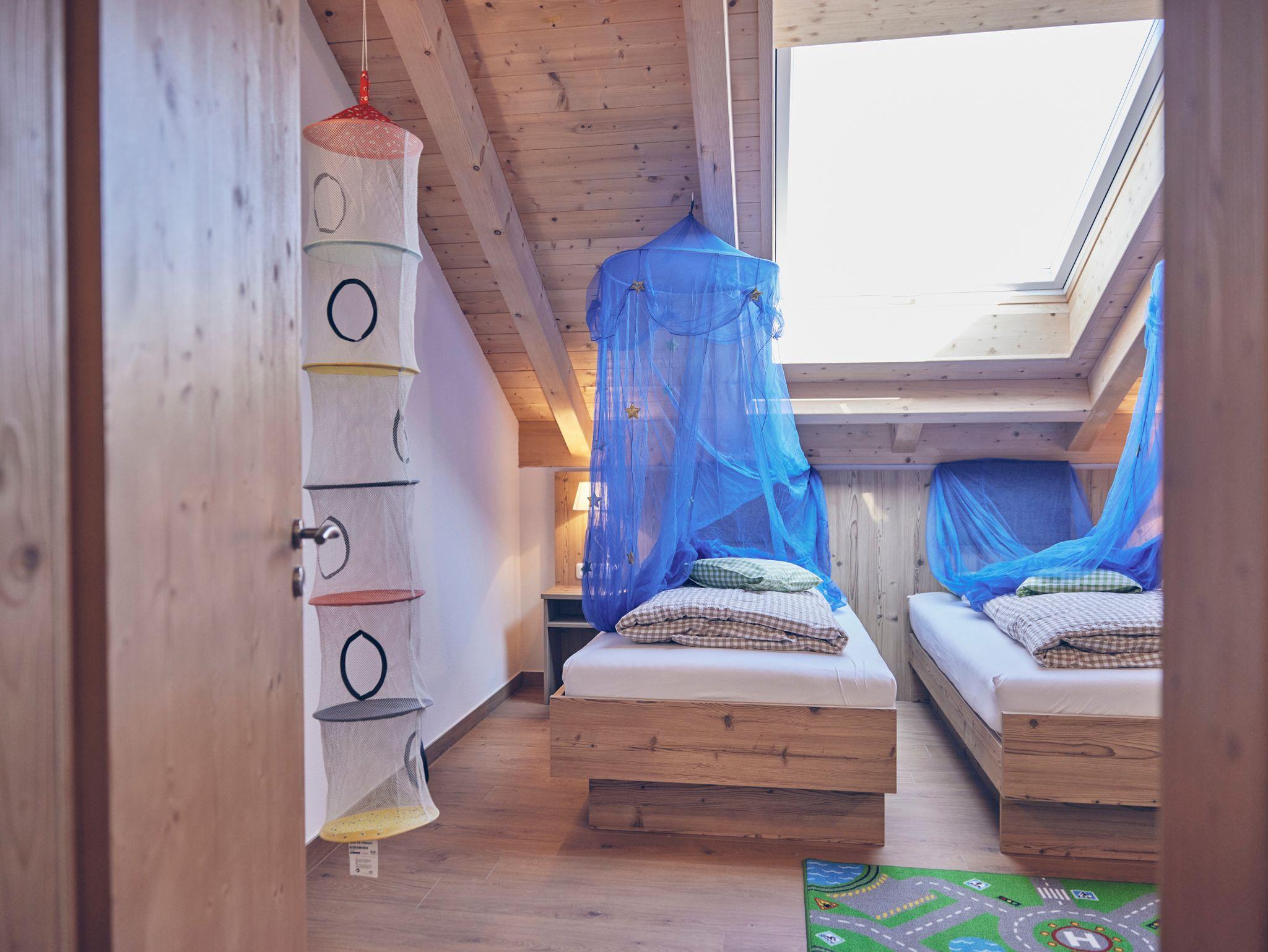 Die Ferienwohnung Kastanie ist 91m² groß. Der 8m² große Balkon mit Sitzgelegenheit gibt den unverbauten Blick nach Osten auf die Bergkette frei. Die Wohnung ist für 2 – 4 Personen geeignet. Im 22m² großen Elternschlafzimmer, ebenfalls mit begehbarem Schrank können Sie direkt auf den Balkon treten. Das Doppelbett ist 2 x 2 m groß. Hier könnte noch ein Kinderbettchen untergebracht werden. Die 37m² große Wohnküche ist ebenso mit sichtbarem Dachstuhl vollständig ausgestattet. Die Essecke mit Eckbank und zwei Sofas laden zum Lesen, Ausruhen und Verweilen ein. Das Bad besitzt eine Dusche mit Glasabtrennung und Handtücher und Fön. Die Kinder „schlafen unter dem Sternenhimmel“ mit Betthimmel in 1 x 2 m großen Betten. Die Ferienwohnung ist nach der 90jährigen Kastanie benannt.