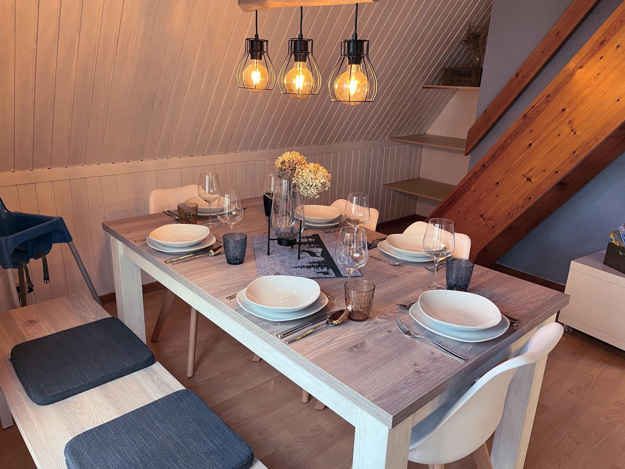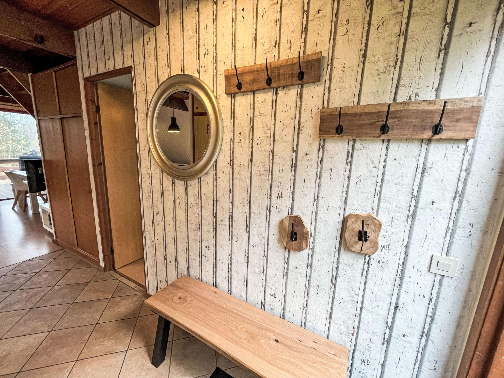 4-room house 70 m2 on 2 levels. Simple and cosy furnishings: living/dining room with cable TV and flat screen. Exit to the terrace. 1 room with 1 double bed (180 cm, length 200 cm), cable TV (flat screen). Open kitchen (4 hot plates, oven, dishwasher, toaster, kettle, microwave, freezer, electric coffee machine). Bath/WC. Upper floor: (steep stair), 1 room with sloping ceilings with 2 beds (90 cm, length 200 cm). 1 room with sloping ceilings with 2 beds (90 cm, length 200 cm). Gas heating. Wooden floors. Terrace 30 m2. Terrace furniture, electric barbecue (portable), deck chairs (2). View of the forest. Facilities: children's high chair, baby cot. Internet (WiFi, free). Please note: non-smoking house. Maximum 2 pets/ dogs allowed. Smoke alarm. Mini golf clubs and balls available. Bookings accepted for holiday purposes only.