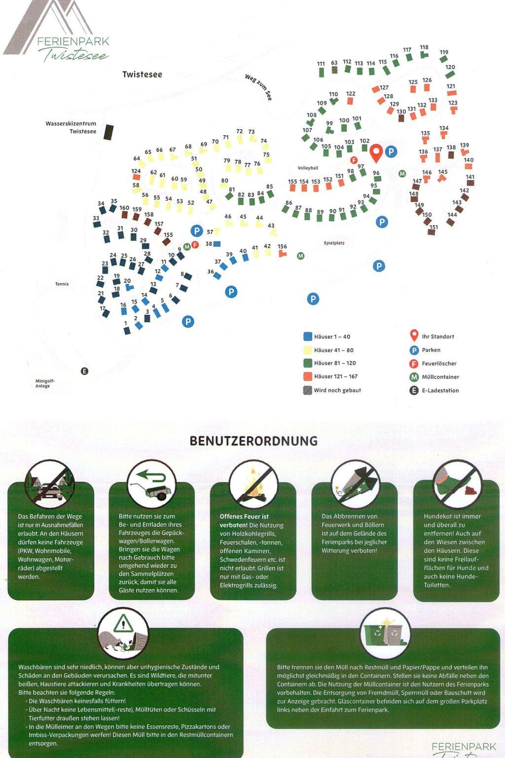 Holiday park: Speed limit of 20 or 30 km/h. Cars are not allowed to drive to the individual holiday homes. Larger communal car parks or individual parking spaces are located in the immediate vicinity of the holiday homes. There are special luggage trolleys for transporting luggage. Waste stations are located near the car parks. Unfortunately there are no glass containers. Dogs should be kept on a lead in the holiday park and dog faeces should be collected in special plastic bags. The main paths are also lit at night with lanterns. Nevertheless, it is advisable not to let children walk alone after dark.