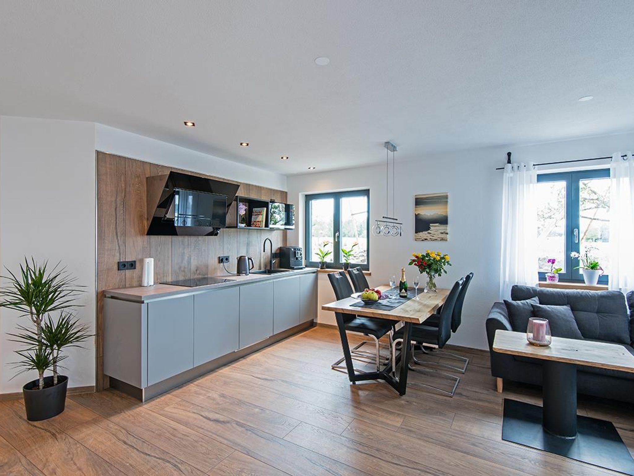 Die Ferienwohnung befindet sich im Erdgeschoss. Der Eingangsbereich besteht aus einem urigen sowie modernen open Space Bereich mit Wohnlandschaft sowie Essecke und einer modernen und voll ausgestatteten Einbauküche.