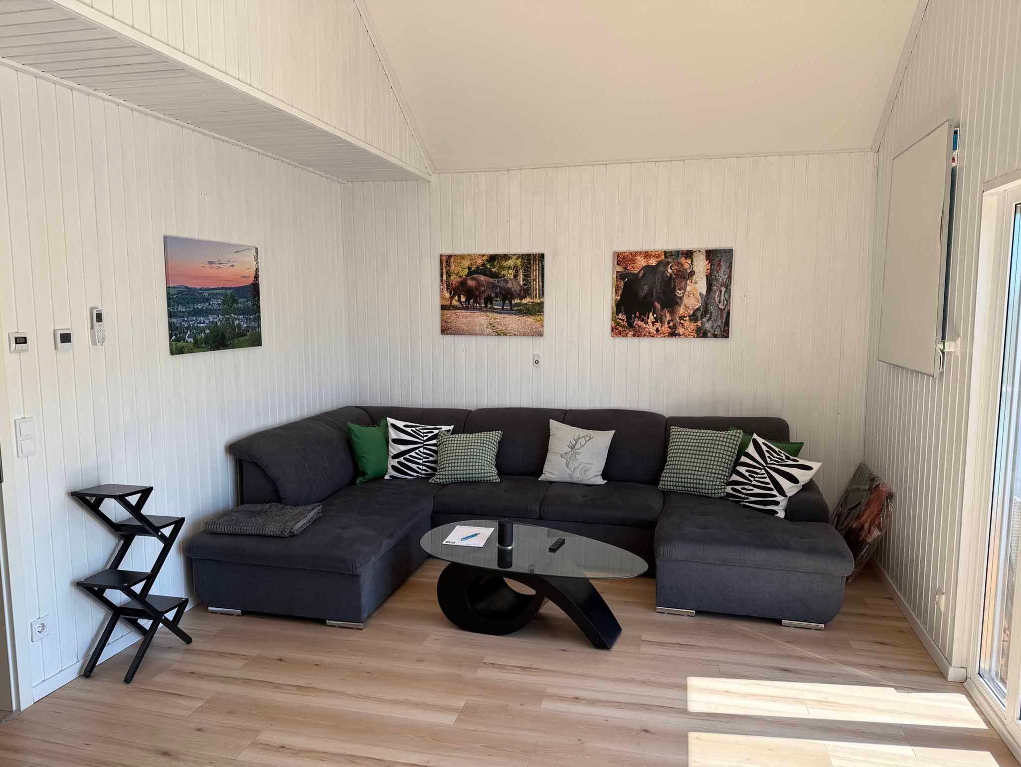 -Im Obergeschoss befindet sich ein großzügiges Wohnzimmer mit einem 75-Zoll-Smart-TV (alle Programme in HD), einer komfortablen Sofalandschaft mit zusätzlicher Schlafmöglichkeit sowie zwei gemütlichen Ohrensesseln, einer Fußbodenheizung und einer Klimaanlage. Große Panoramafenster eröffnen den Zugang zum Balkon und lassen viel Licht herein.