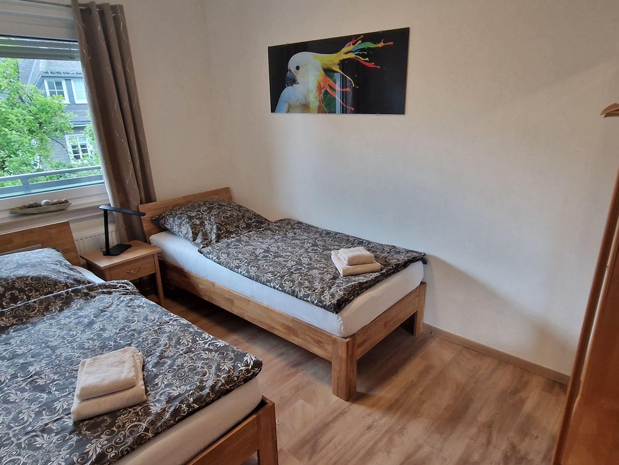 Unsere Ferienwohnung mit 80m² Wohnfläche bietet Platz für 1-4 Personen. Das gemütliche Wohnzimmer mit Schlafsofa und TV lädt zum Verweilen ein. Die moderne, komplett ausgestattete Küche mit Geschirrspüler, Kühlschrank inkl. Gefrierschrank, Herd, Backofen, Mikrowelle, Wasserkocher, Toaster und Filter-Kaffeemaschine lässt keine Wünsche offen. Die Ferienwohnung verfügt über 2 Schlafzimmer. Ein Schlafzimmer ist mit einem Doppelbett ausgestattet. Im zweiten Schlafzimmer befinden sich zwei Einzelbetten. Das Badezimmer mit Dusche, WC, Föhn und Handtuchtrockner rundet das Gesamtbild ab. Vor allem im Sommer können Sie entspannte Abende auf dem Balkon verbringen. Bitte beachten Sie, dass keine Haustiere erlaubt sind. Das WLAN und den Parkplatz vor dem Haus können Sie kostenfrei nutzen.